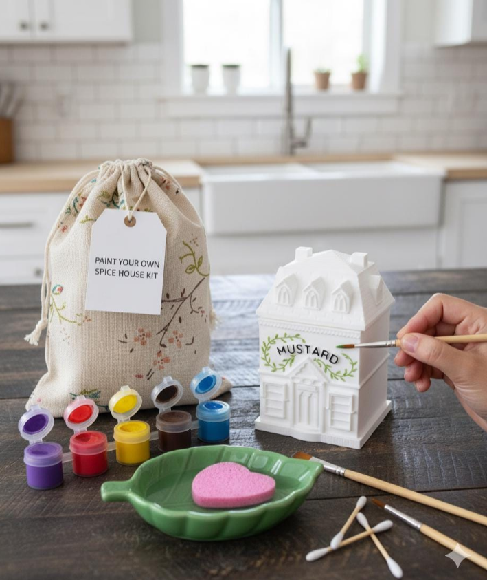Everything you need for a creative project, packed in a floral burlap gift bag. This Paint Your Own Spice House Kit lets you design a spice jar cottage with your own custom word — whether it’s a spice, a family name, or something fun and personal.