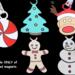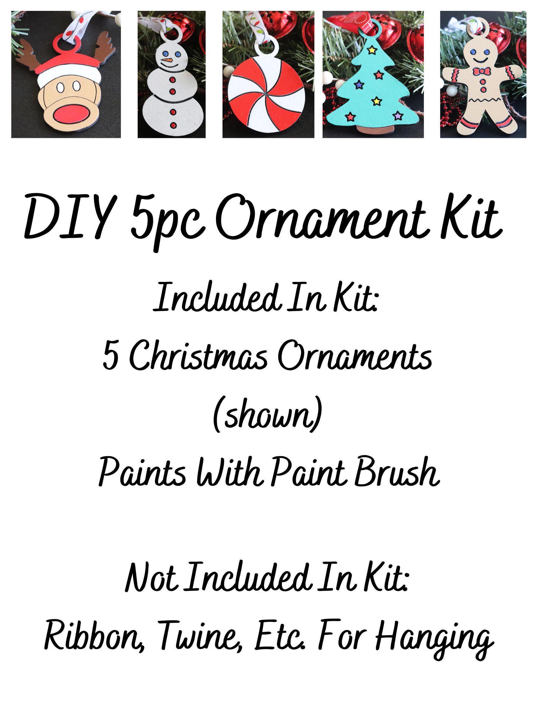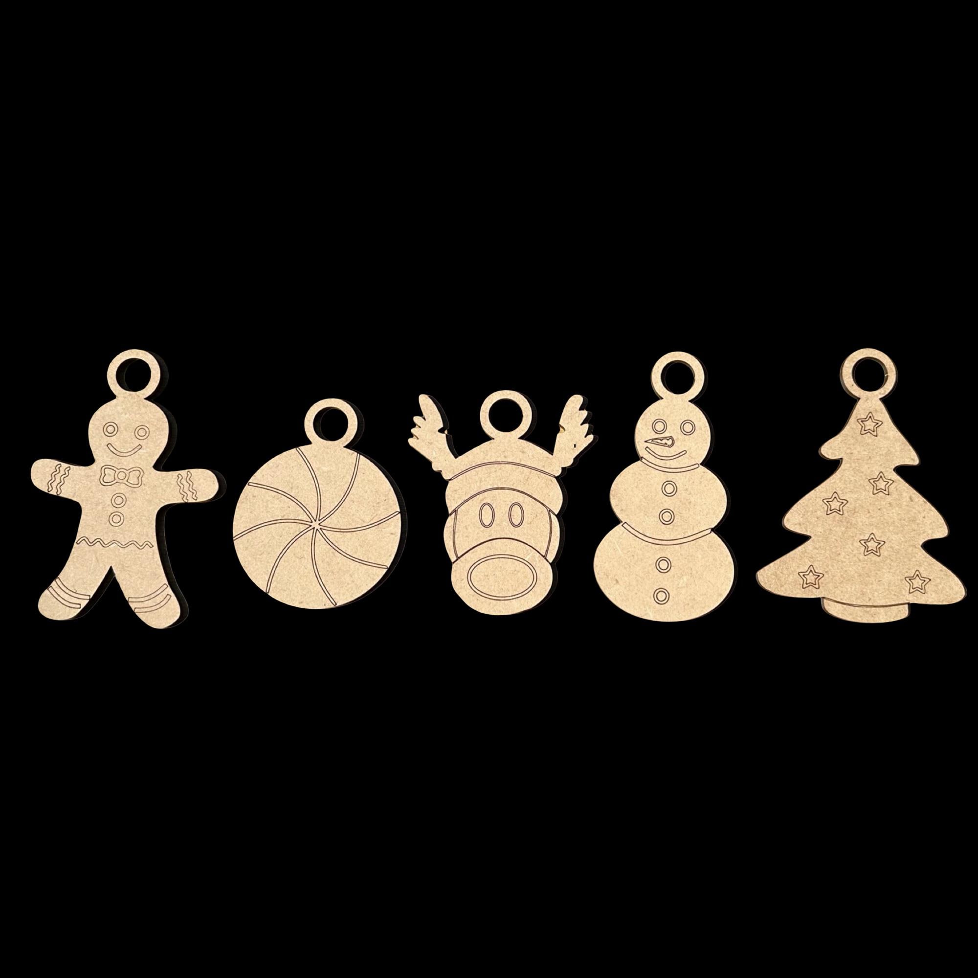 5 Christmas Ornaments (gingerbread man, peppermint candy, reindeer, snowman, tree)