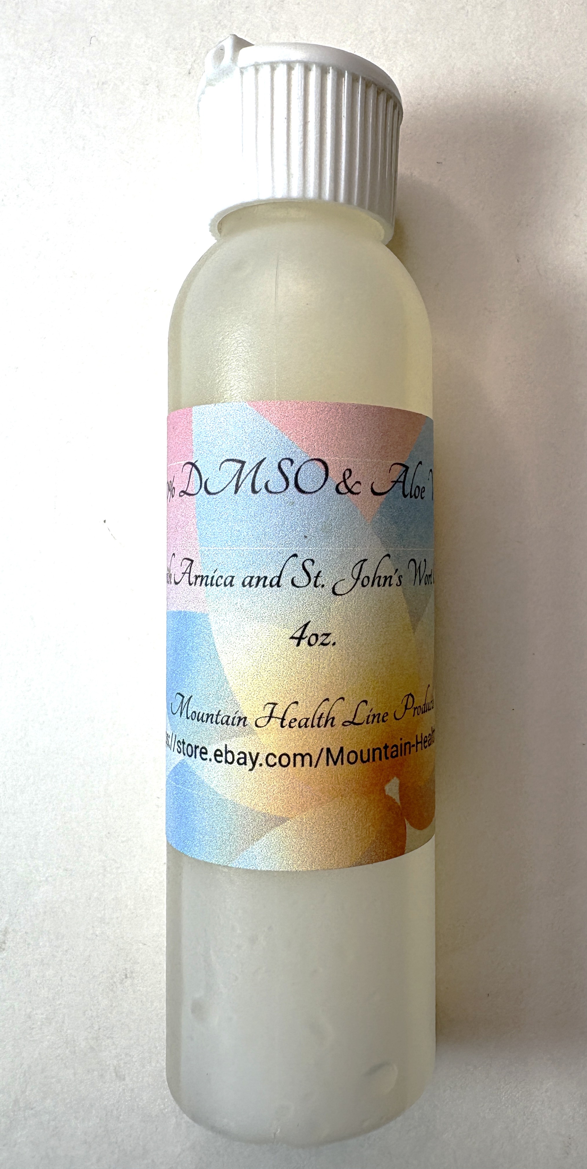 Our convenient flip-top formulation combines 50% DMSO (Dimethyl Sulfoxide) with 50% Aloe Vera gel, infused with Arnica and St. John's Wort oils. This unique blend comes in an easy-to-use 4-oz flip-top bottle for convenient application.
