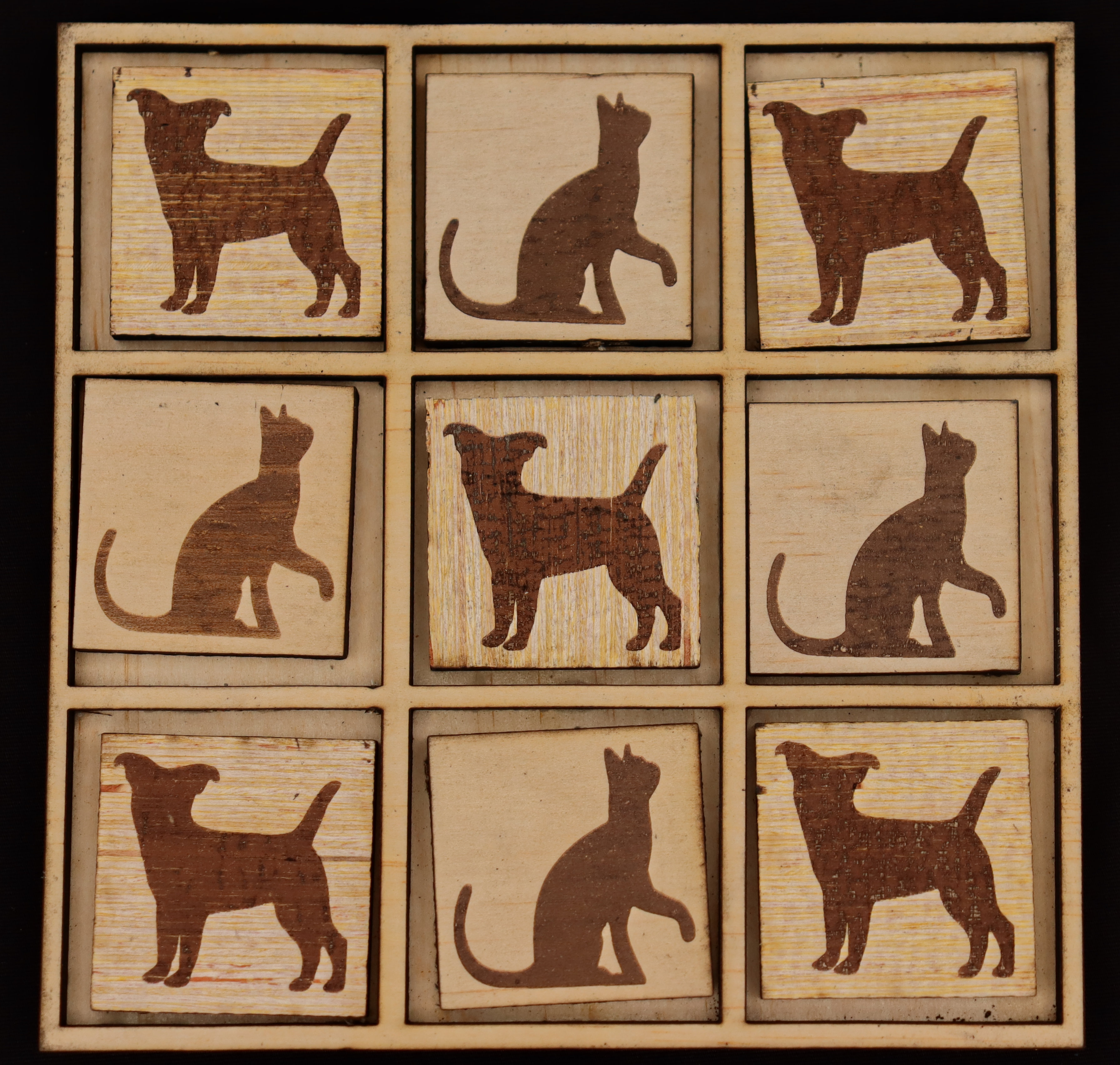Each game is made out of wood. The shape is cut out and the image is engraved onto the wood.