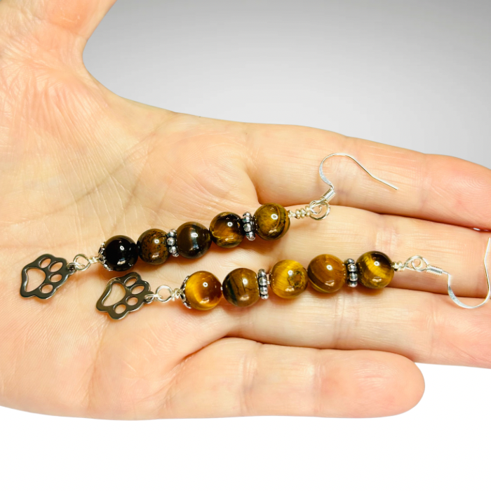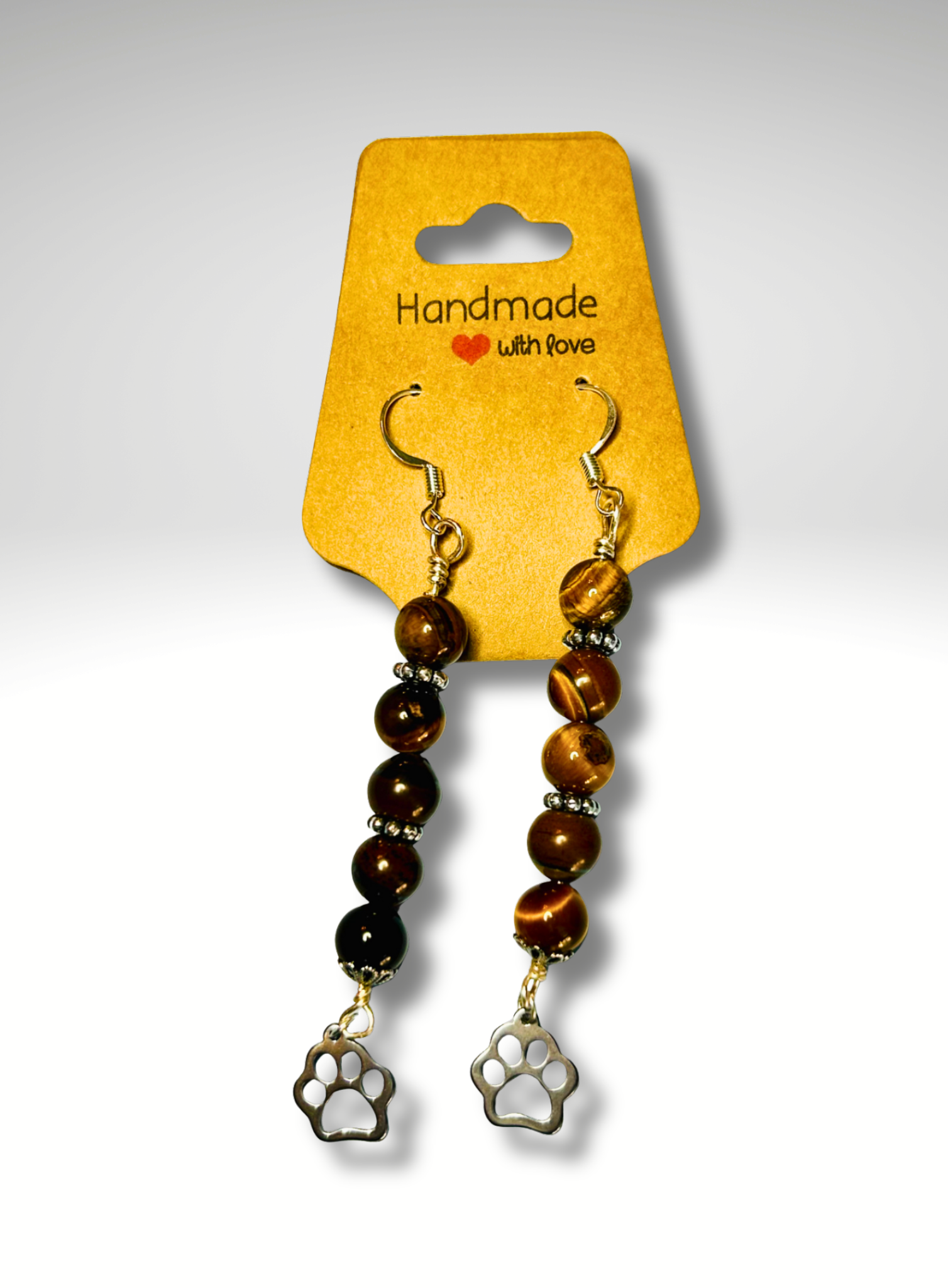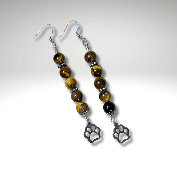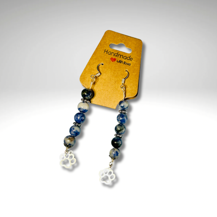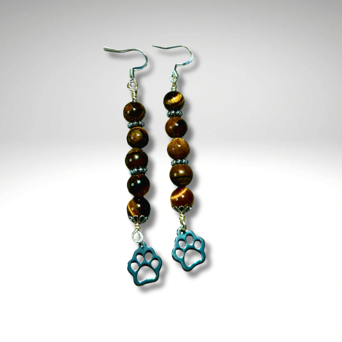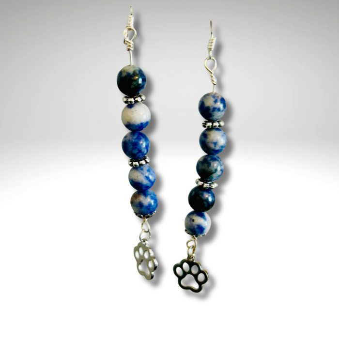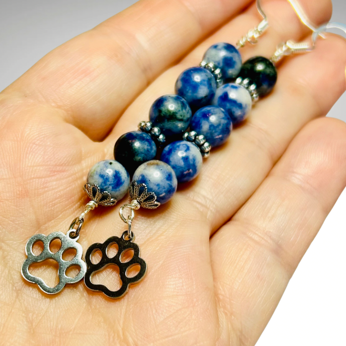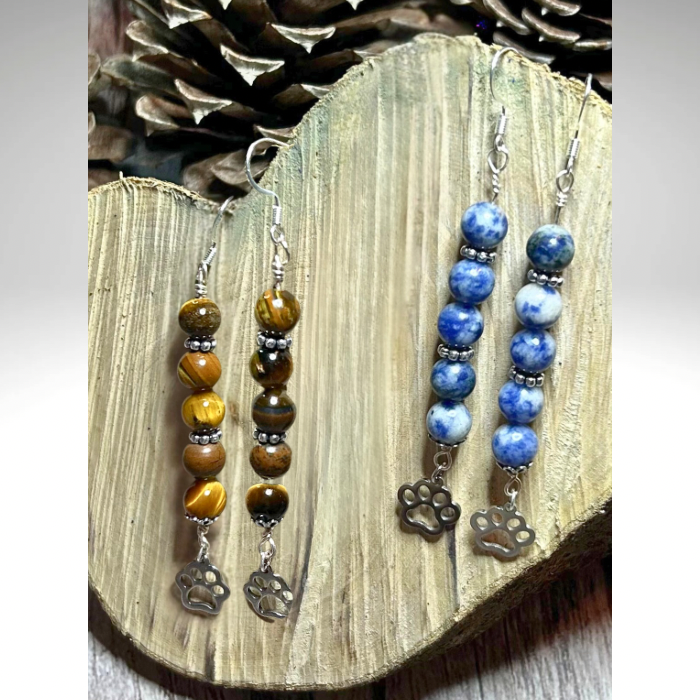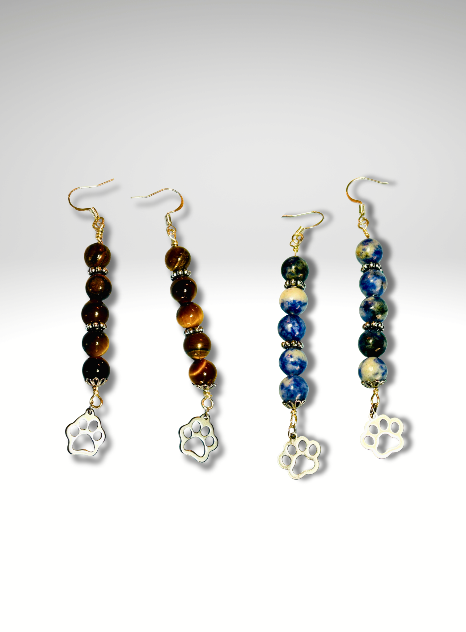 These Dog Paw Gemstone Beaded Dangle Earrings feature 5 each round gemstones beads strung on a silver stainless steel long wire attached to a silver hook/ear wire ending with an adorable dog paw charm. In between the beads to add some interest, is a stainless steel flower spacer, 2 each per earring. Each earring is finished off with a stainless steel bead cap to make sure your Amethyst beads are secure. The earrings are 3.25 inches in length and are approximately 0.25 inches wide. With a beaded style and nickel-free feature, these earrings are perfect for unisex adults who love nature, animals, and bohemian themes. They would make the perfect gift for a Fur Mom.