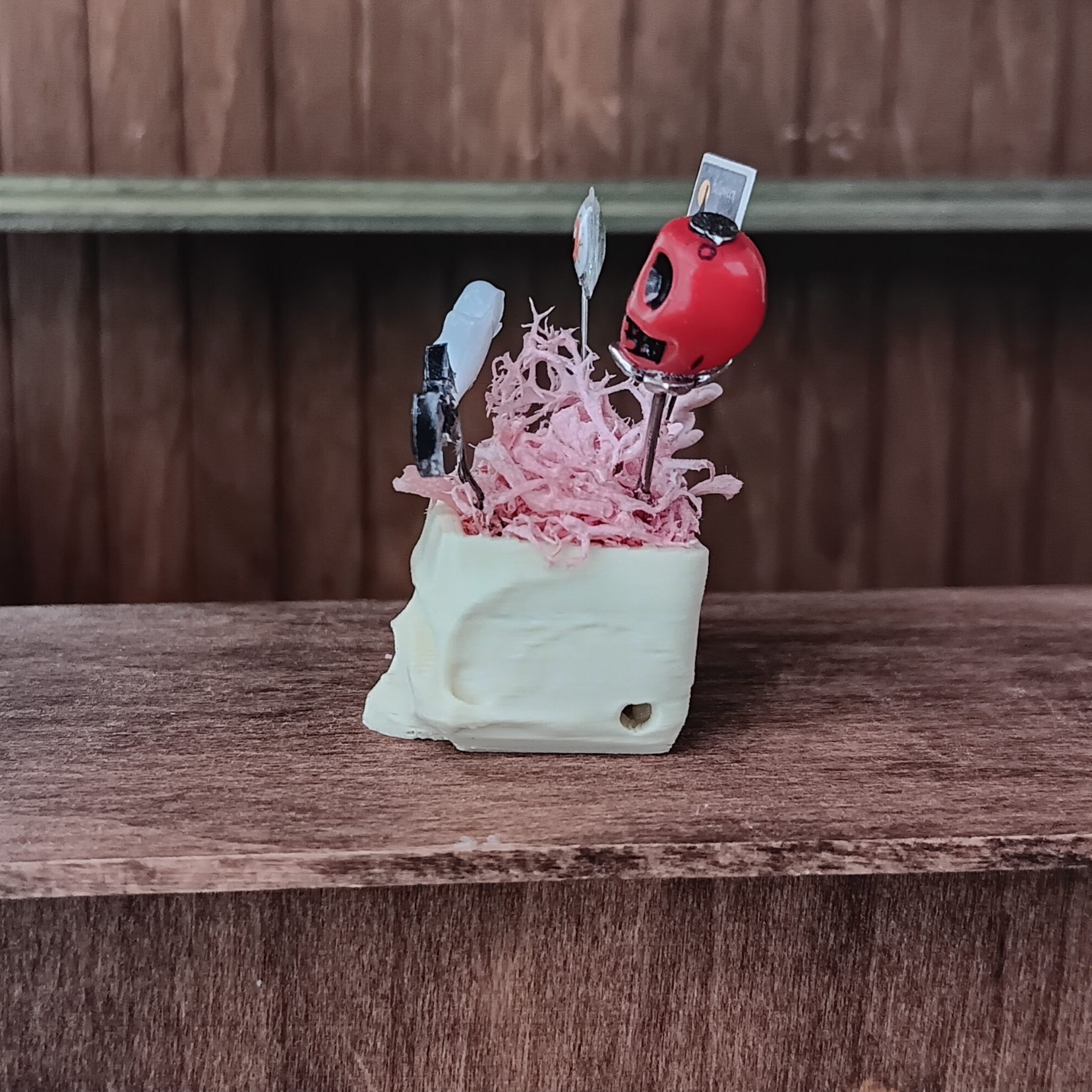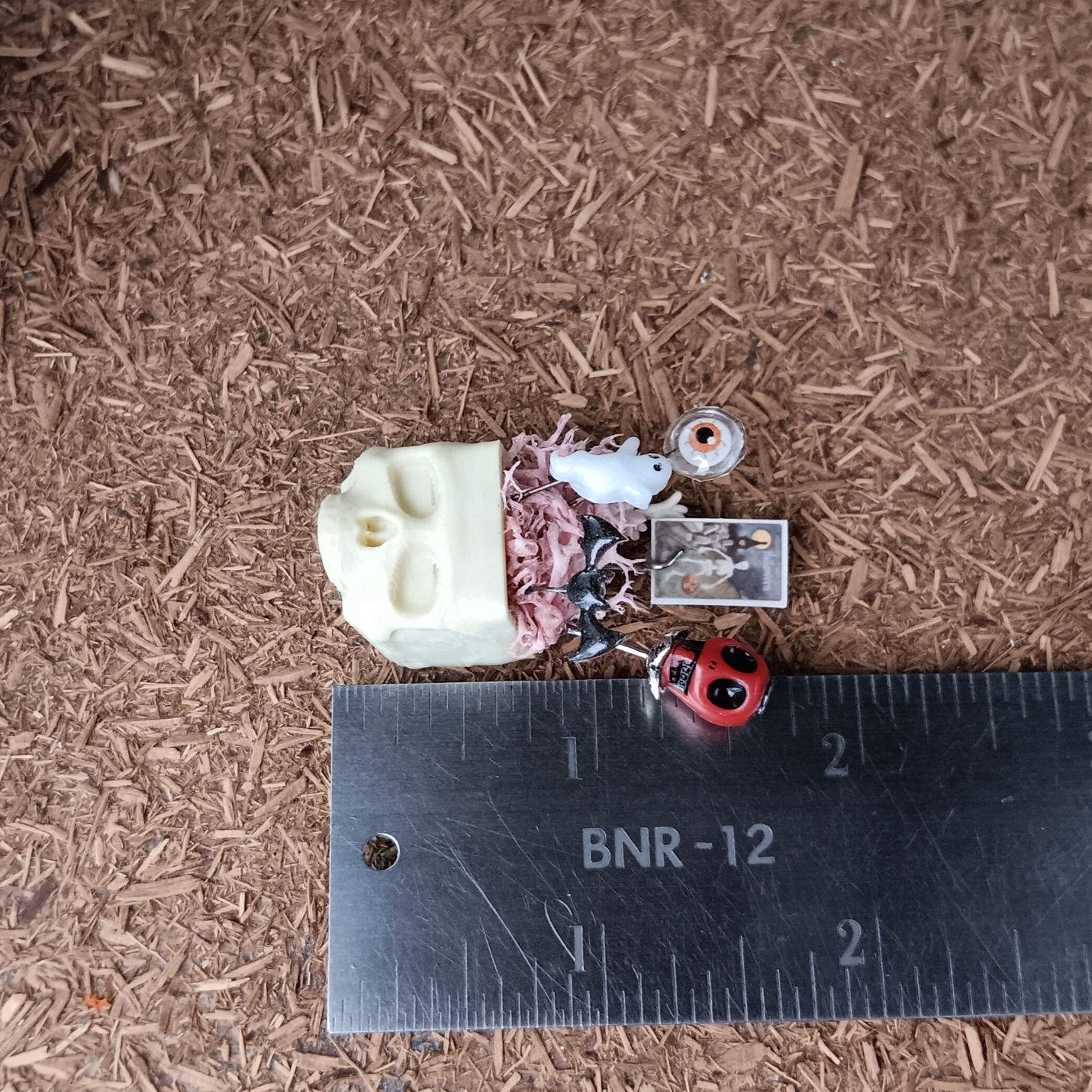 I really wanted a centerpiece for Halloween for my dollhouse, but all the ones I could find had candy and I wanted something different. I 3d printed the base, handmade all of the little bits and bobs that went in as picks, and put it all together. And voilà ! Just the centerpiece I wanted! I hope you like it too!