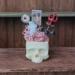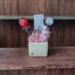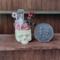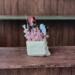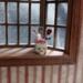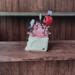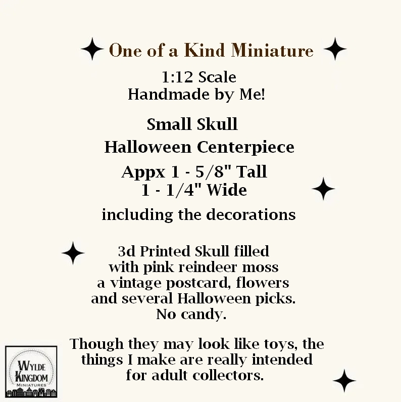 A touch of Halloween spookiness for your dollhouse table! This spooky looking skull is filled with pink reindeer moss, a vintage postcard in a holder, some flowers, and several Halloween picks: a skull, an eyeball, a ghost and a bat!