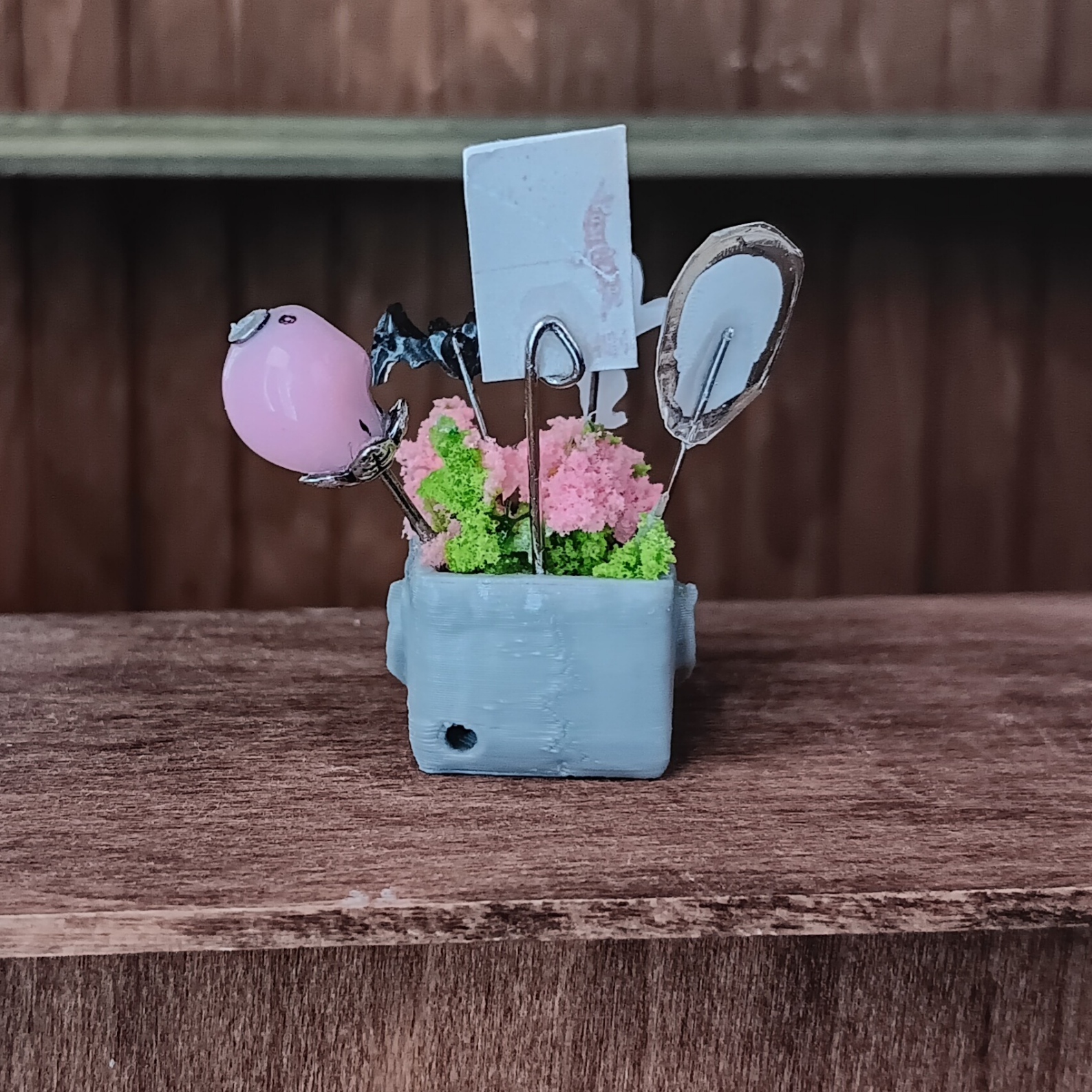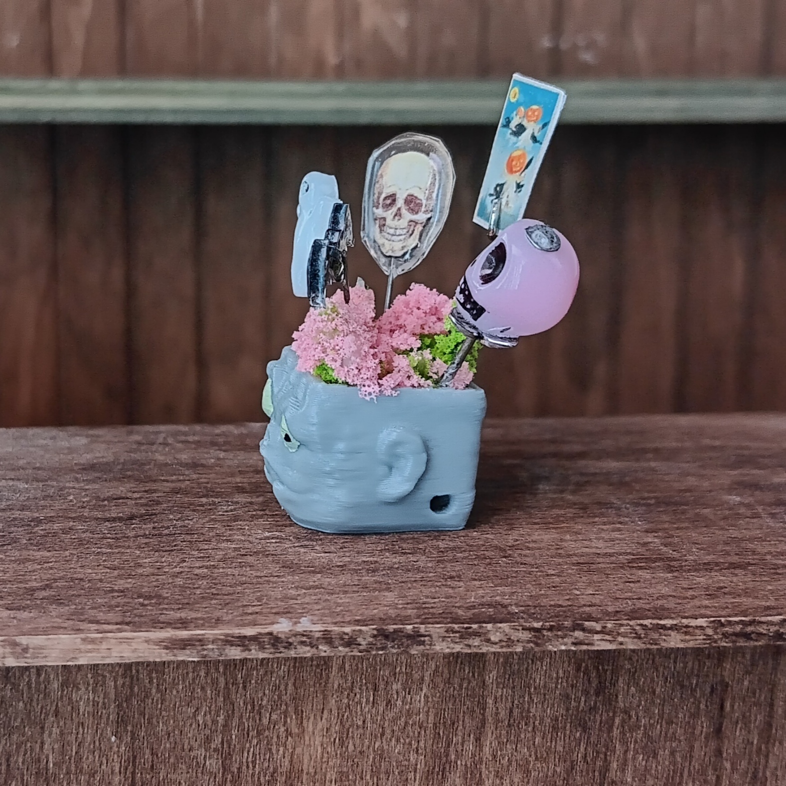 I really wanted a centerpiece for Halloween for my dollhouse, but all the ones I could find had candy and I wanted something different. I 3d printed the base, handmade all of the little bits and bobs that went in as picks, and put it all together. And voilà ! Just the centerpiece I wanted! I hope you like it too!