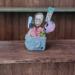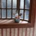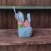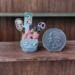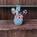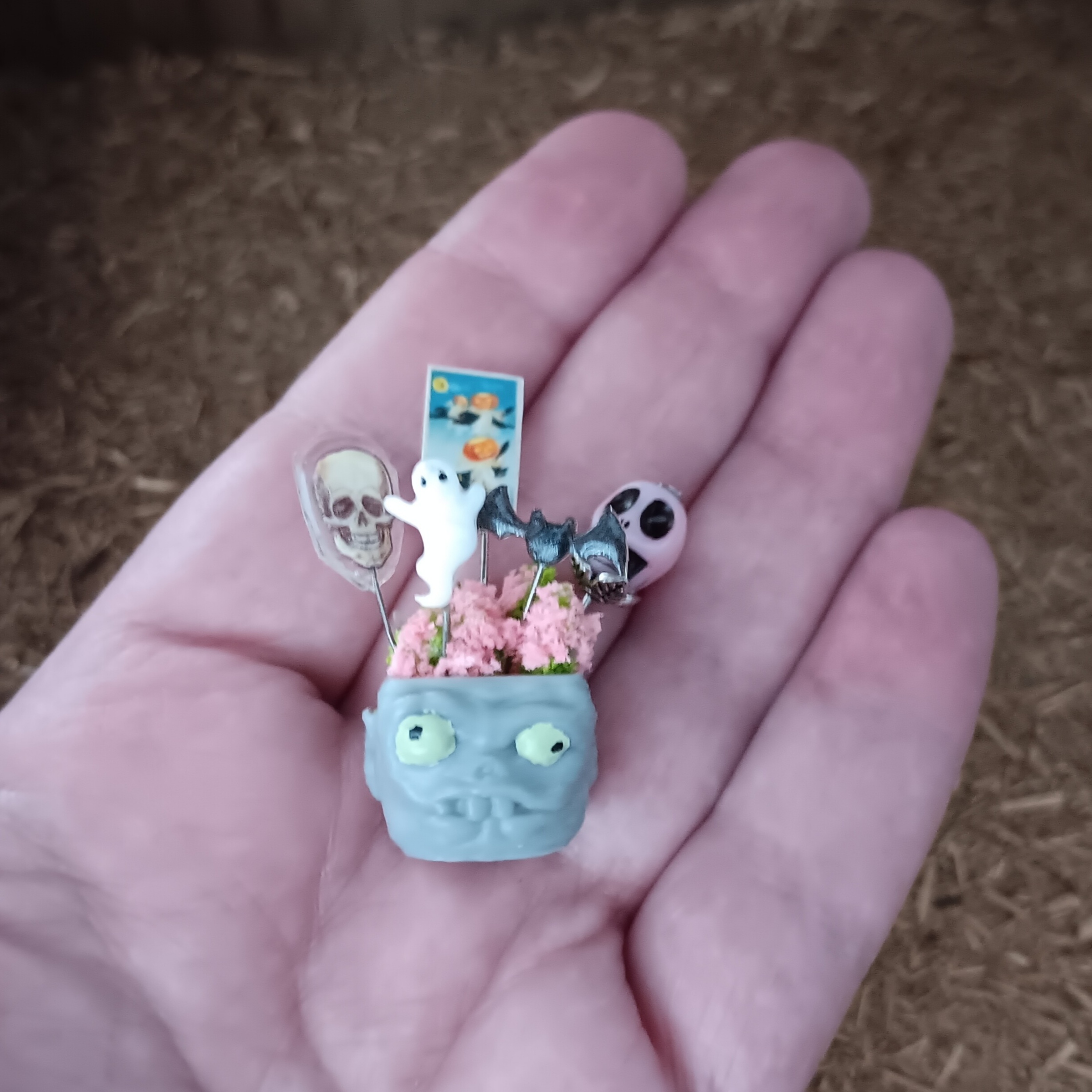 A touch of Halloween spookiness for your dollhouse table! This spooky Halloween zombie head is filled with pink flowers, a vintage postcard in a holder, and several Halloween picks: a skull, another skull, a ghost and a bat!