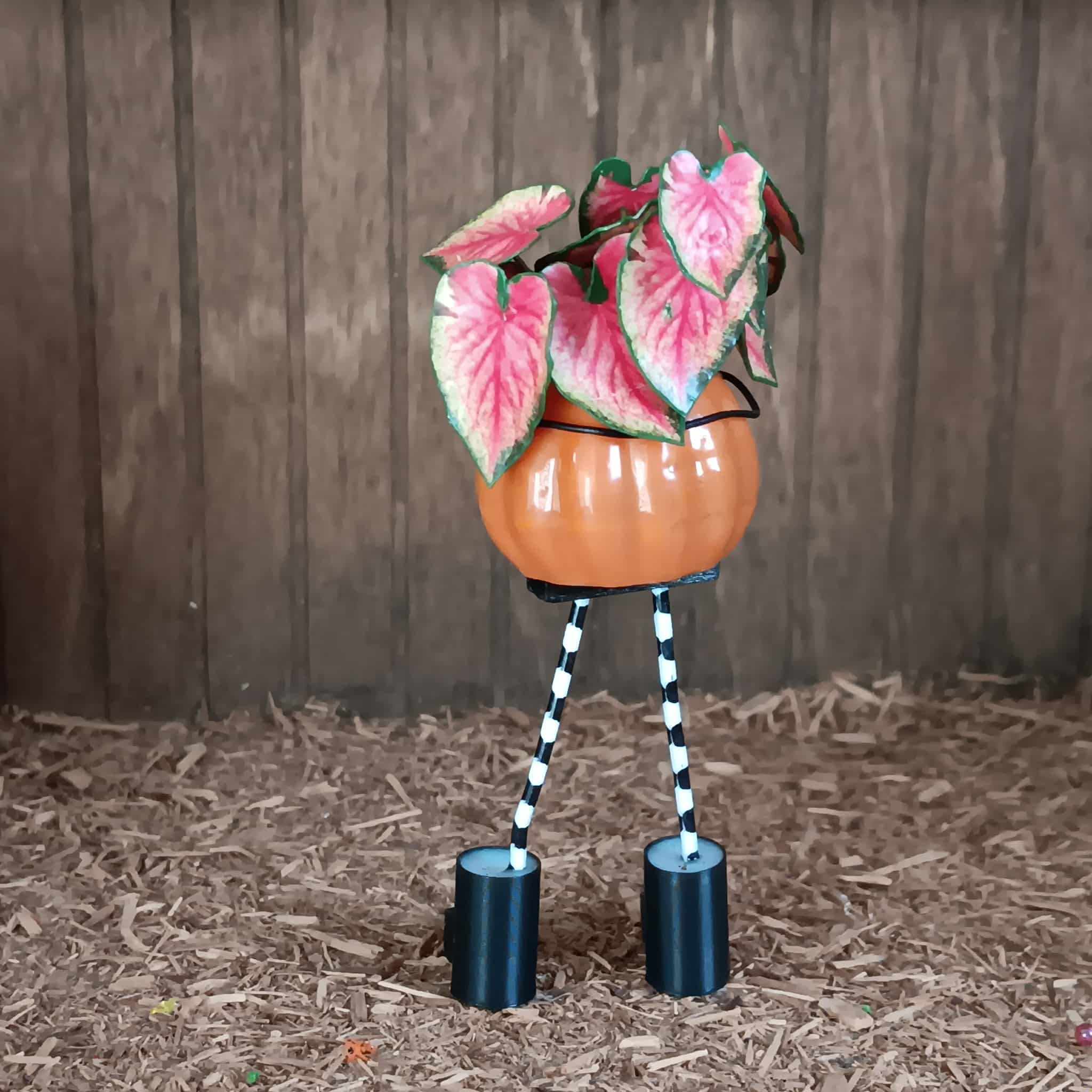 I 3d print the bucket, and then handpaint and seal the smile. The legs are wire with 3d printed boots. The plants are paper, painted or printed and then sealed over wire. So some filament, paint, sealant, glue and magic is all it takes! :)