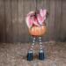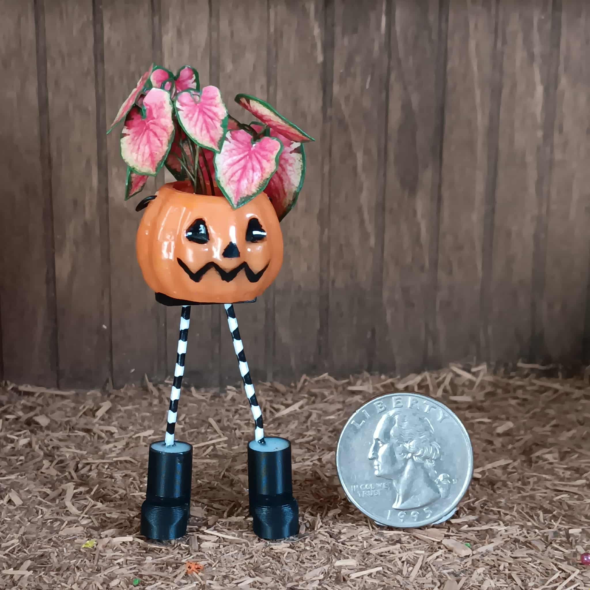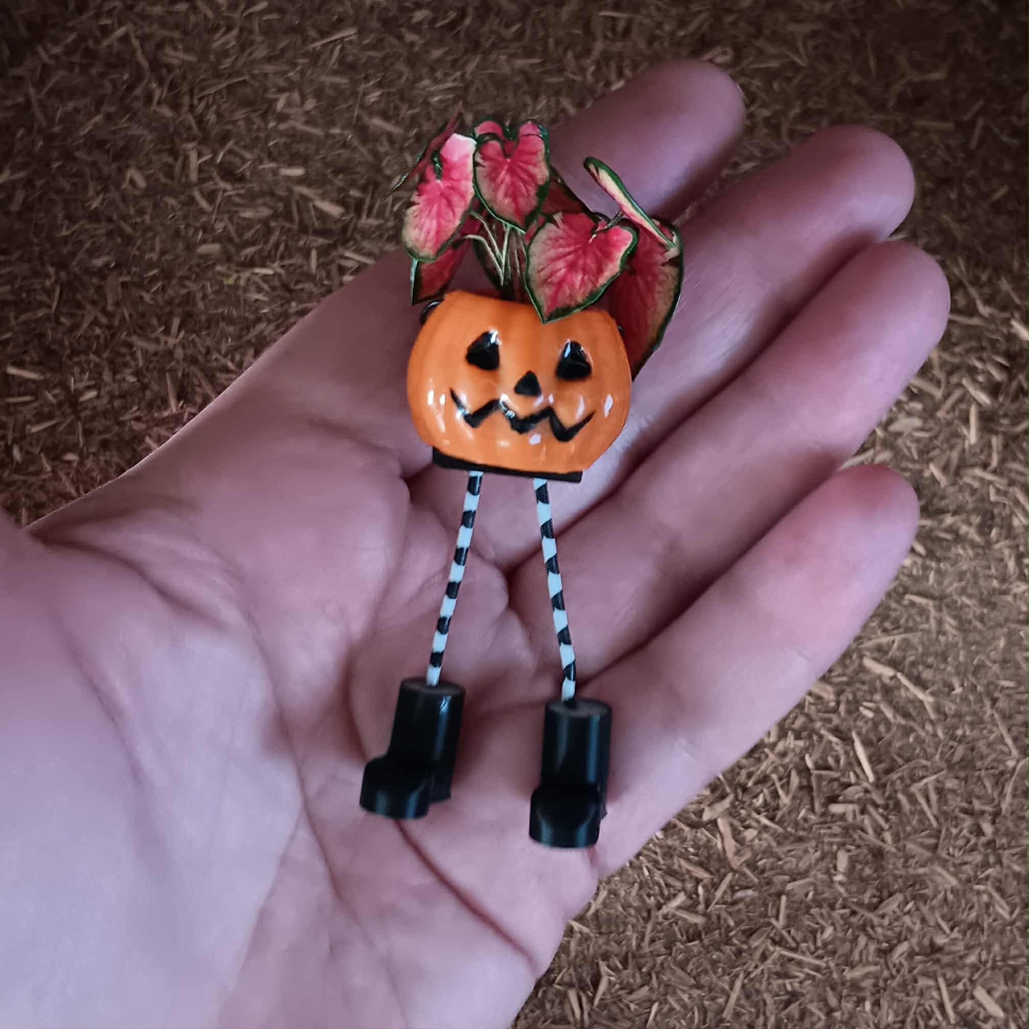 This little pumpkin planter has stripey legs, black boots, a big smile and a beautiful, leafy plant just waiting to add some Autumnal cheer to the front door of your dollhouse, or anywhere that could use a pumpkin smile!