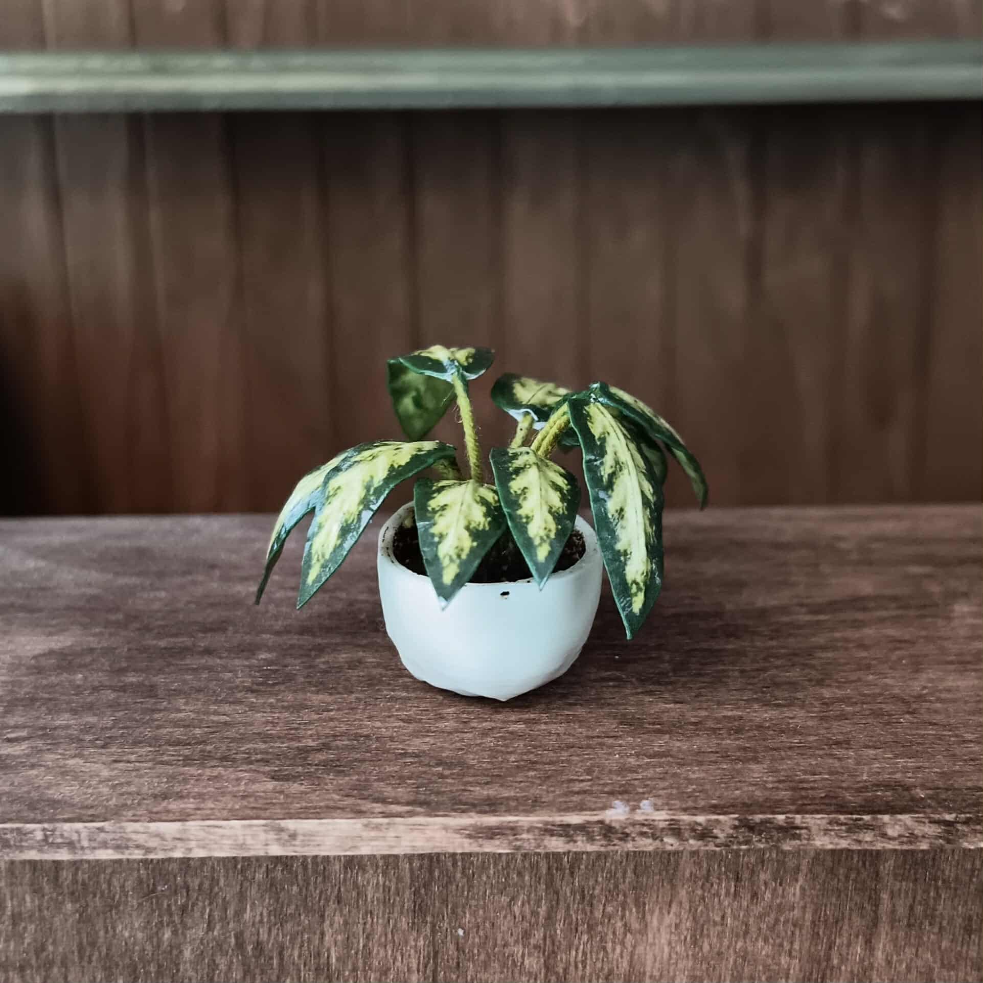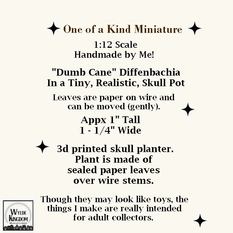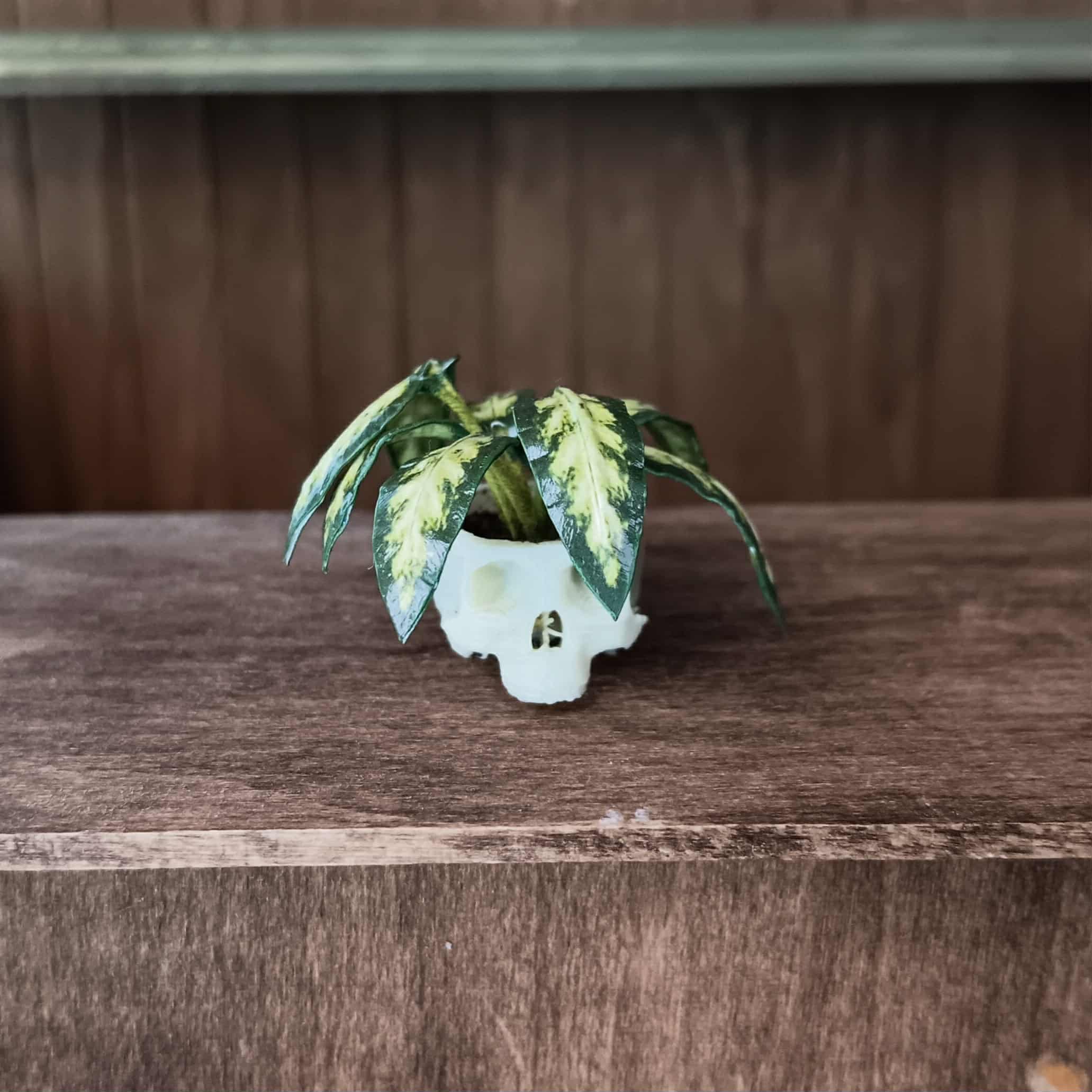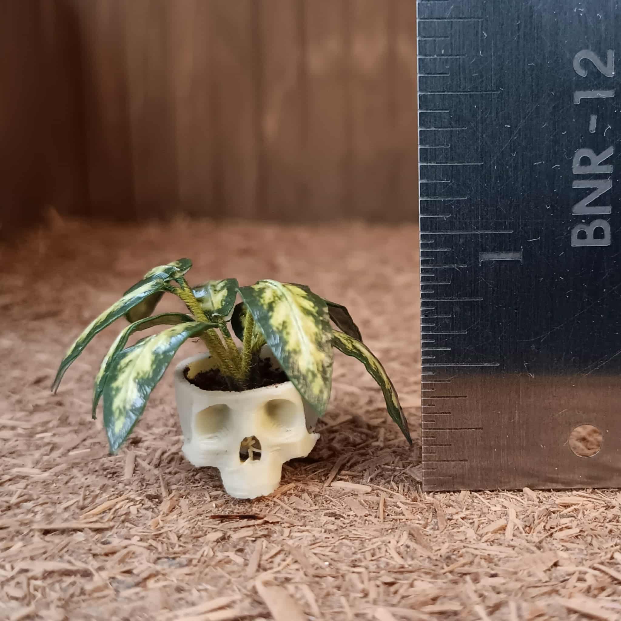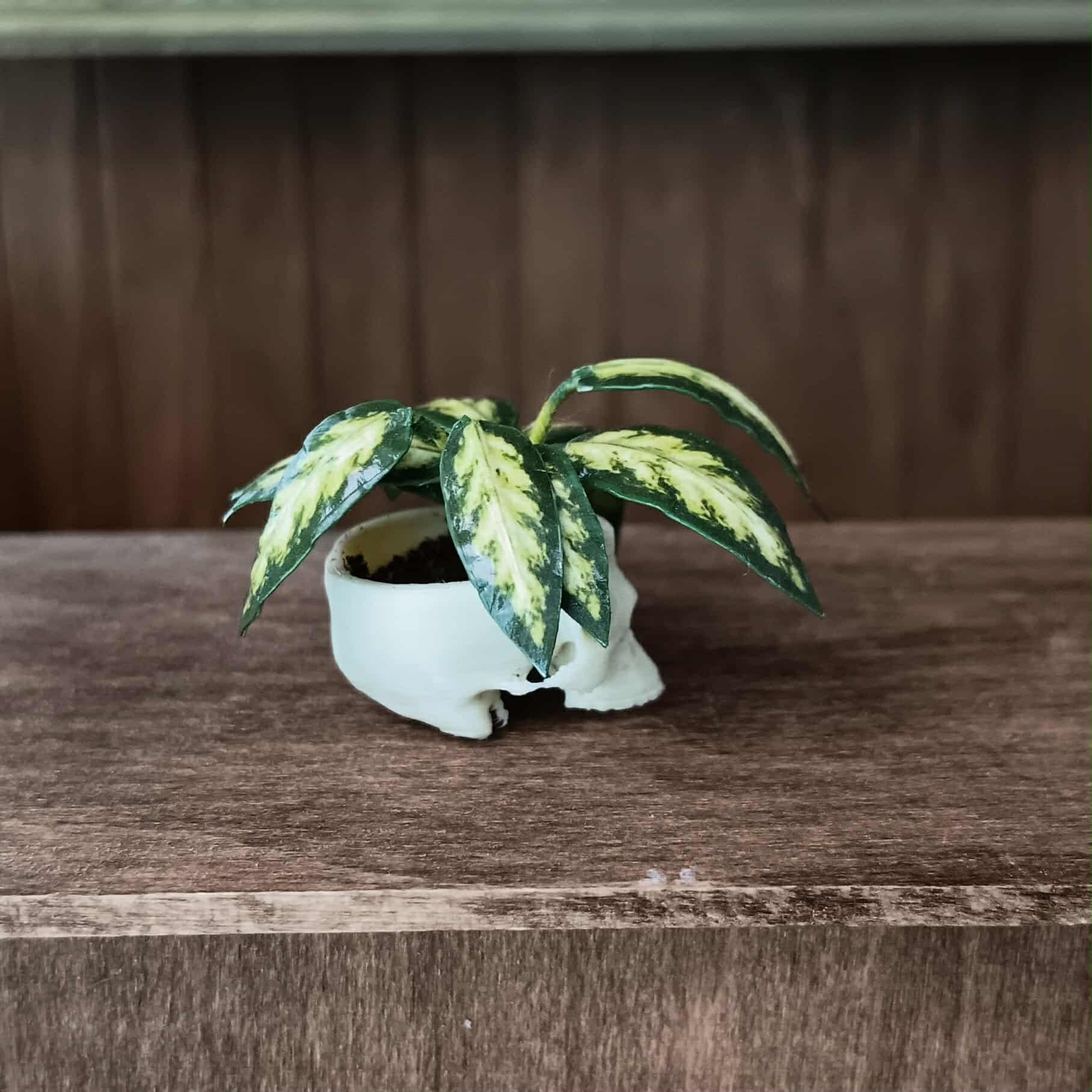 A touch of Halloween spookiness for your dollhouse table or shelf! This is a handmade Diffenbachia in a tiny, 3d printed, realistic skull. The leaves are sealed paper on wire stems and can be gently bent and curled to better display them.