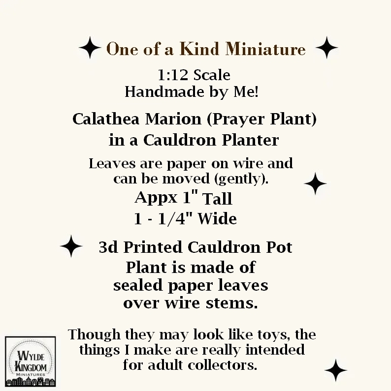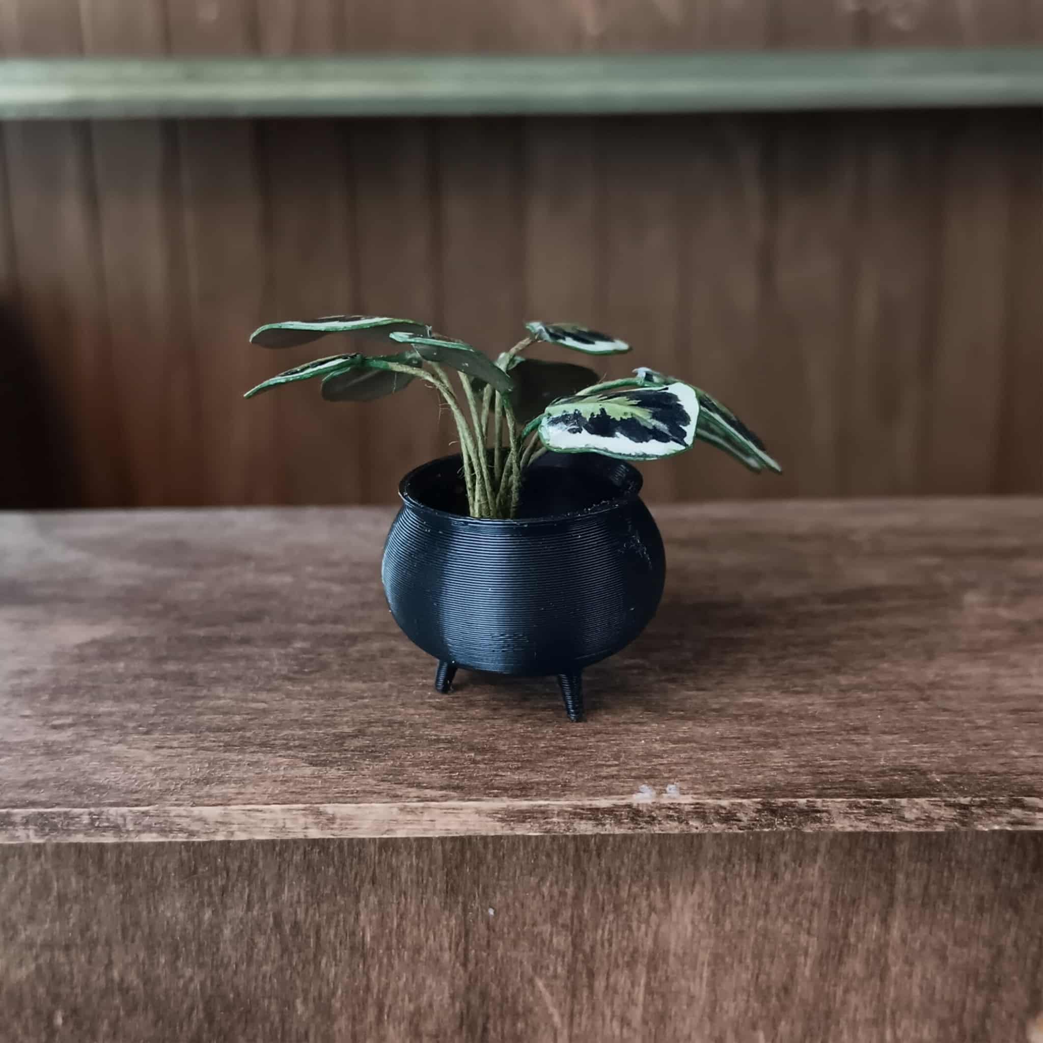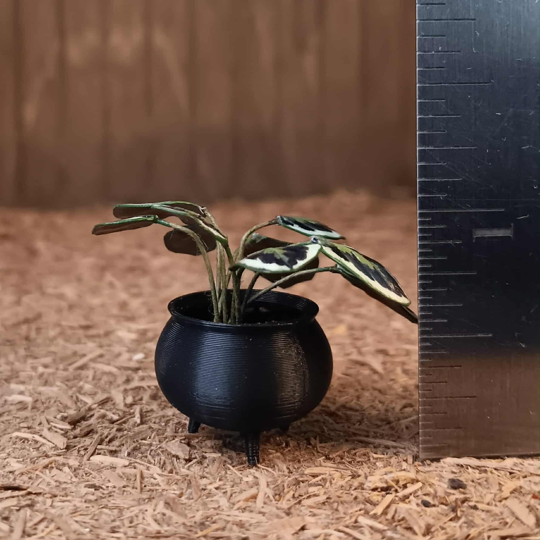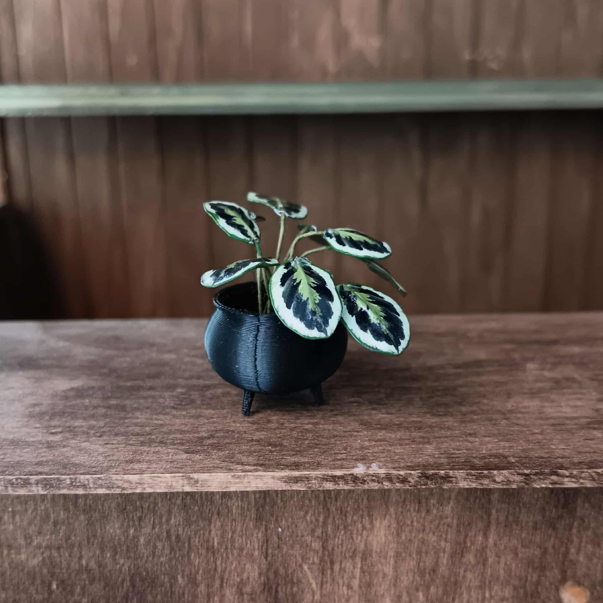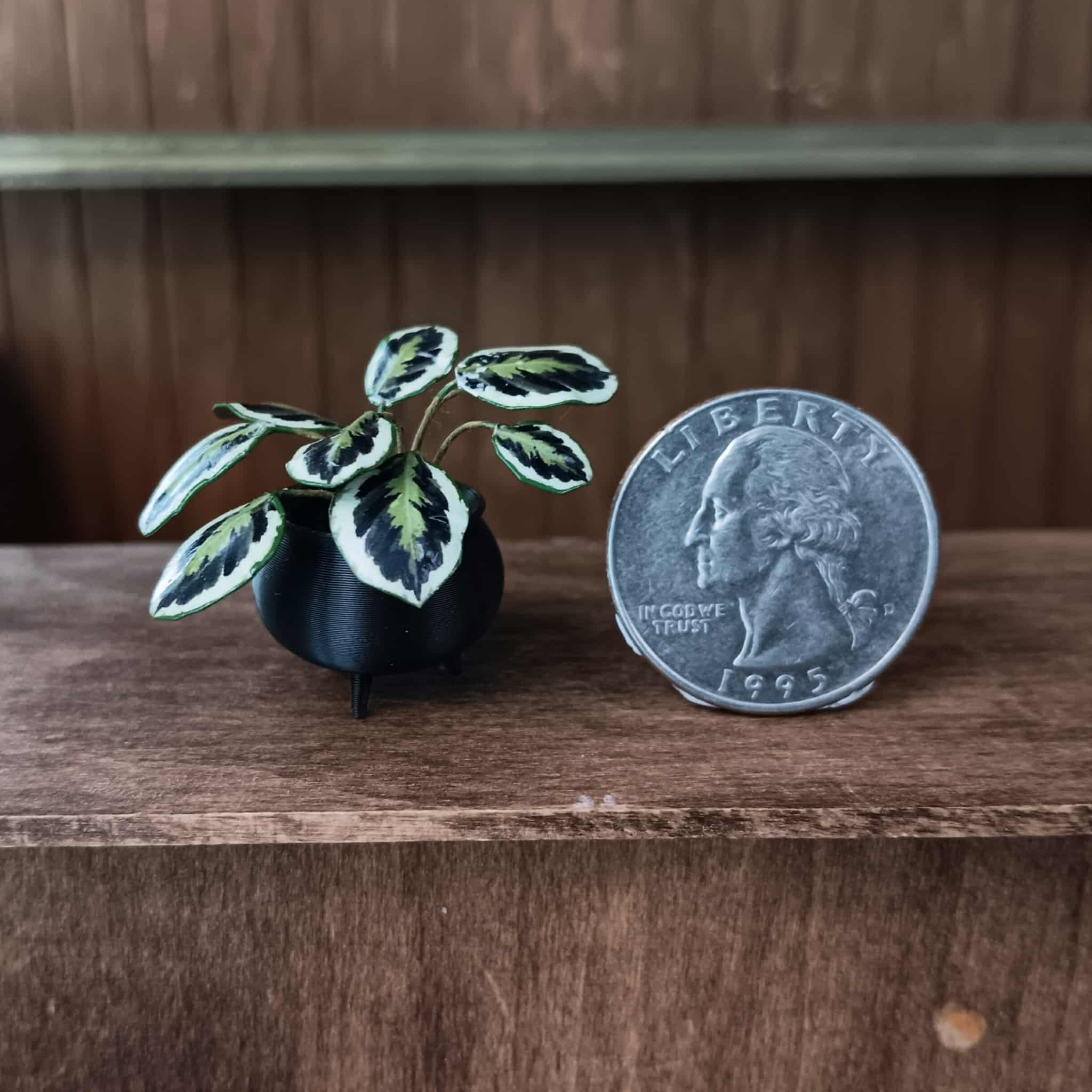 A touch of Halloween spookiness for your dollhouse table or shelf! This is a handmade "Prayer Plant" (Calathea Marion) in a tiny, 3d printed, black cauldron. The leaves are sealed paper on wire stems and can be gently bent and curled to better display them.