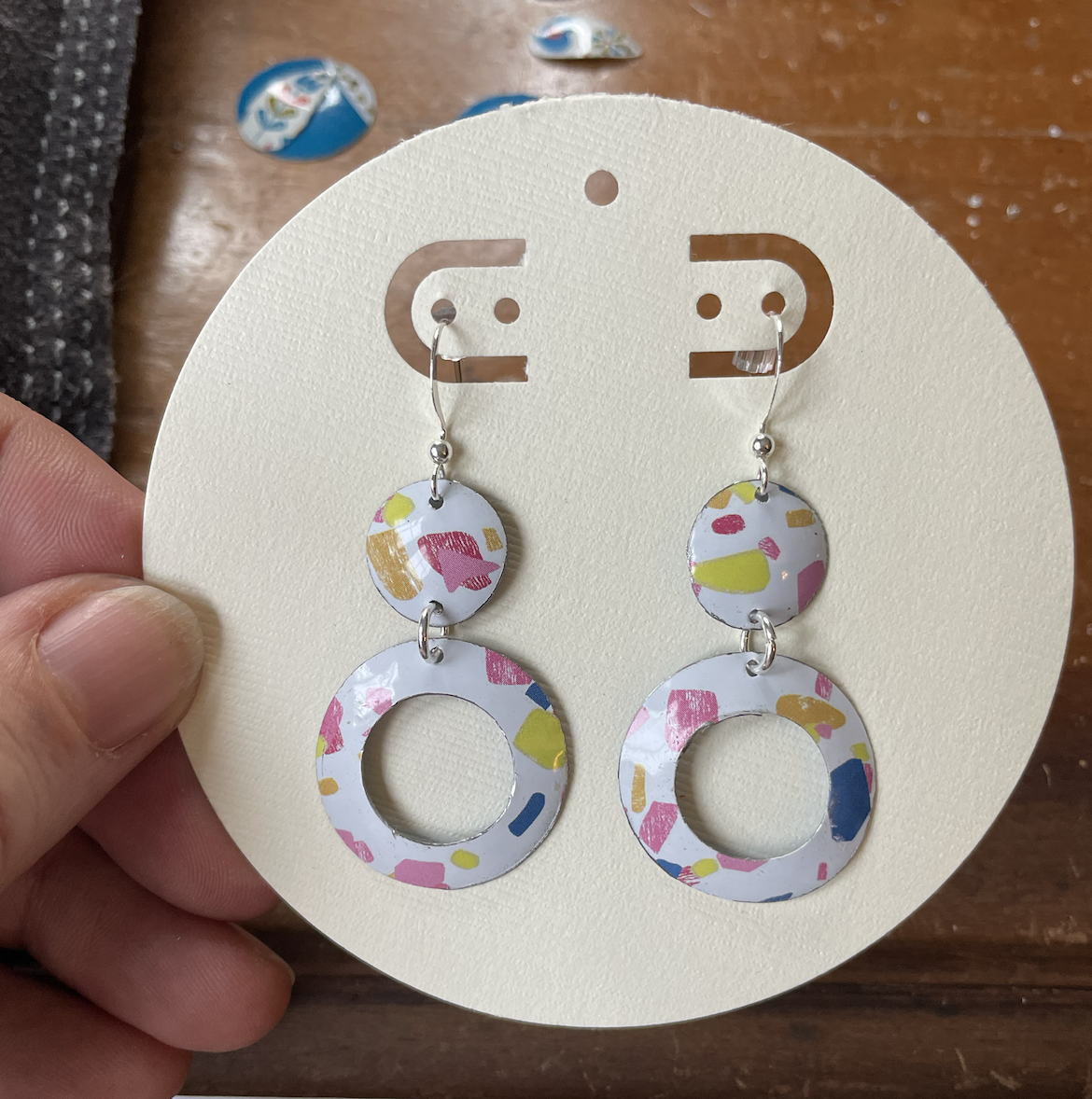 Tins are very light making them ideal for earrings as they don't weigh down your ears as the day goes on. Did you know the proper term for working with tin is "tinkering"? That made me really happy. I literally tinker in my art studio! I use old cookie tins, tea tins, and the like, break them down, and hand cut them into shapes and hand-hammer them into the 3-D shape I want them to be, finish and polish them, before putting them together like any other jewelry.