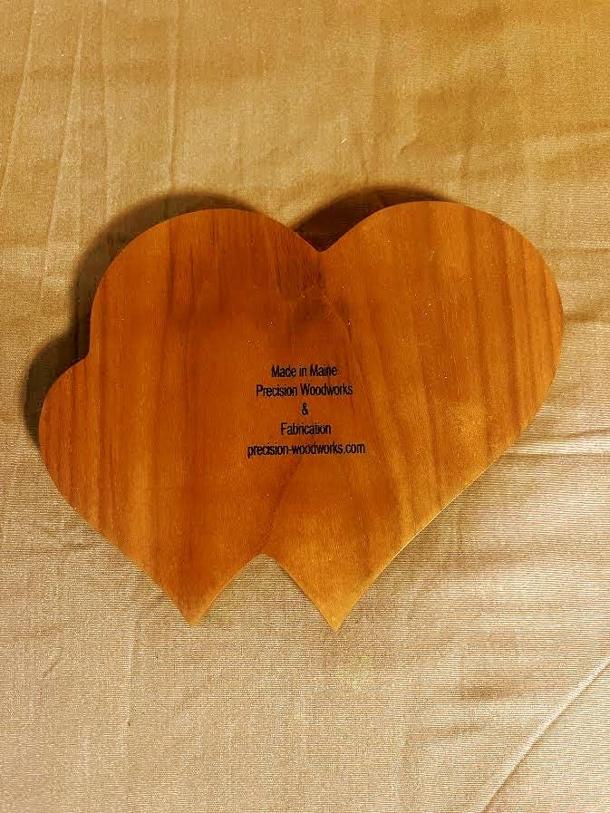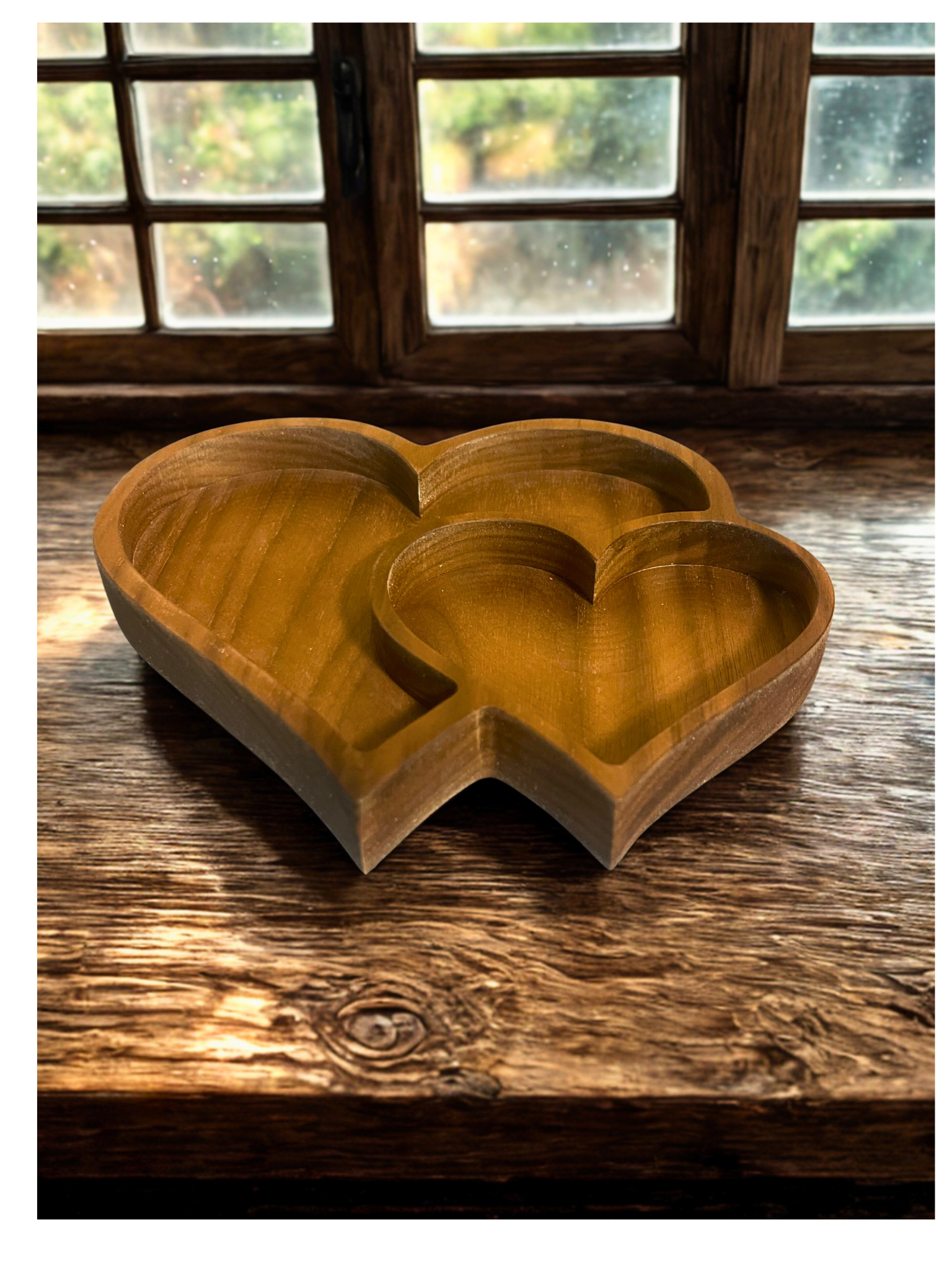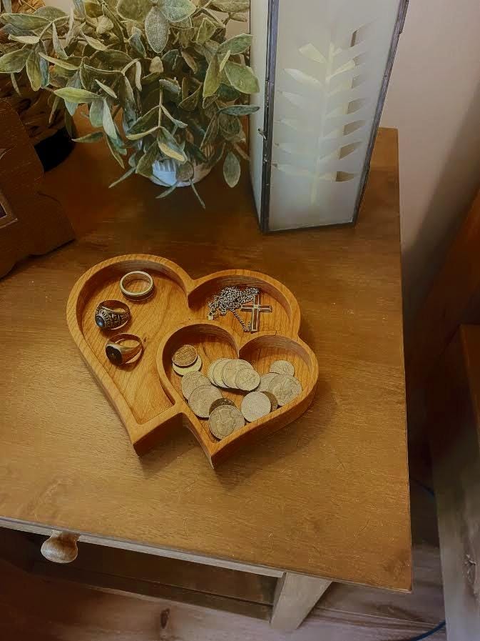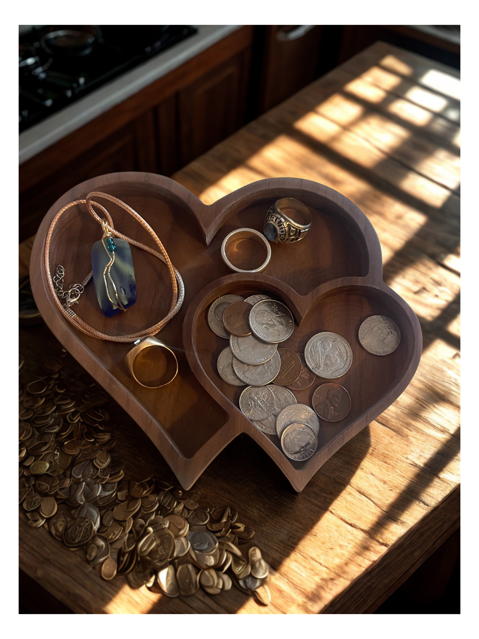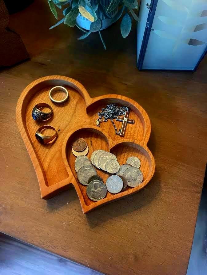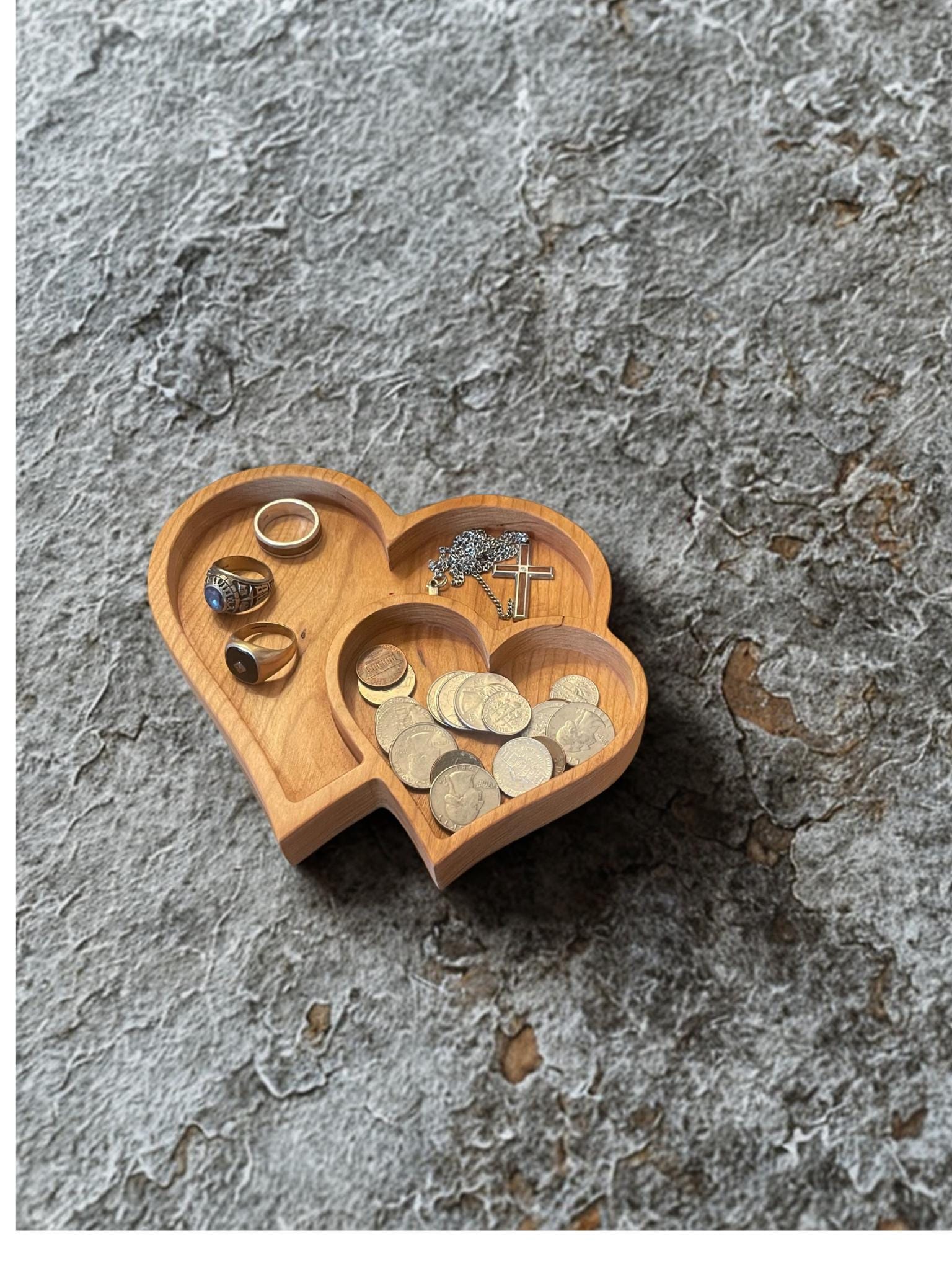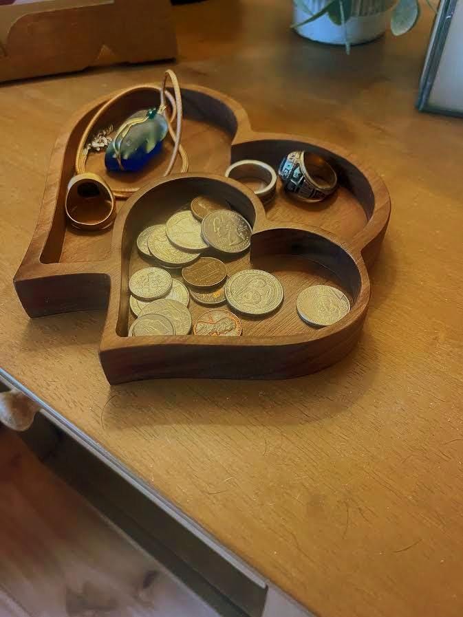 FALL SALE! Double heart shaped catch all bowl. Made from a sing piece of wood finished with satin lacquer ready to be put to use! Comes in Walnut or Cherry wood. Size is 7-3/4" wide X 6-3/8" high. Plenty of room for rings, jewelry or spare change.