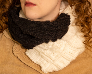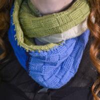 This scarf is a take on the classic Möbius strip, something that sometimes comes up in certain areas of mathematics (if you know, you know). Essentially, it's an object that only has one singular side. If you take a strip of paper, twist one end 180 degrees either direction, and tape it to the untwisted end, you have it.