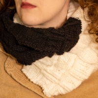This scarf was knit on regular needles using knit and purl stitches to make the rectangles that give it a cool visual texture. Once the desired length was achieved, the scarf was given the ol' half twist, and then the second layer was attached to the first in the process of going around again. Once that was done, the ends were sewn together. Ta-da!