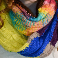 This scarf is a take on the classic Möbius strip, something that sometimes comes up in certain areas of mathematics (if you know, you know). Essentially, it's an object that only has one singular side. If you take a strip of paper, twist one end 180 degrees either direction, and tape it to the untwisted end, you have it.