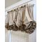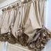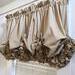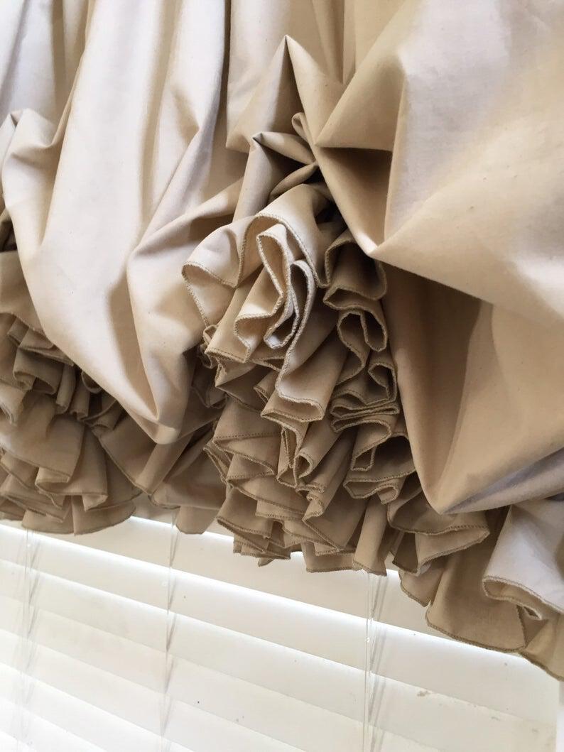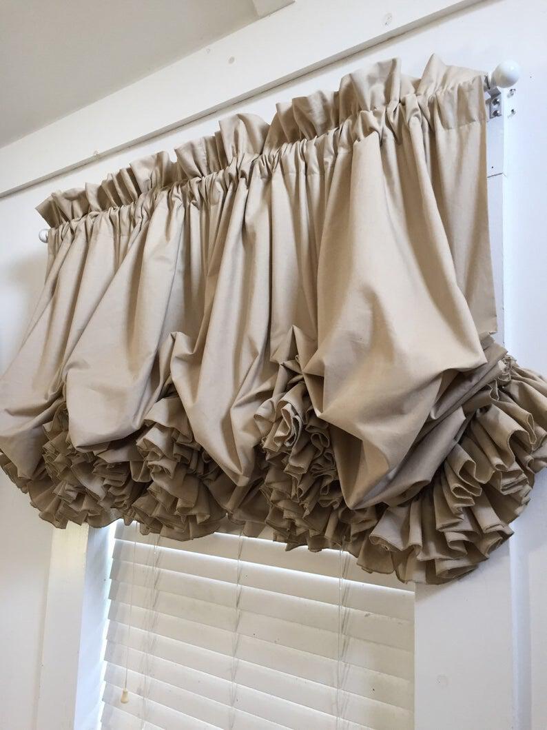 Fully lined, double ruffled balloon curtain made of of Roc-Lon Tea Dyed Light Muslin. Tea dyed muslin is a khaki color. It is a stationary balloon curtain and does not raise up and down but I can make it any length you want. This one is 27 inches from the rod down to the end of the ruffle. It is 90 inches wide before gathering on the rod and will fit any standard sized window up to 45 inches wide or a bit wider.