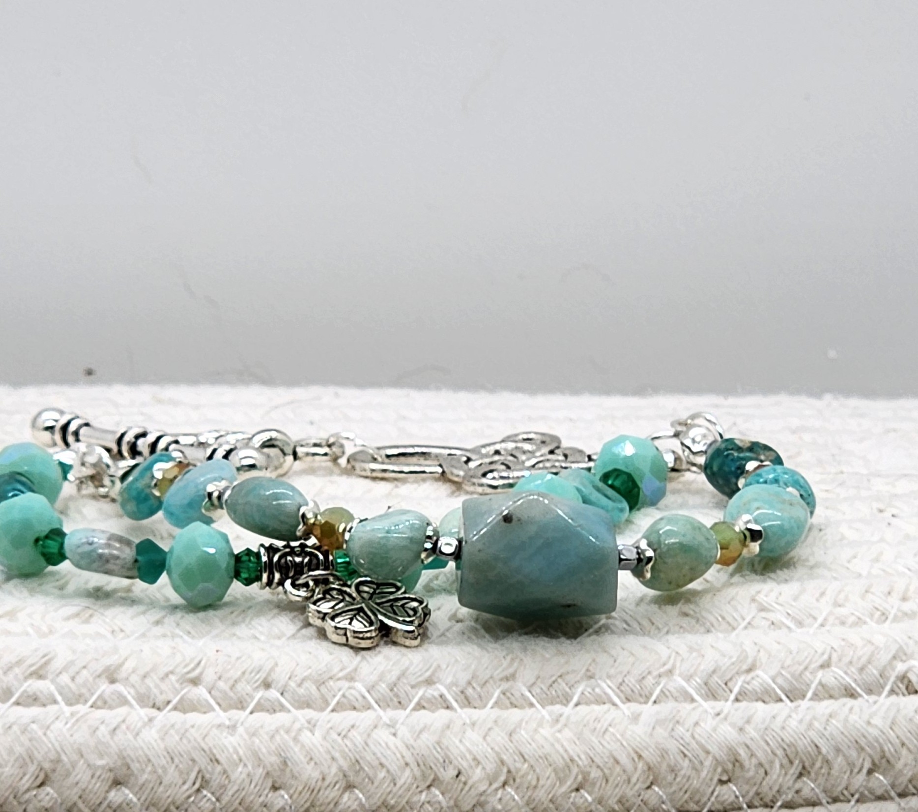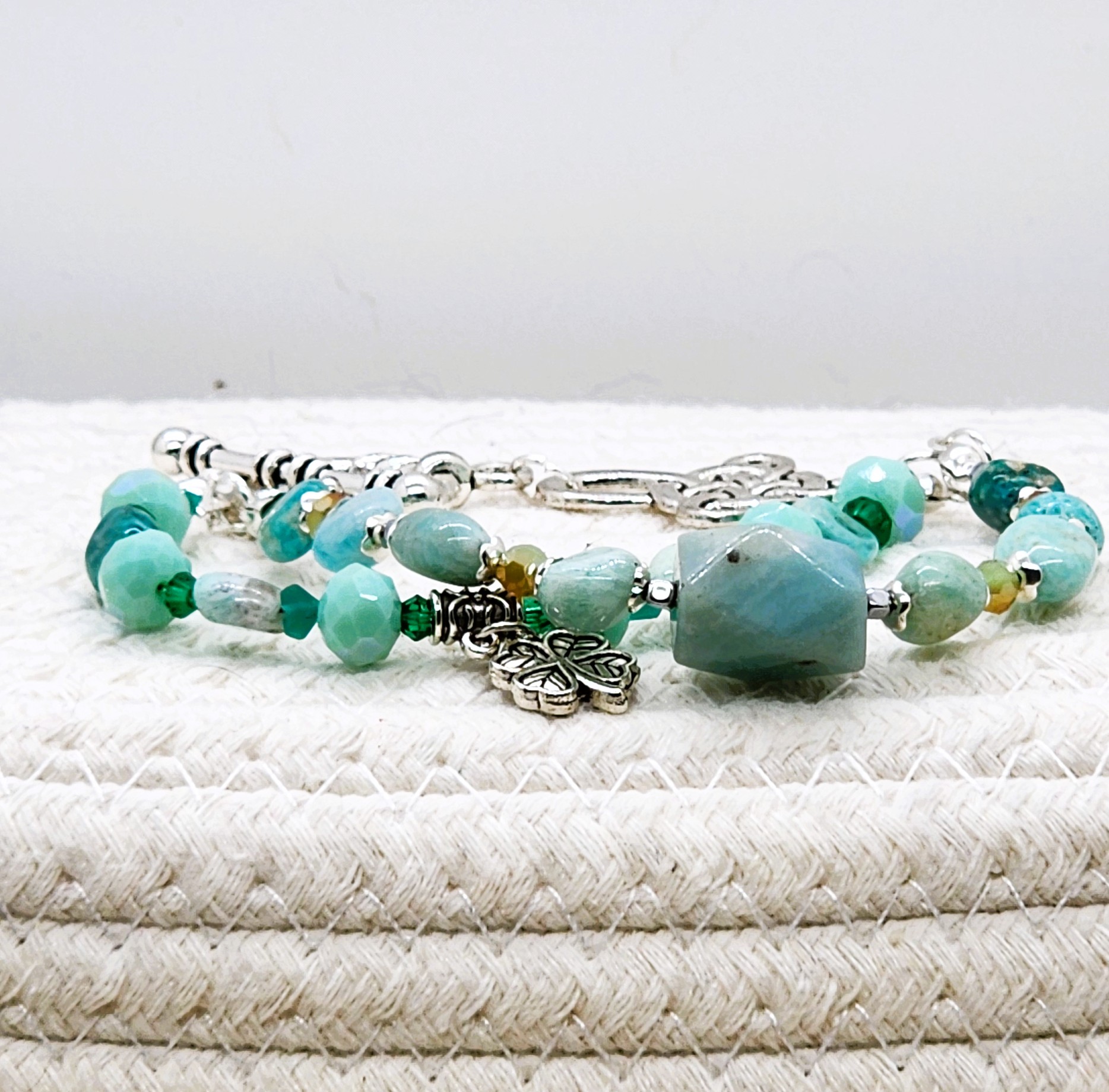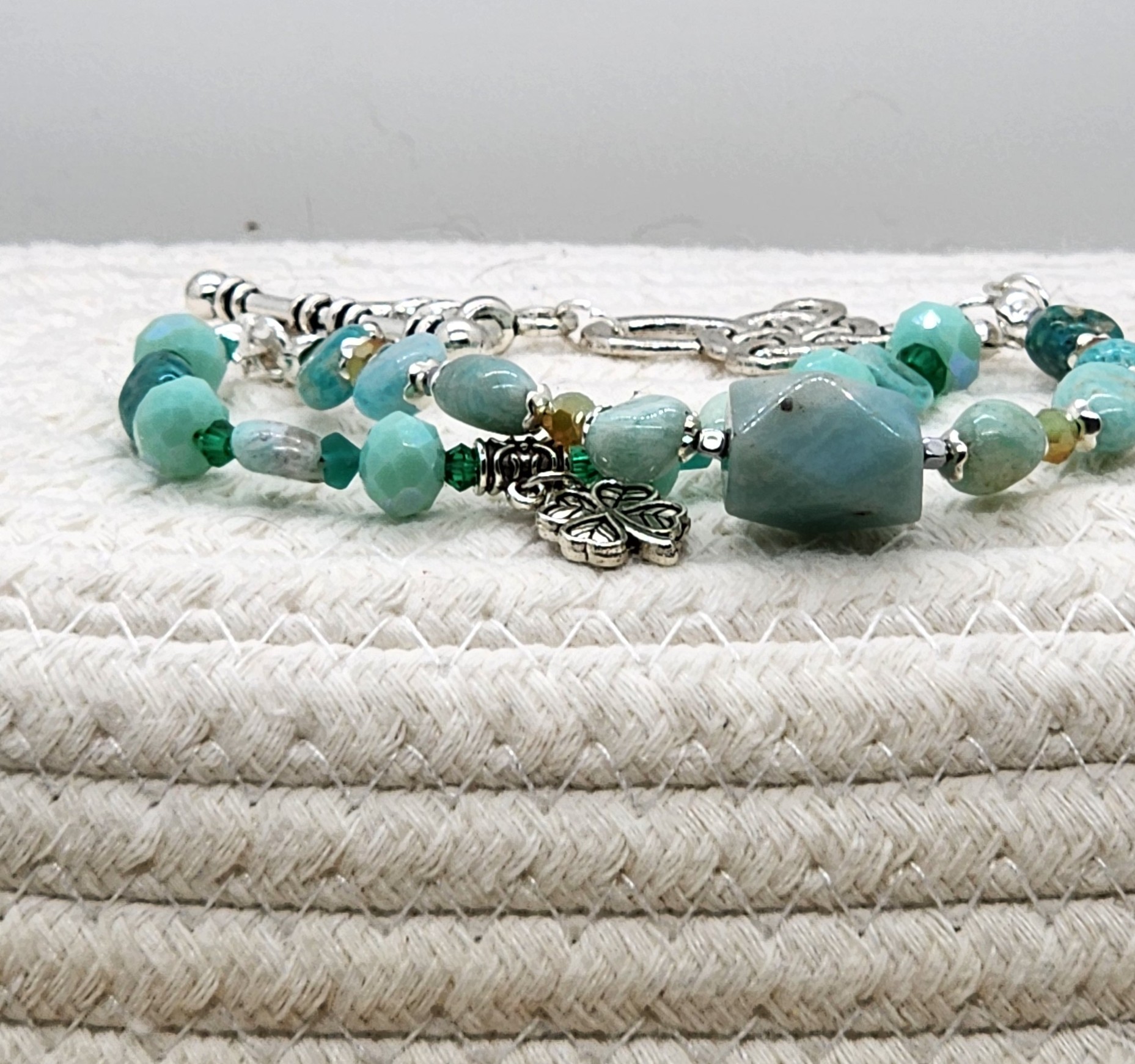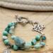 Featuring a stunning mix of smooth and faceted Amazonite beads, soft aqua glass rounds, and silver‑toned spacers, this bracelet captures the refreshing colors of early spring. A beautifully detailed silver leaf charm adds a whisper of woodland charm, while the ornate silver toggle clasp completes the look with artisan elegance.