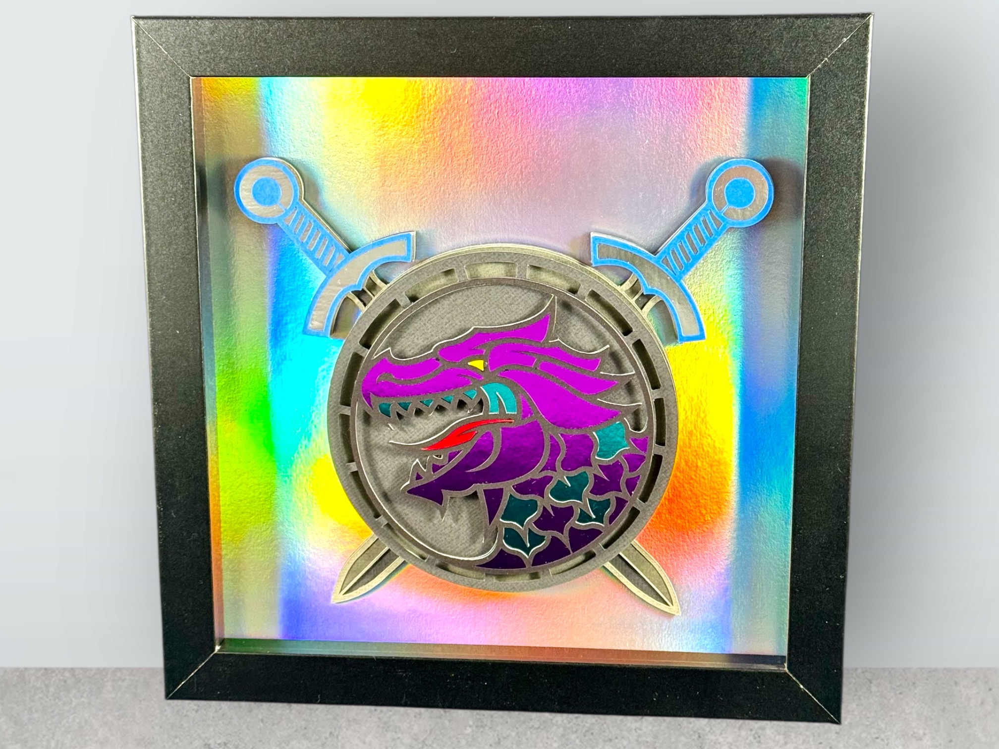 Unleash the power of fantasy with this striking dragon head and shield paper art, with metallic foil accents, layered to create a 3D effect. The design features a fierce dragon’s head on a medieval-style shield, symbolizing strength and protection. Encased in an 8.75x8.75 inch glass-front shadow box frame, this piece brings dimension and drama to any space.