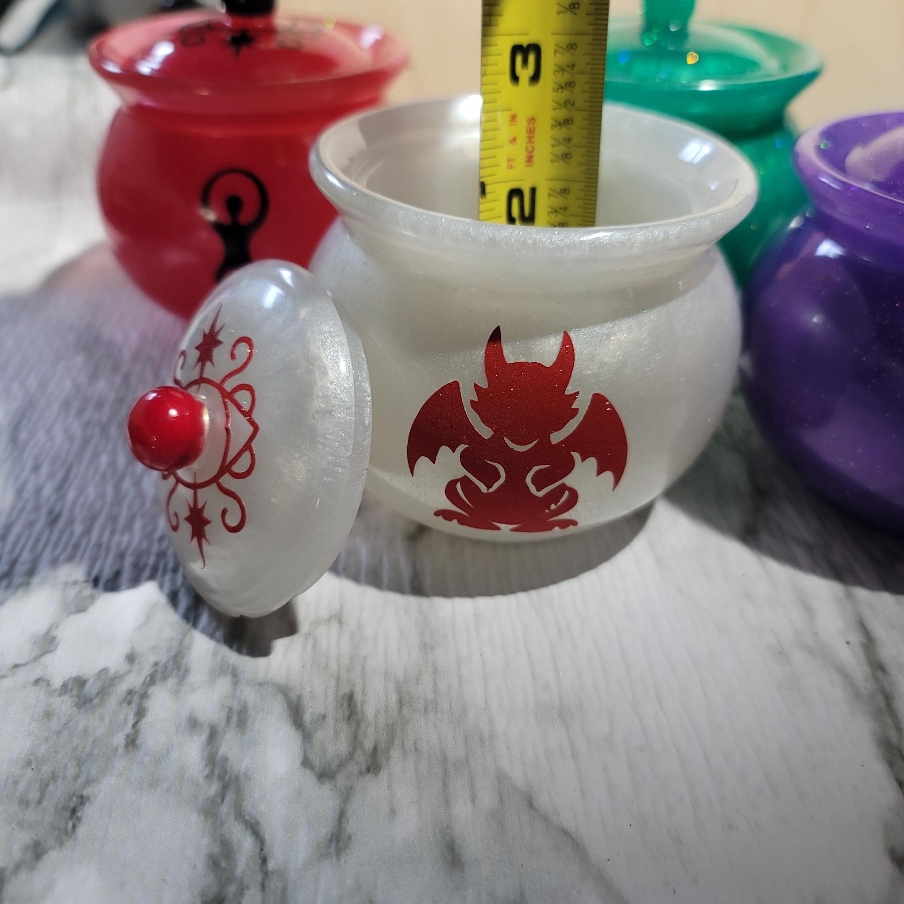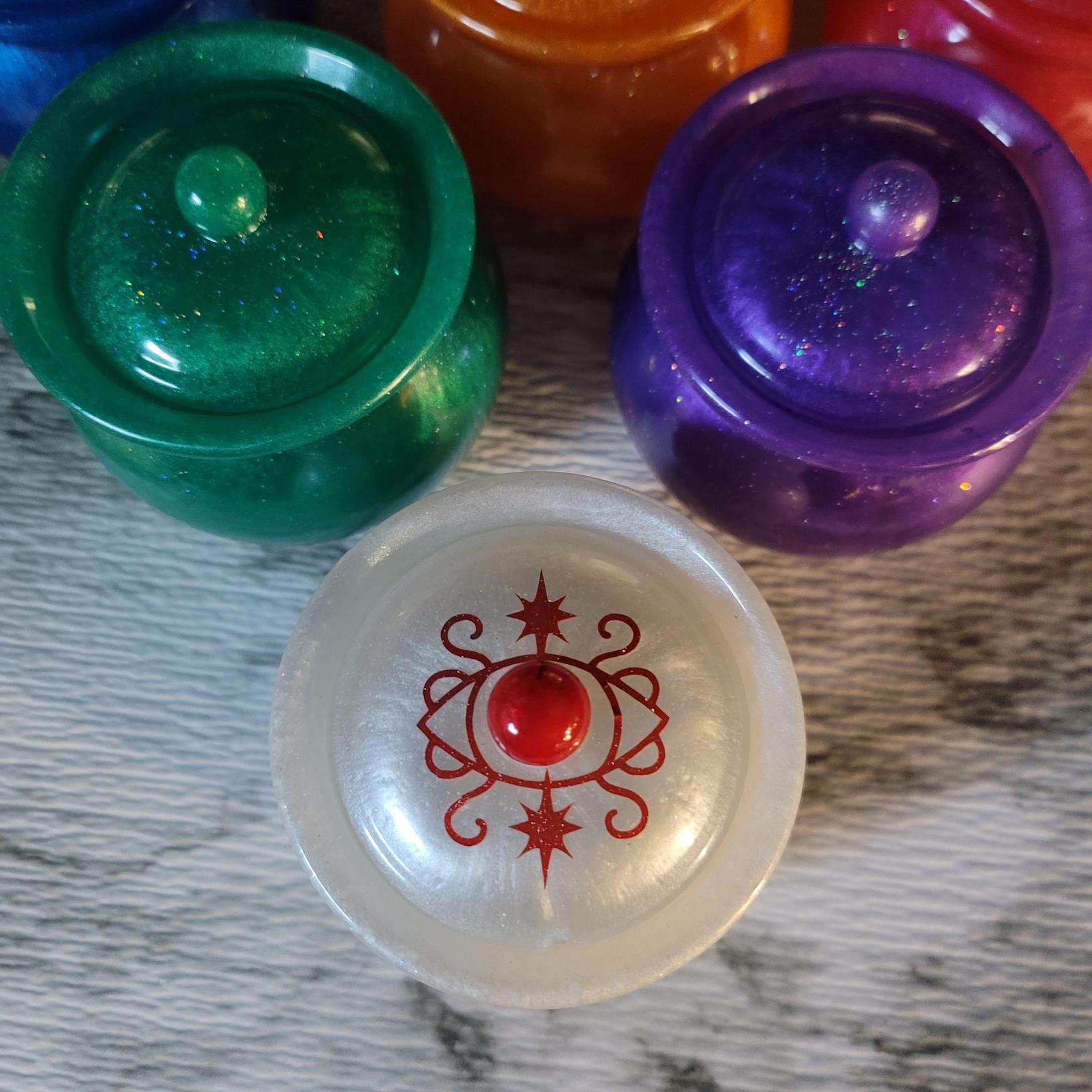 Perfect for holding altar salt, altar herbs for spells, protection spells, moon water, decoration, or any other witchyness that you come up with. It is not approved for food consumption or an open flame. I have tested a 6 hour tealight in the pots and it did warm up and got a little soft, but firmed back up when it cooled. I wont recommend that it be used for a tealight holder, but i did test it and it was ok. i never left it unattended. BUT PLEASE NOTE.. these resin jars can burn or could catch fire with an open flame. So, if you do decide to use a tealight in them, it is at your own risk. I use mine to mix my smudge ashes in with my sea salt to make my black spell salt.