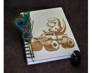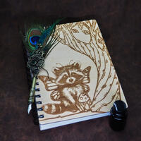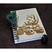 First wood has to be prepped and painted, any color effects must be made during this point. Then, after putting together the design, it is engraved with a machine and cut to the specific size for the book. It is then sealed for durability and longevity. Last, it is bound onto the wire binding and ready to be shipped to you.