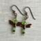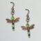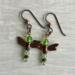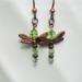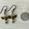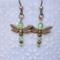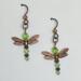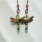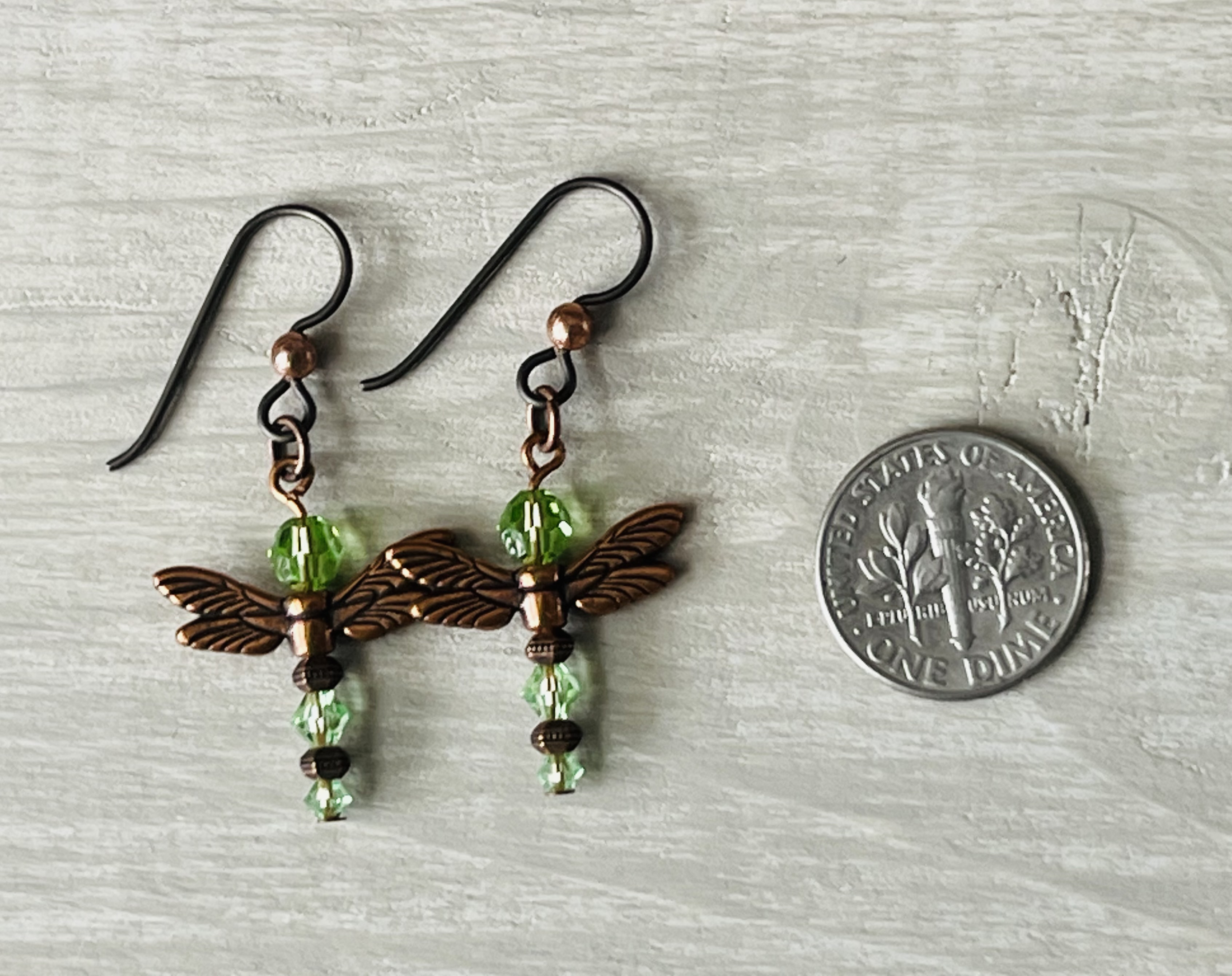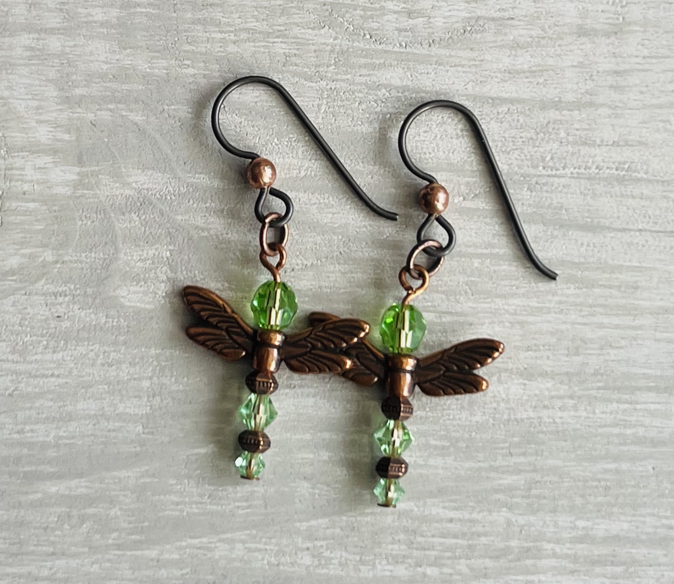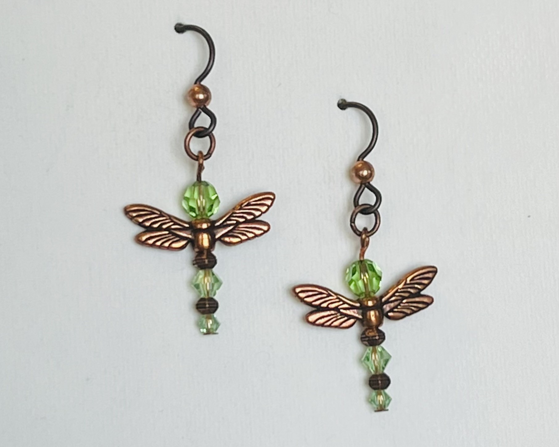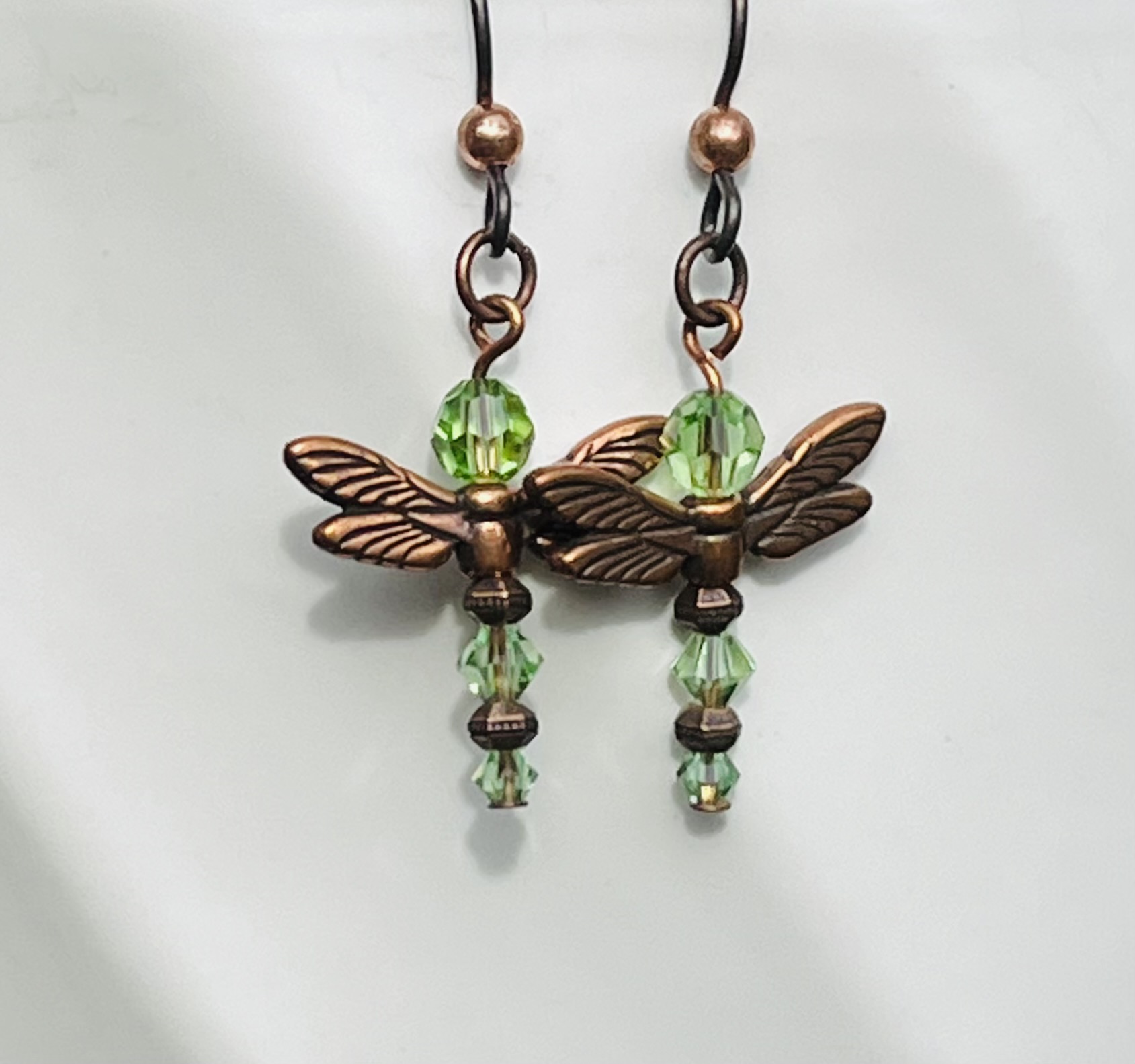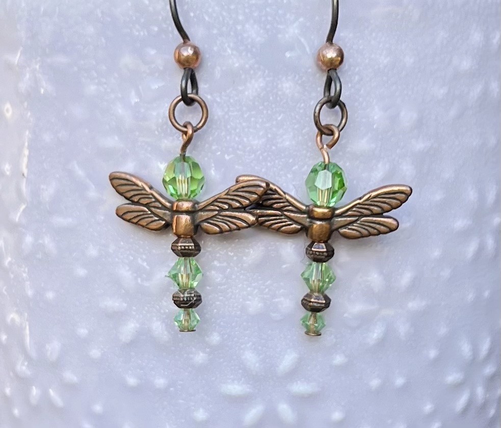 A pair of copper-winged dragonflies ready to take flight. Their bodies are made with shimmering peridot - green crystals and copper beads.