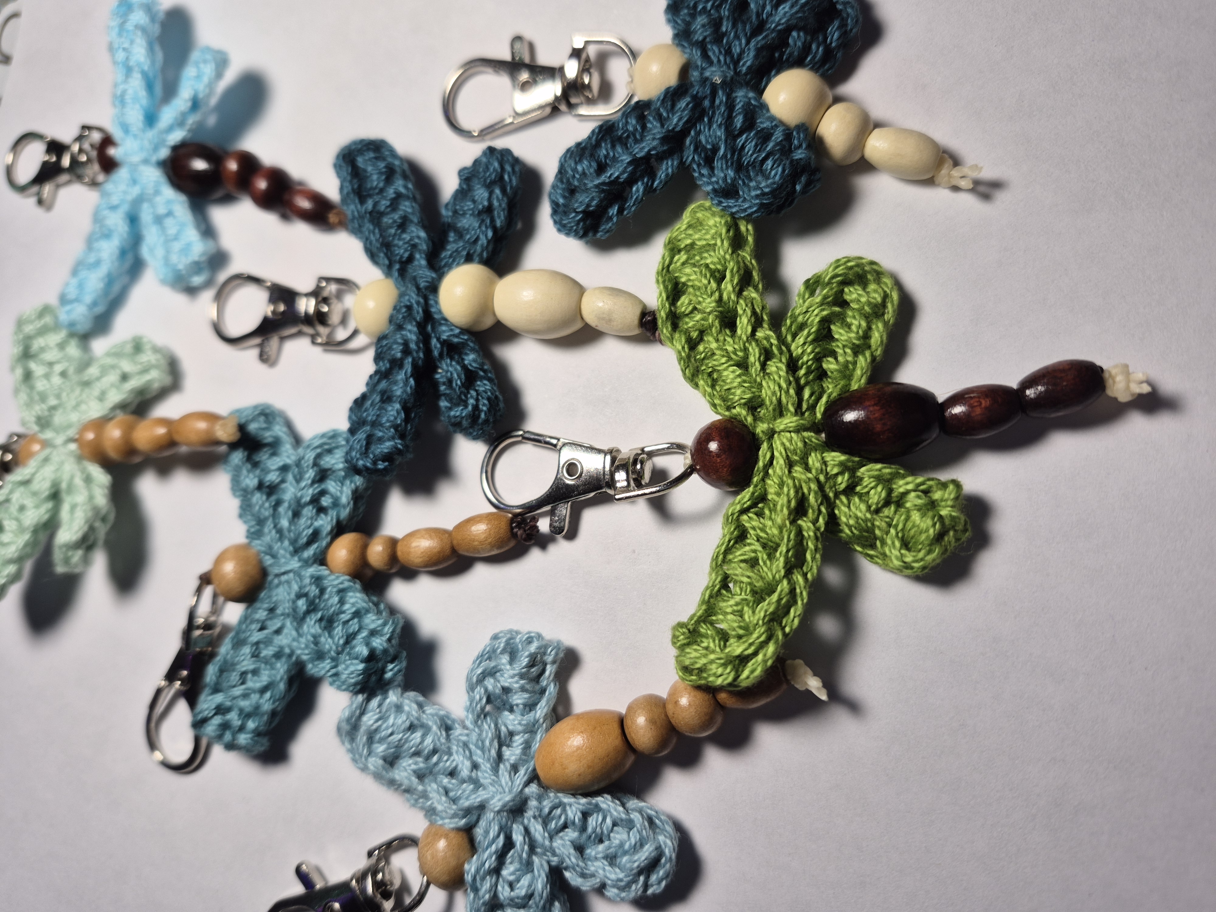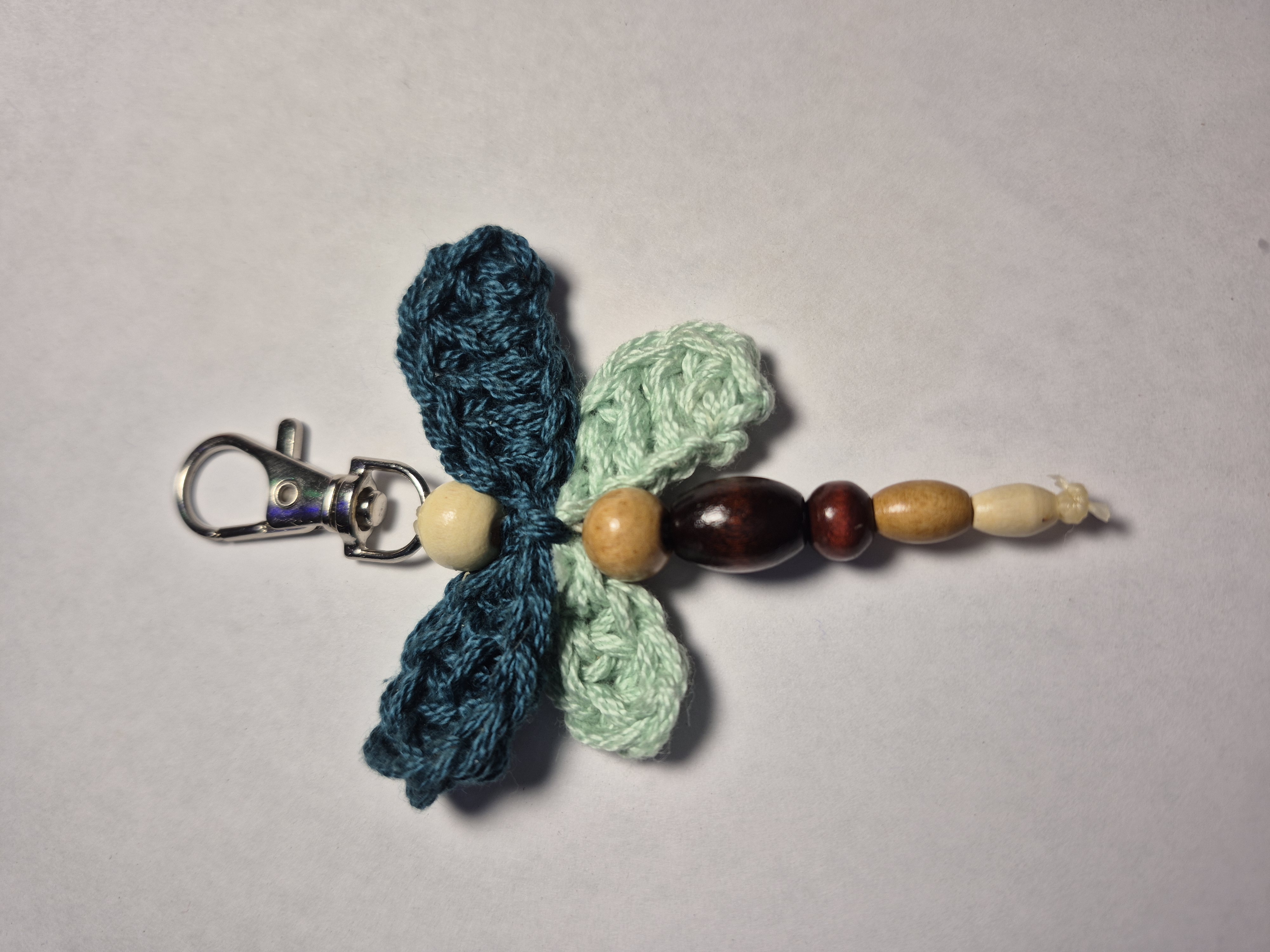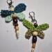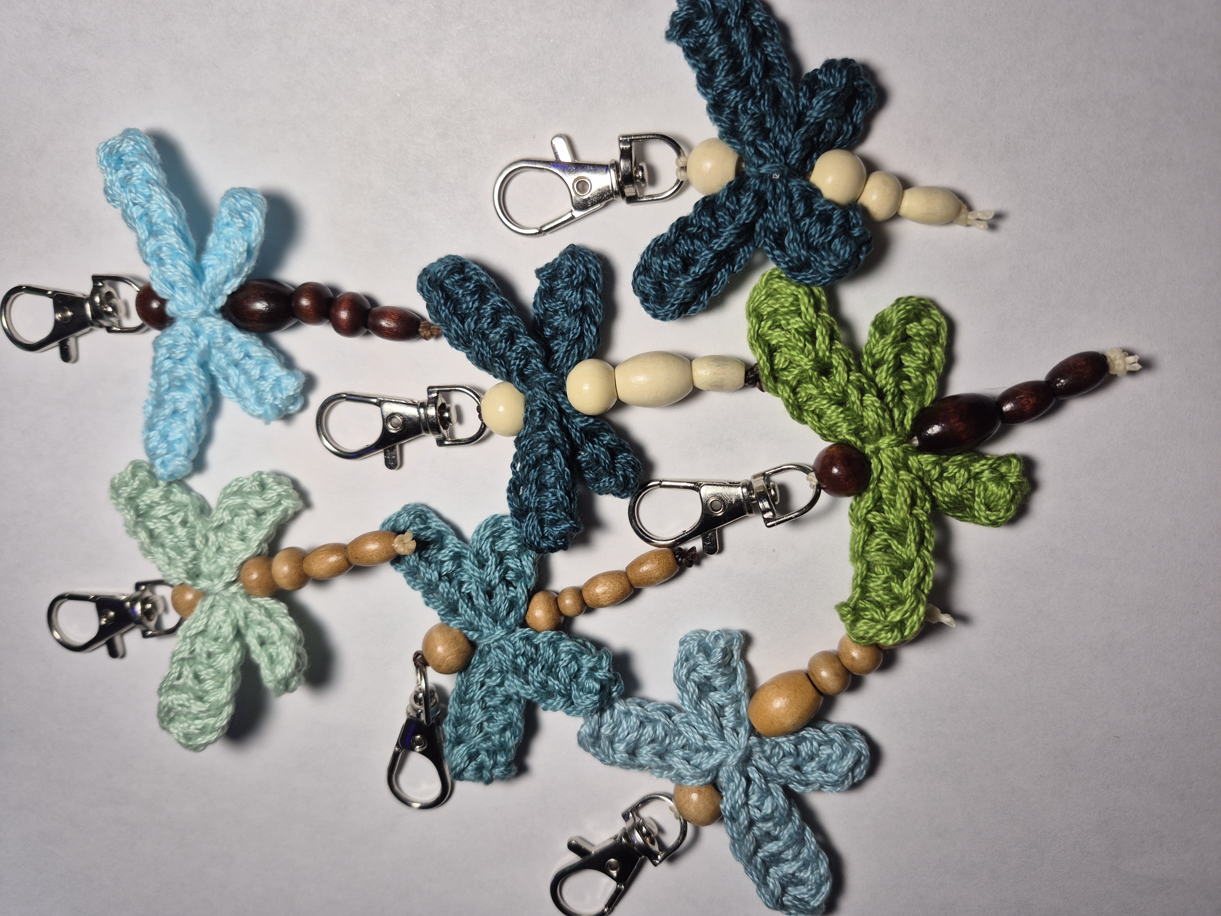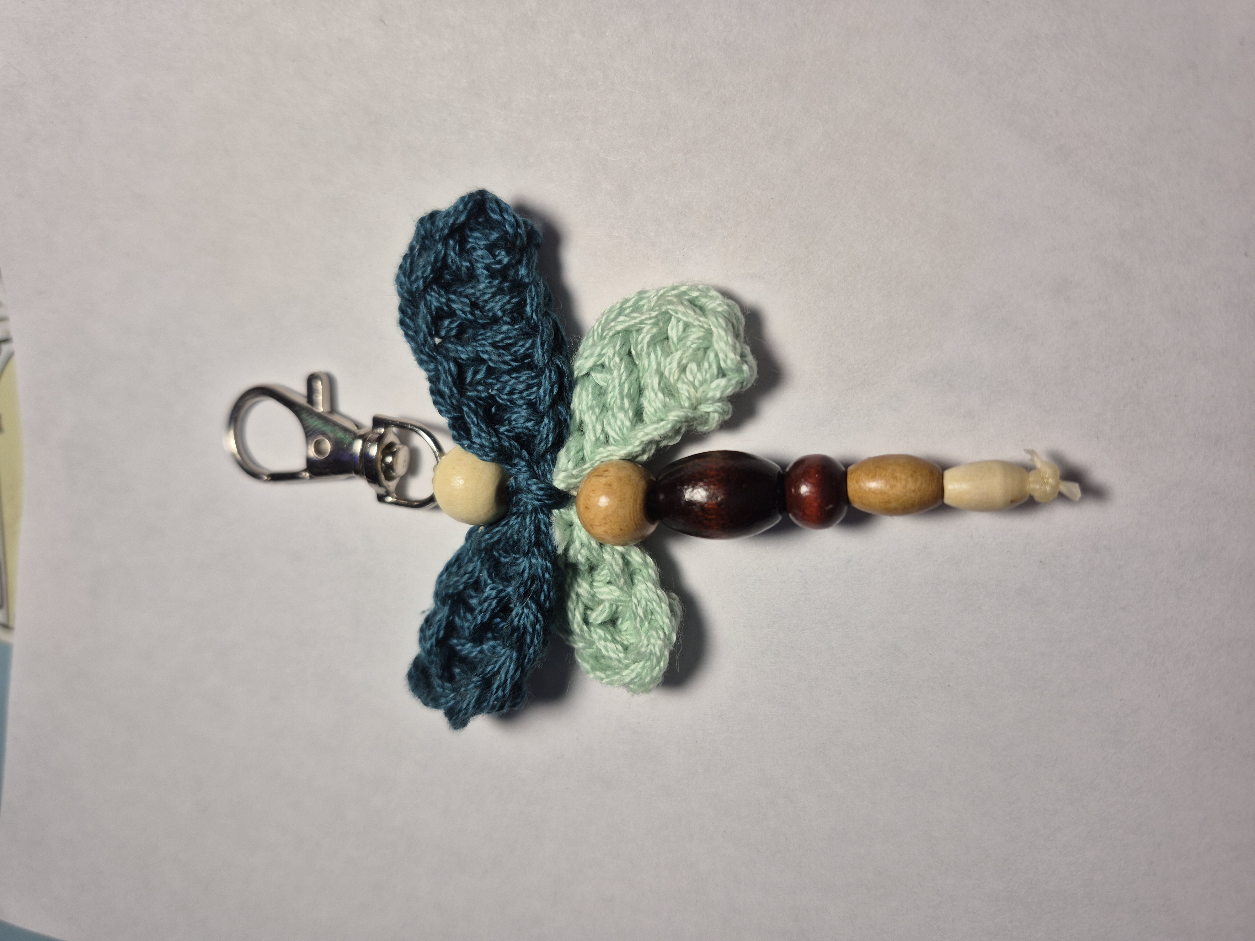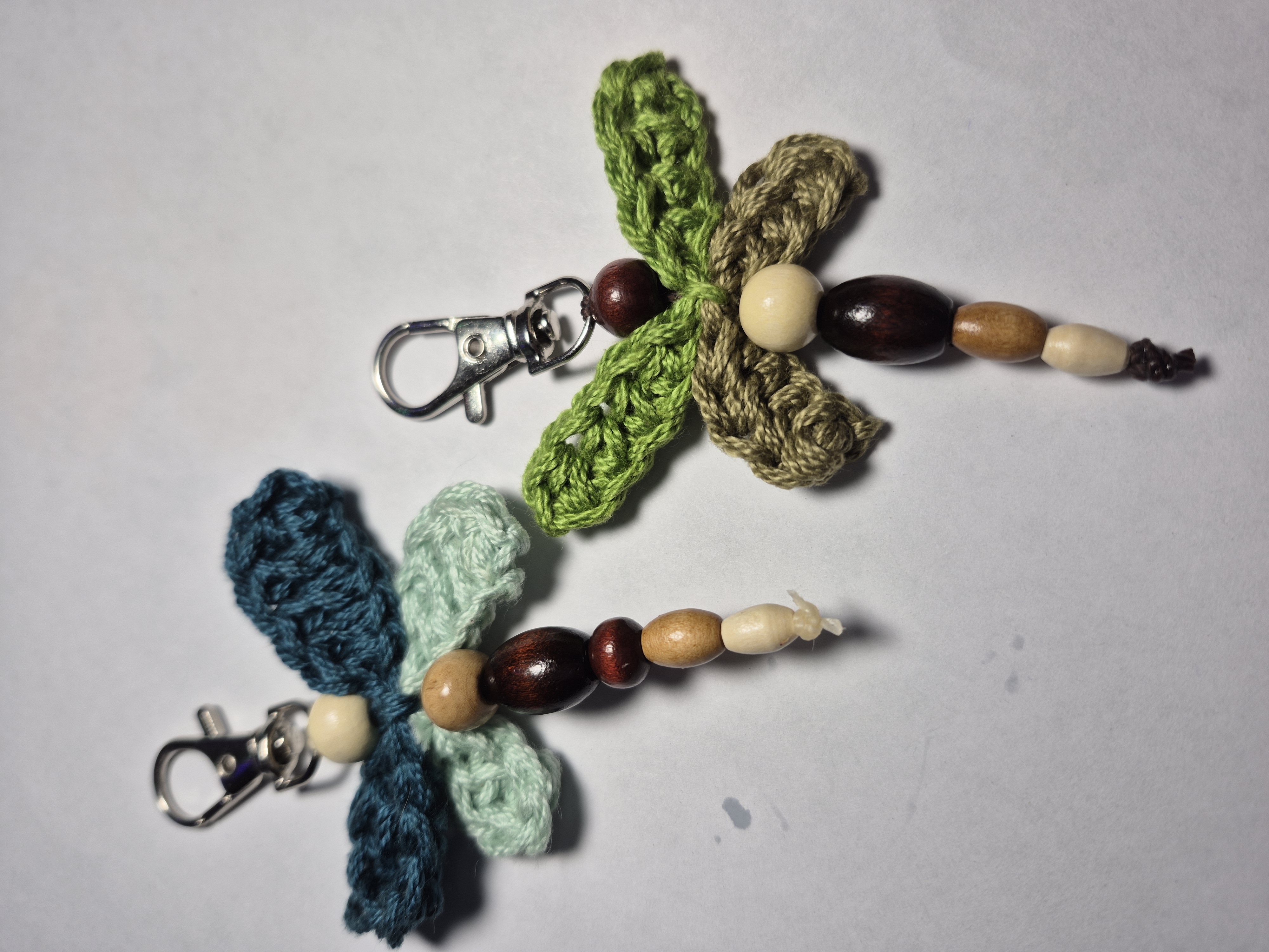 These are cute dragonfly keychains or bag charm. Made with cotton yarn and wooden beads on wax cord with keychain clip.