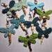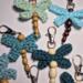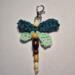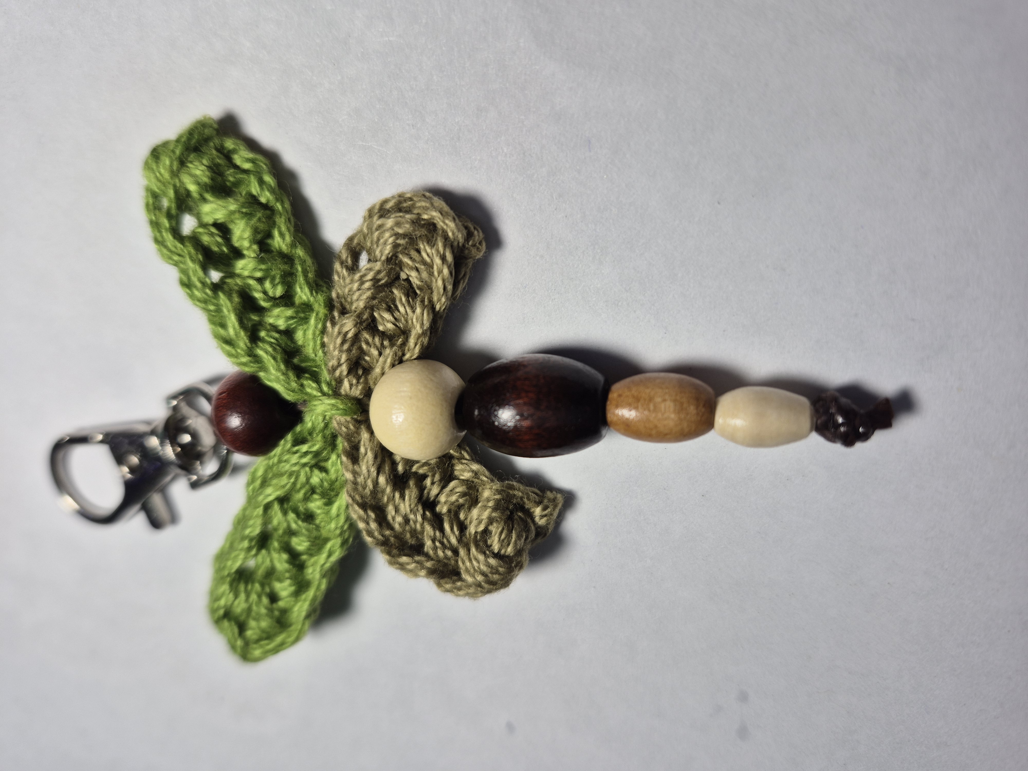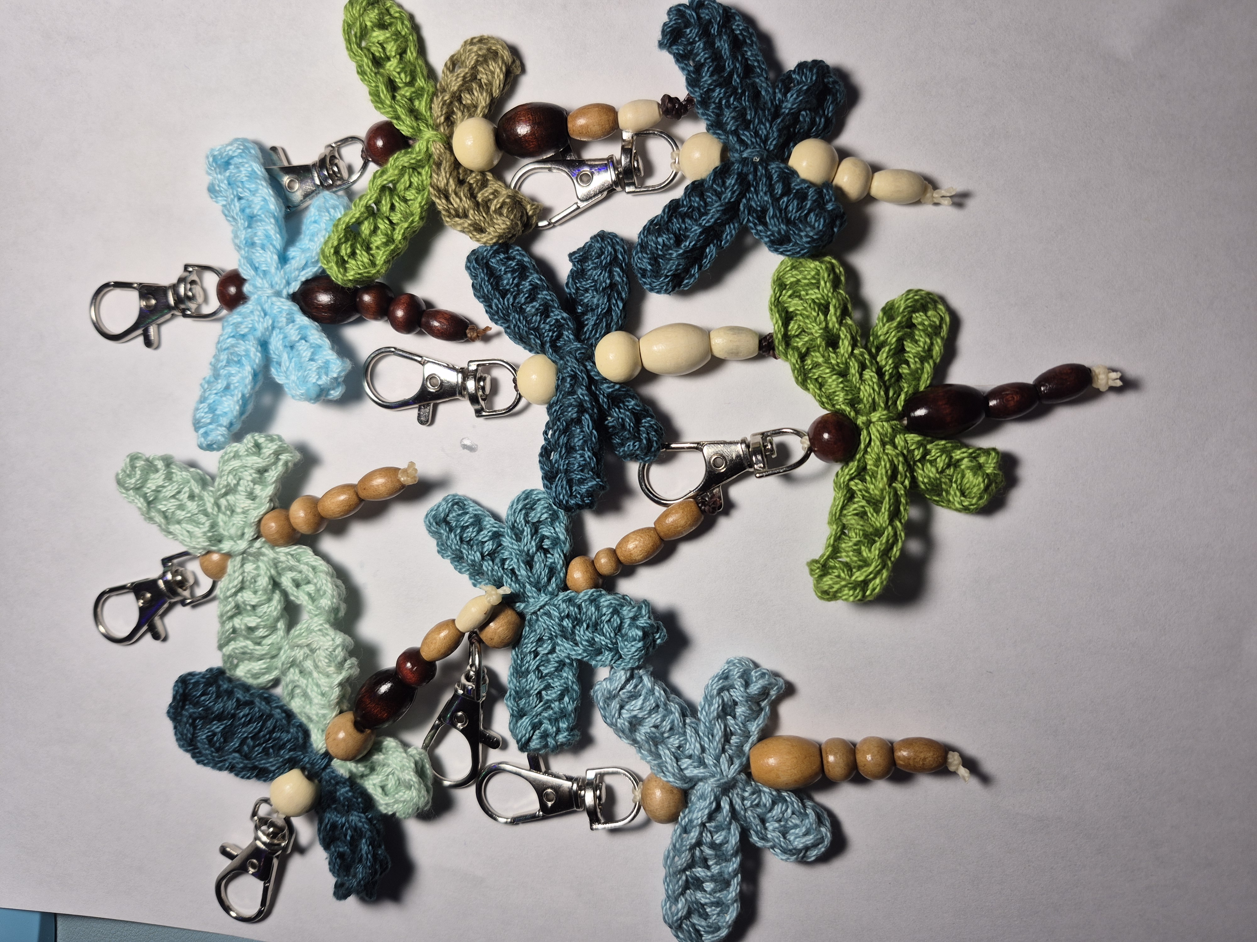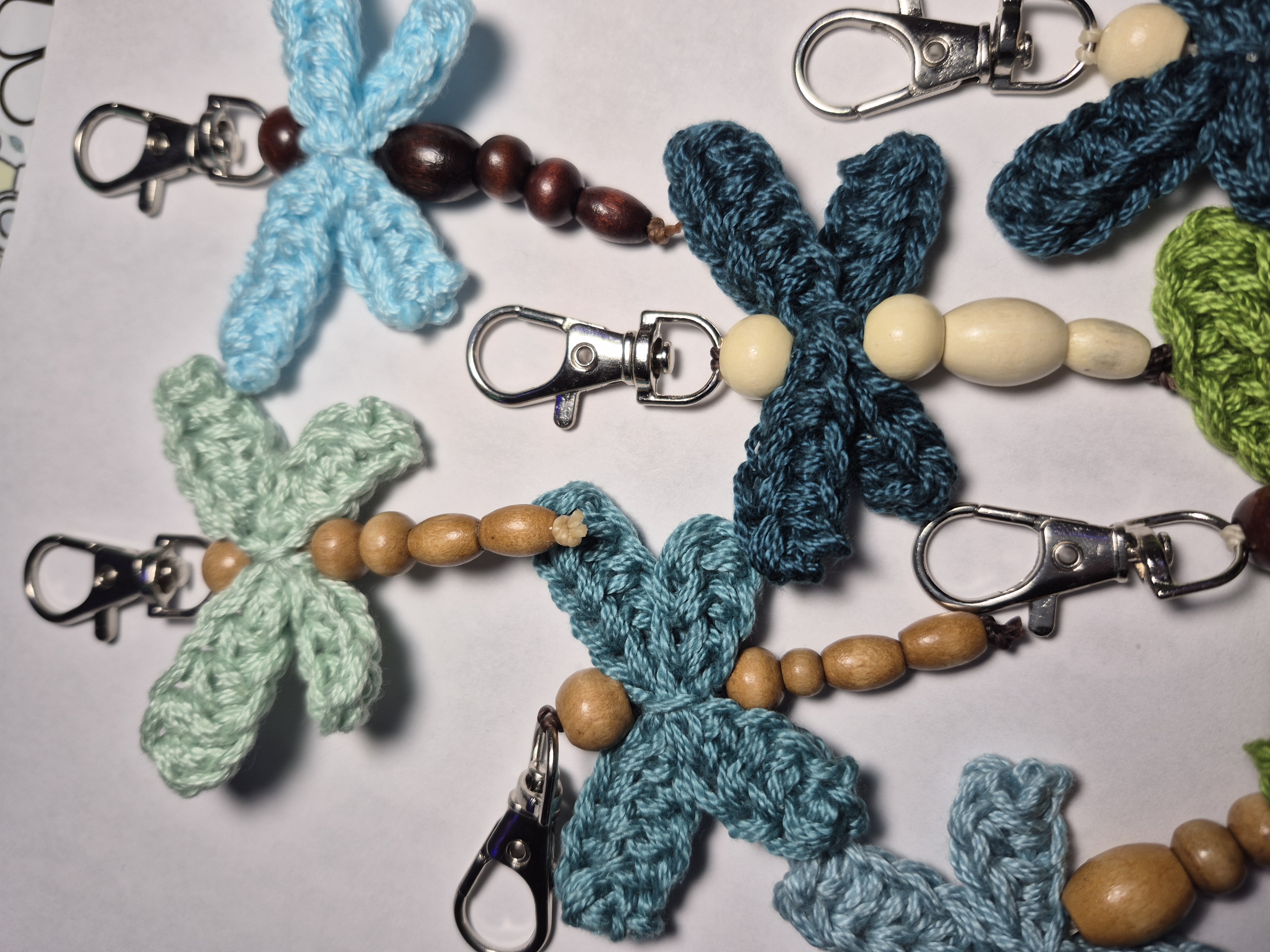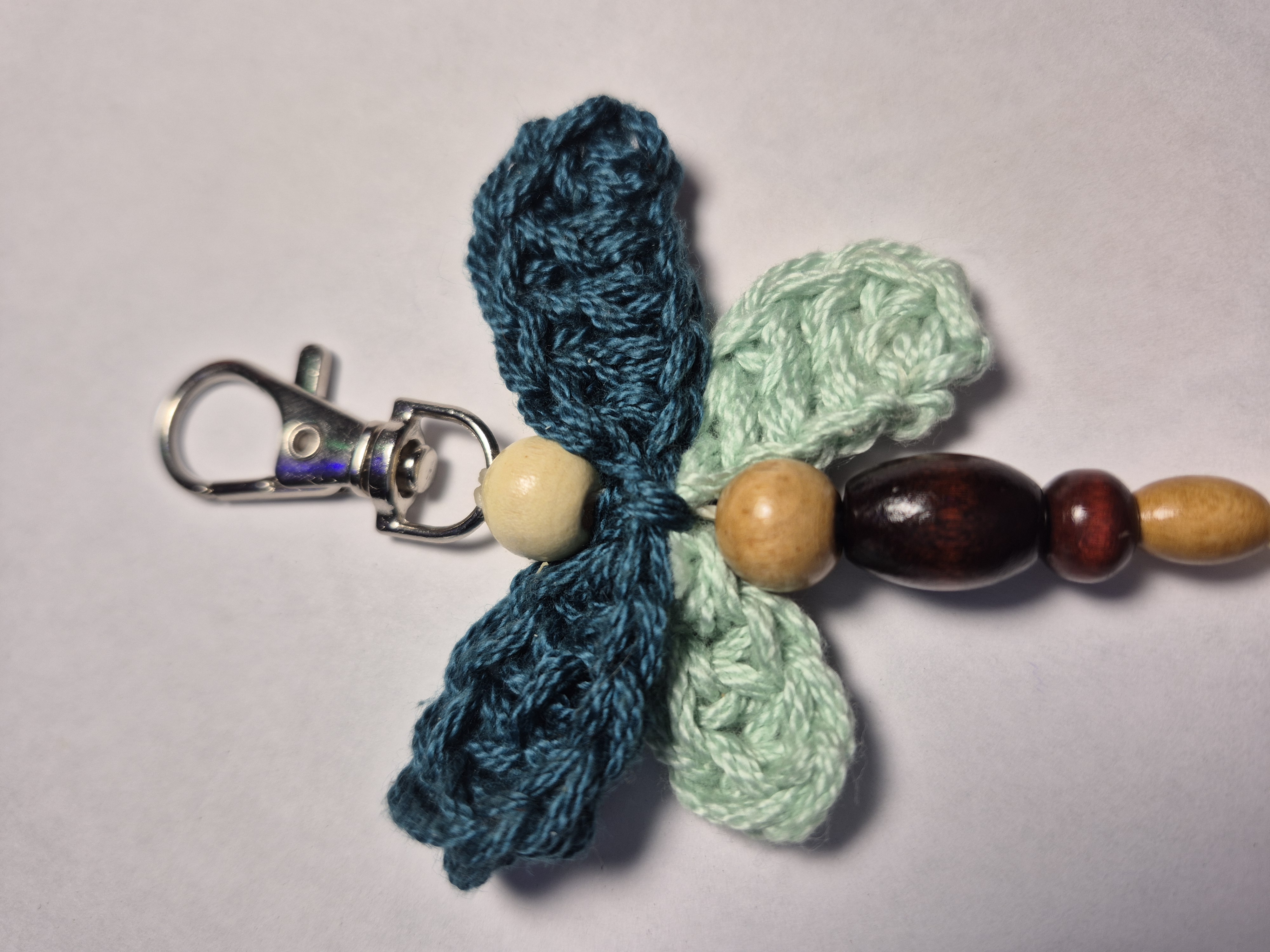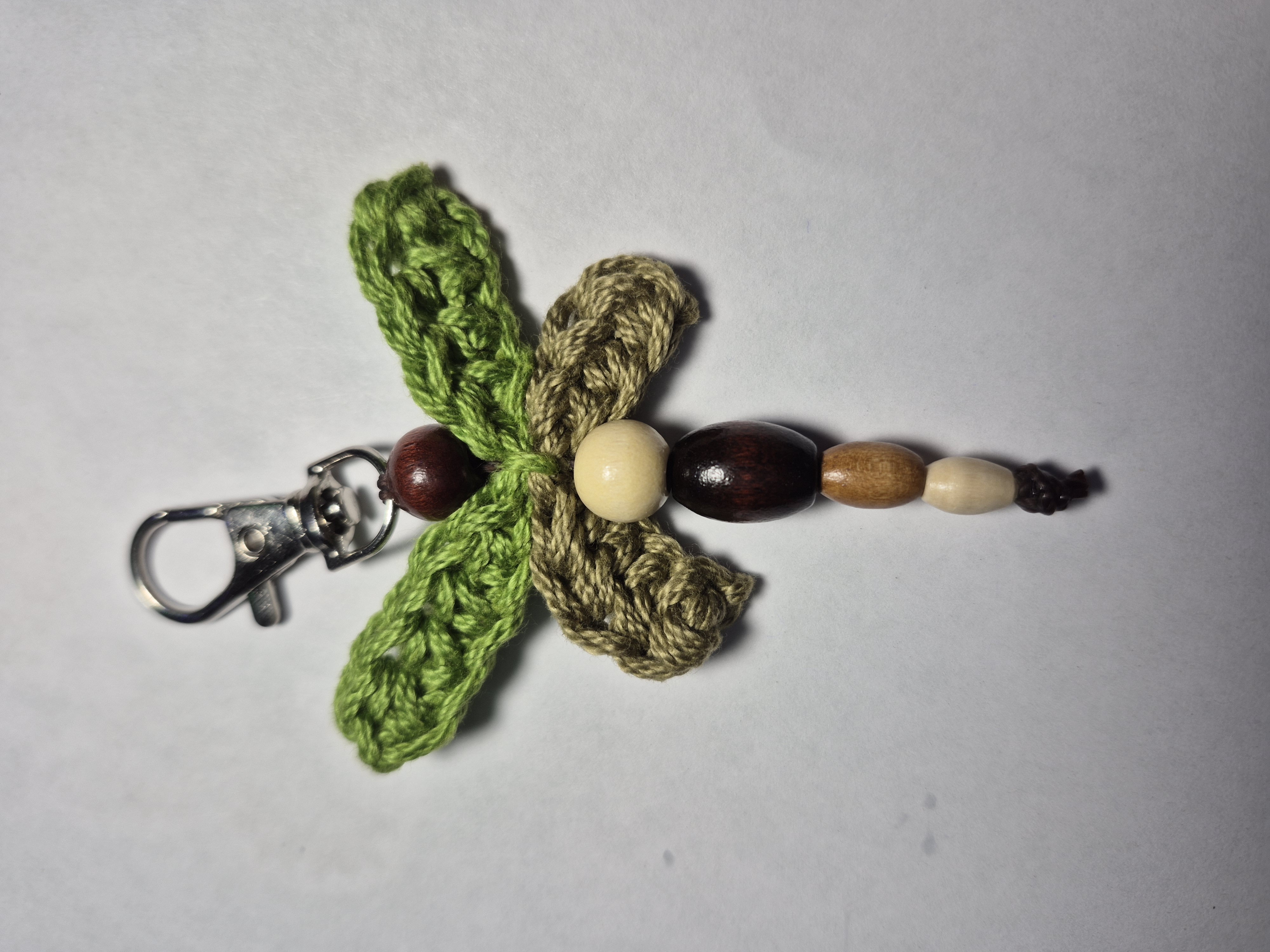 These are cute dragonfly keychains or bag charm. Made with cotton yarn and wooden beads on wax cord with keychain clip.