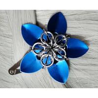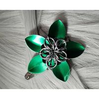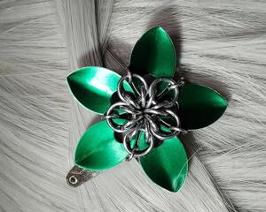 Chainmaille Dragonscale Barrette - Orange. Made with anodized aluminum rings and scales. Lightweight. Attached to a snap barrette.
