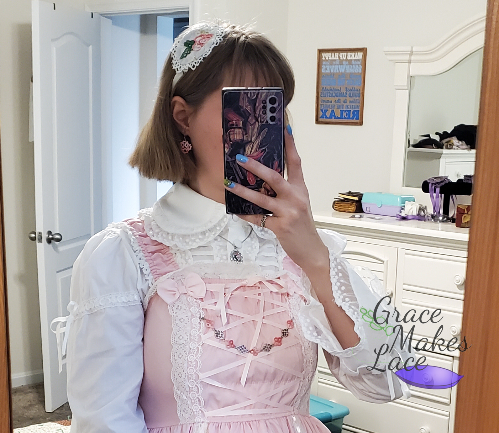 The second photo is me wearing the sample piece for an example of it in an EGL sweet/oldschool coordinate.
