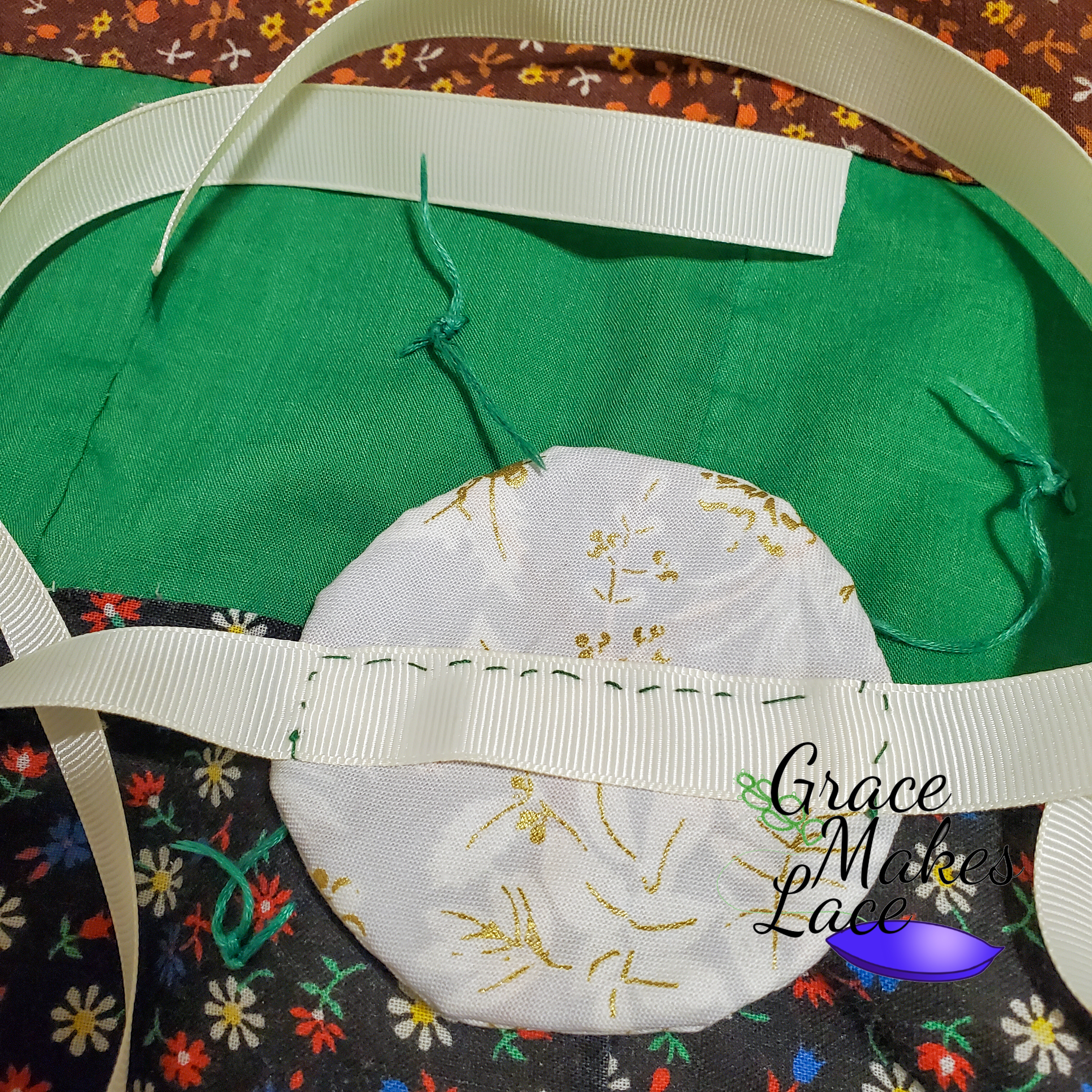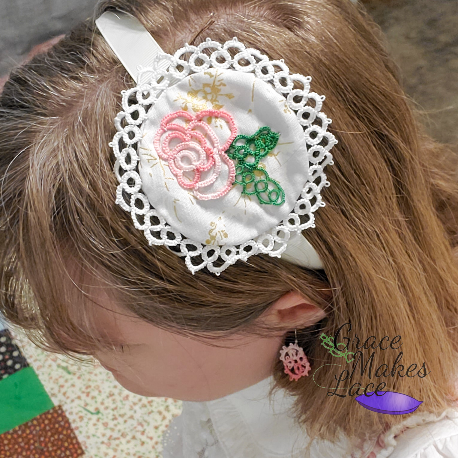 This headdress is entirely hand stitched and the lace is entirely handmade with tatted lace. I melted the ends of the ribbon to ensure they won't easily become unraveled. These headdresses legitimately take a very long time to make, which is why they are made to order. The sample photo has one shuttle tatted leaf(the one lowest below the rose), because I wanted to see if I liked how it looked. In this instance I preferred needle tatted and future headdresses will be made exclusively with that.