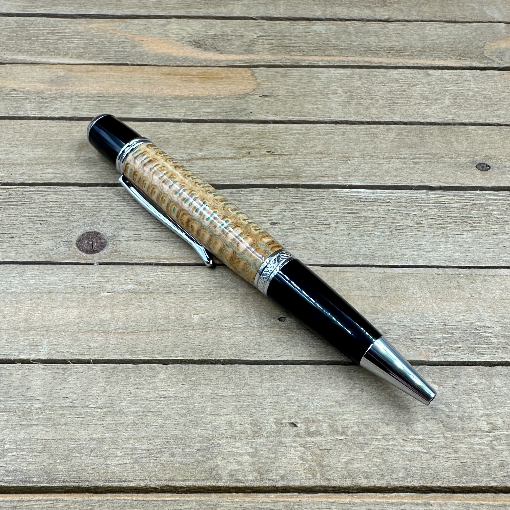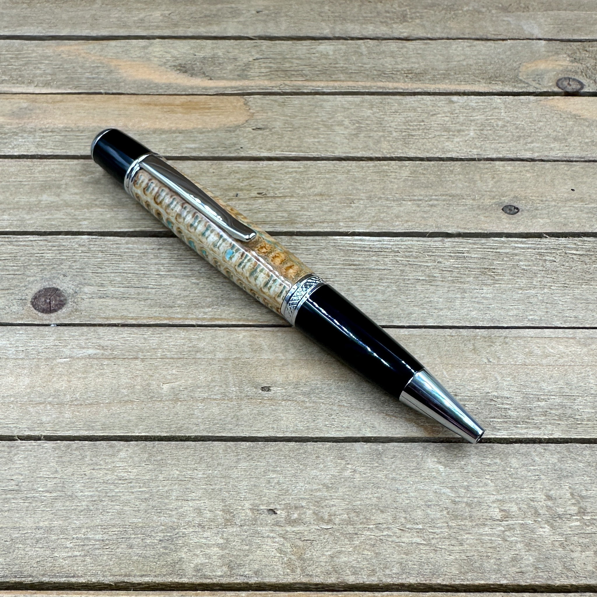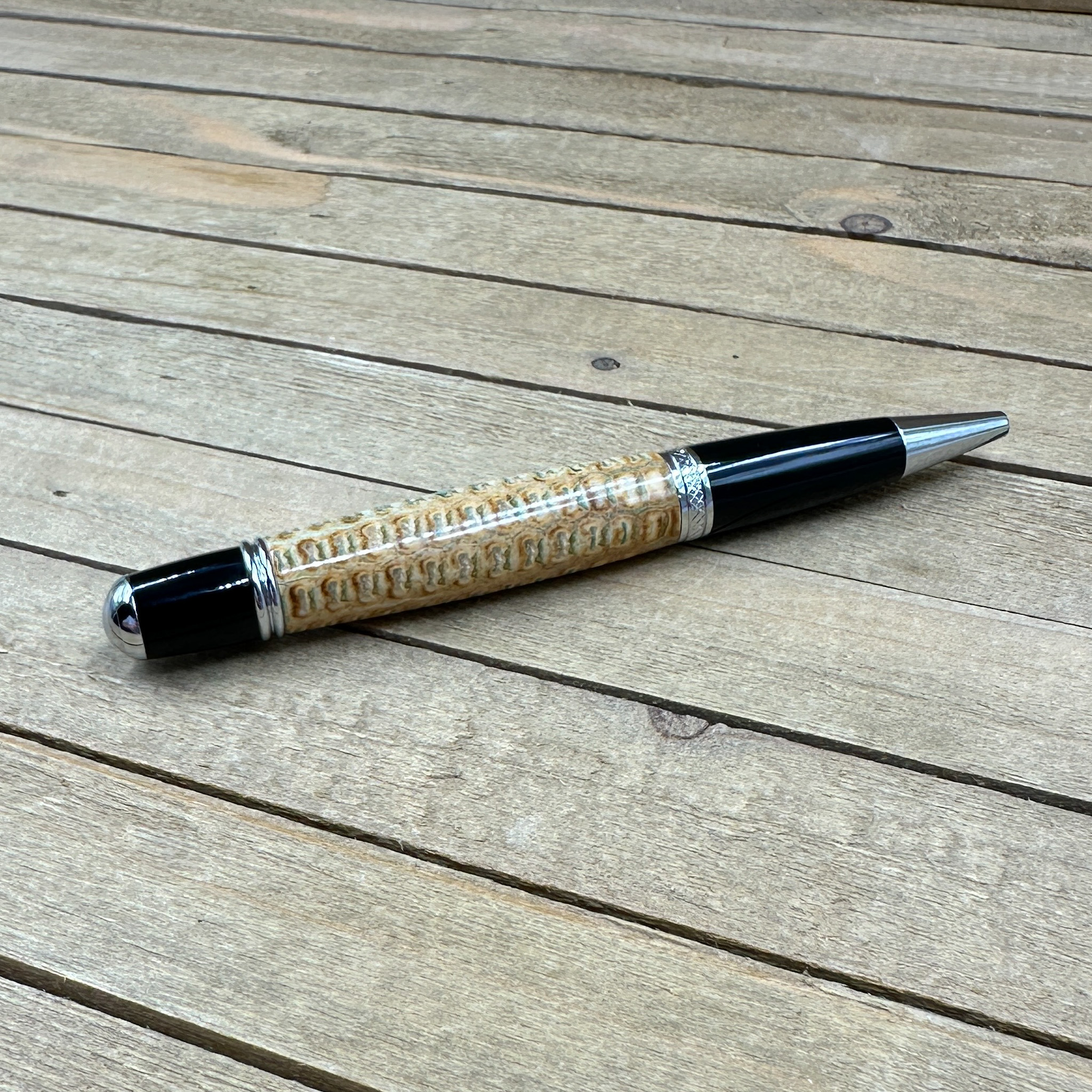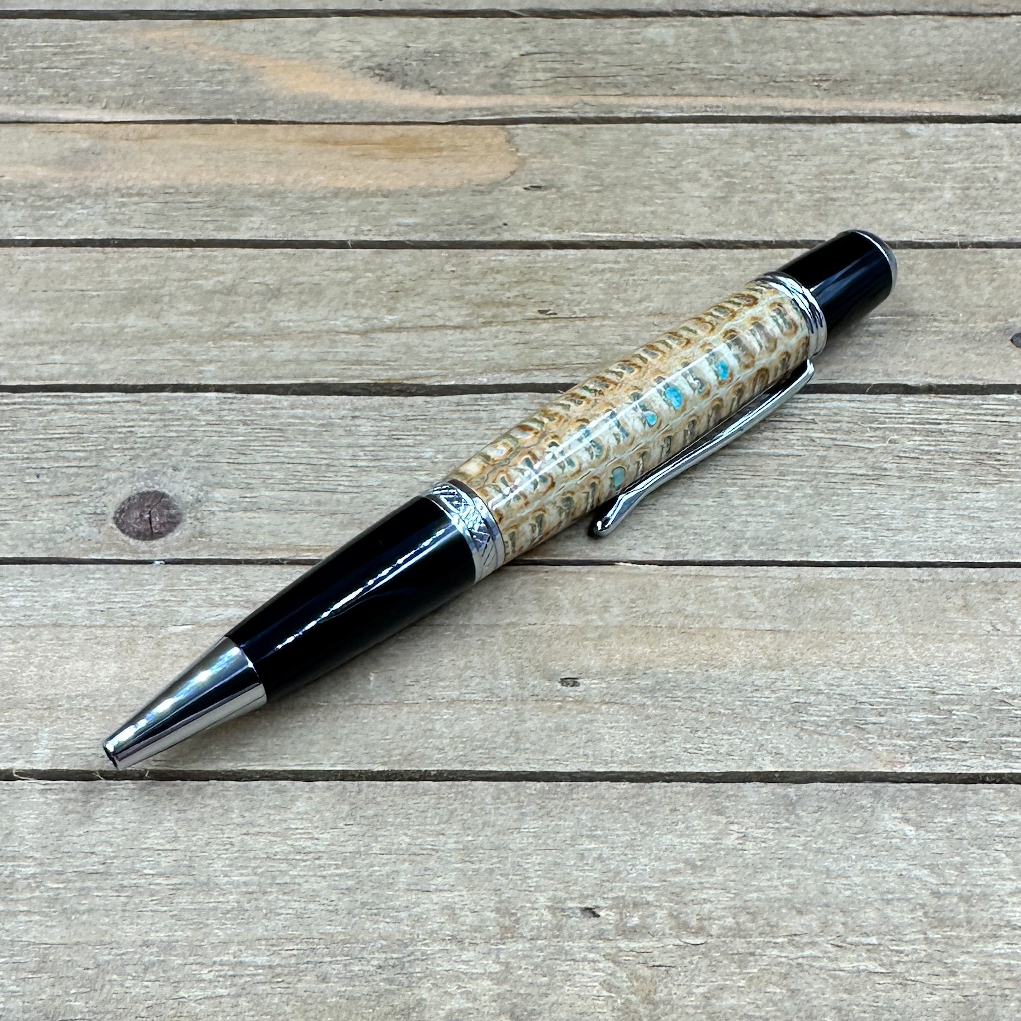 This is a incredible ballpoint twist pen wrapped in a corn cob with a hint of turquoise dye. I found this corn cob at the local corn maze last year with my kids. It was then dried, stabilized, dyed, and assembled to make this unique pen. This pen is finished to a glossy shine that gives it a deep look and protects the corn cob from normal use. The components on this pen are plated with durable bright chrome with black chrome accents. This pen features a parker style refill that has been upgraded to a Schmidt Easy Flow refill in your choice of black or blue.
