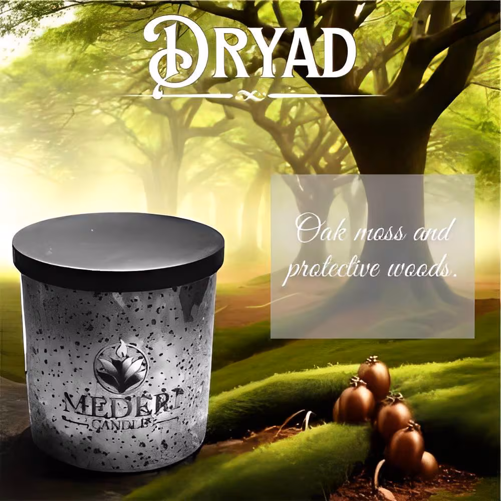 Dryad; inspired by the ancient guardians of the forest, envelops you in a serene embrace. This enchanting candle combines the rich aromas of oak, moss, and dark earth, creating an atmosphere that echoes the timeless wisdom of nature. As the candle burns, it releases the essence of Gaia's magic, grounding your space with the tranquility and strength of the woodland realms. Each Dryad candle is hand-poured with care, ensuring a unique and personal touch that honors the earth from which it draws its inspiration. Each candle has been meticulously handcrafted. We test each candle type before sale to ensure quality and end user satisfaction. We use 100% USA sourced fragrances and soy wax which is longer burning, easier on the respiratory system for pets and humans. This specialized wax produces almost no soot.