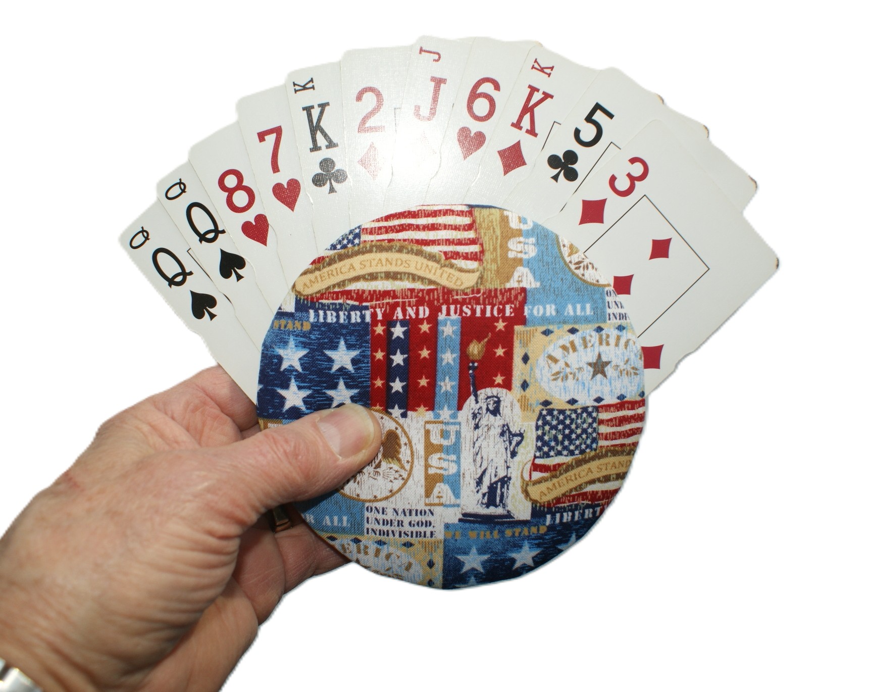 But while we were there I discovered that many retirees loved to play card games. However, I also learned that there were many who had problems holding the cards due to hand issues, way too many cards, etc. So I decided to set out to find a solution. After many trials and errors, I came up with a prototype which, after consulting with my wife (who has done quite a bit of sewing and quilting) I improved upon and set out to test my "invention" at craft fairs. To my surprise, they went over so well that I actually sold out at my first one! I quickly made more that evening and participated in another craft fair where I just about sold out again.