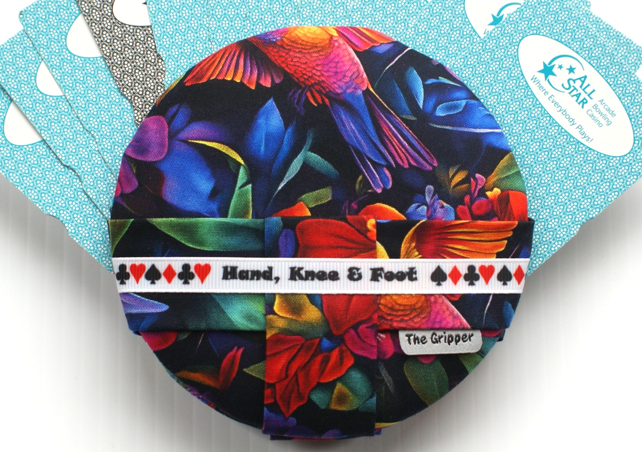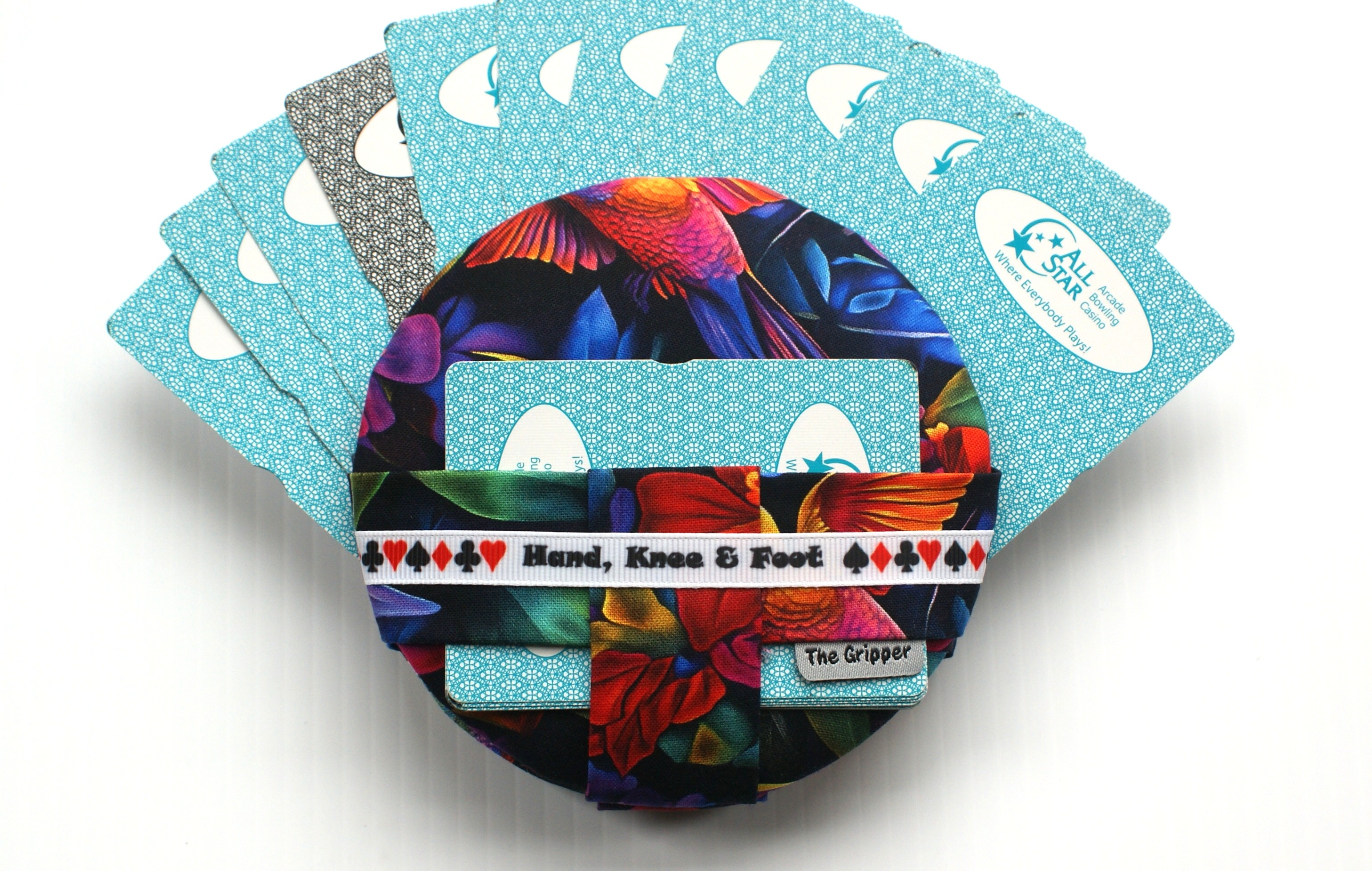 Here's how this unique playing cardholder works: Like all my Gripper playing cardholders, your "Hand" is held in the main holder by inserting the cards one by one between the two halves. Your "Knee" is kept in the pocket designed for it on the front of your cardholder, and your "Foot" is held in the convenient pocket on the back of the holder! (Please refer to the photos.)