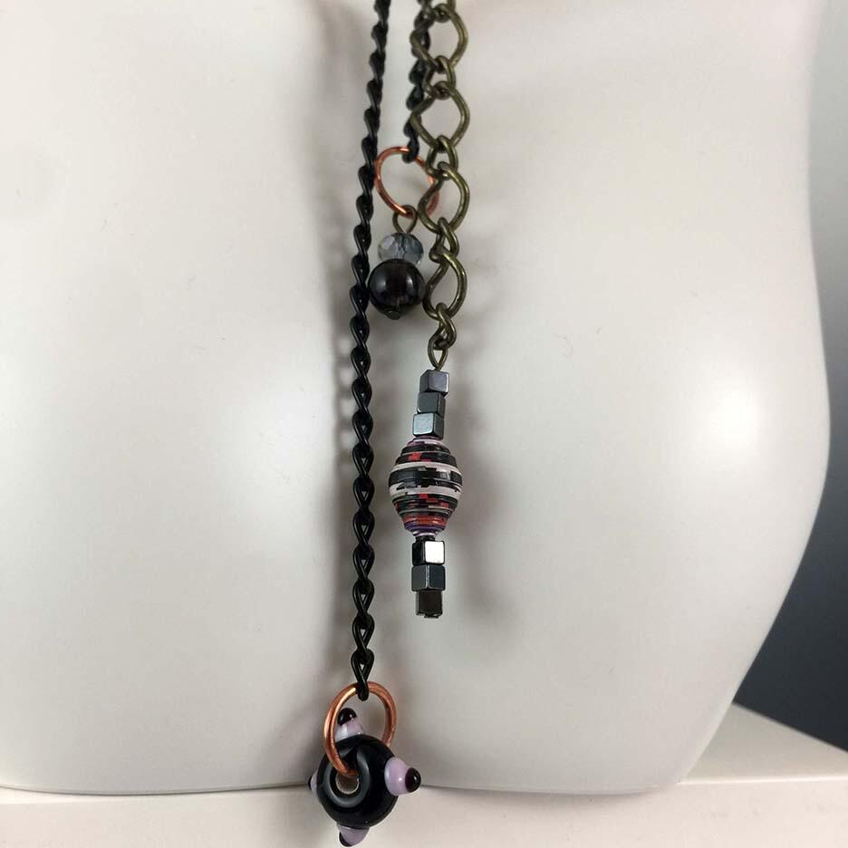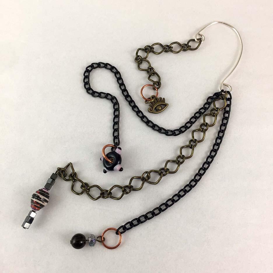 Handmade ear cuff with long chain attachments. Contains silver and gold plated metals, as well as handcrafted paper beads (by yours truly). Handmade glass beads, semi-precious stones (smoky quartz and hematite), and crystals finish off the design.