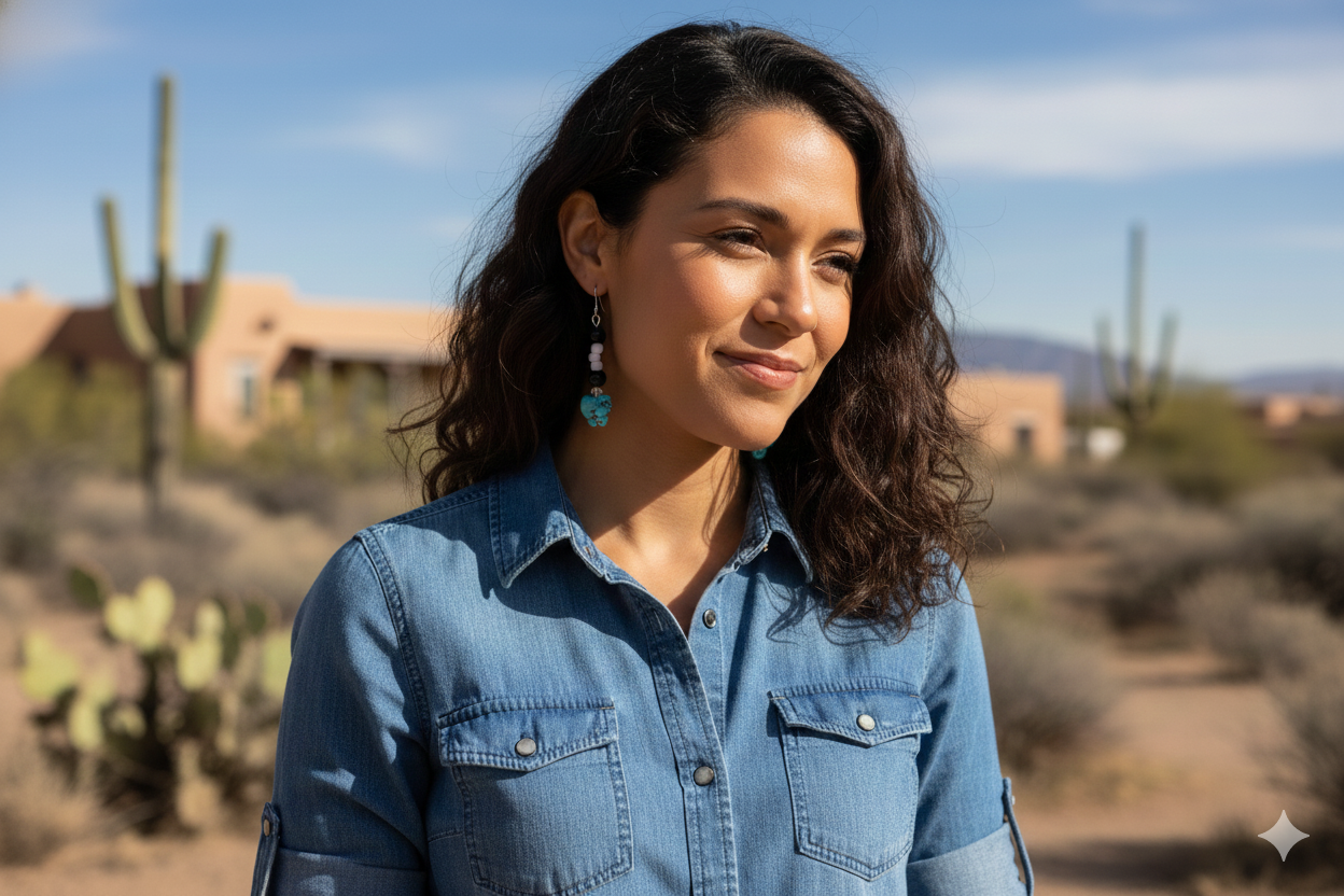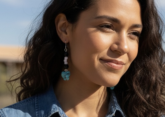 These earrings have white seed beads and black round beads with a 1/2” turquoise stone. These earrings go with just about anything and give a casual/friendly/southwest vibe. Great with dark outfits and/or blue jeans! Necklace and bracelet are available separately in other listings, or as a set.