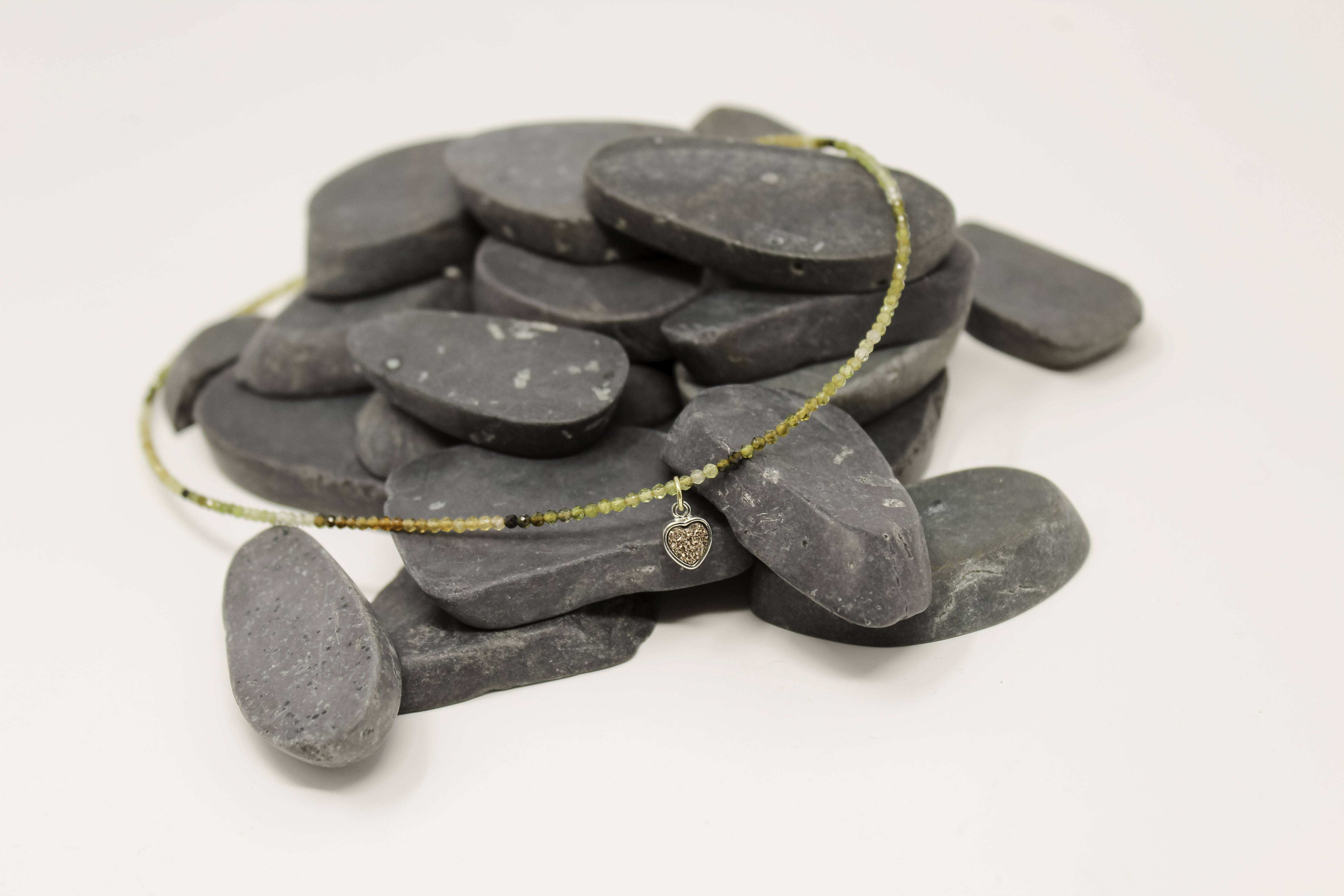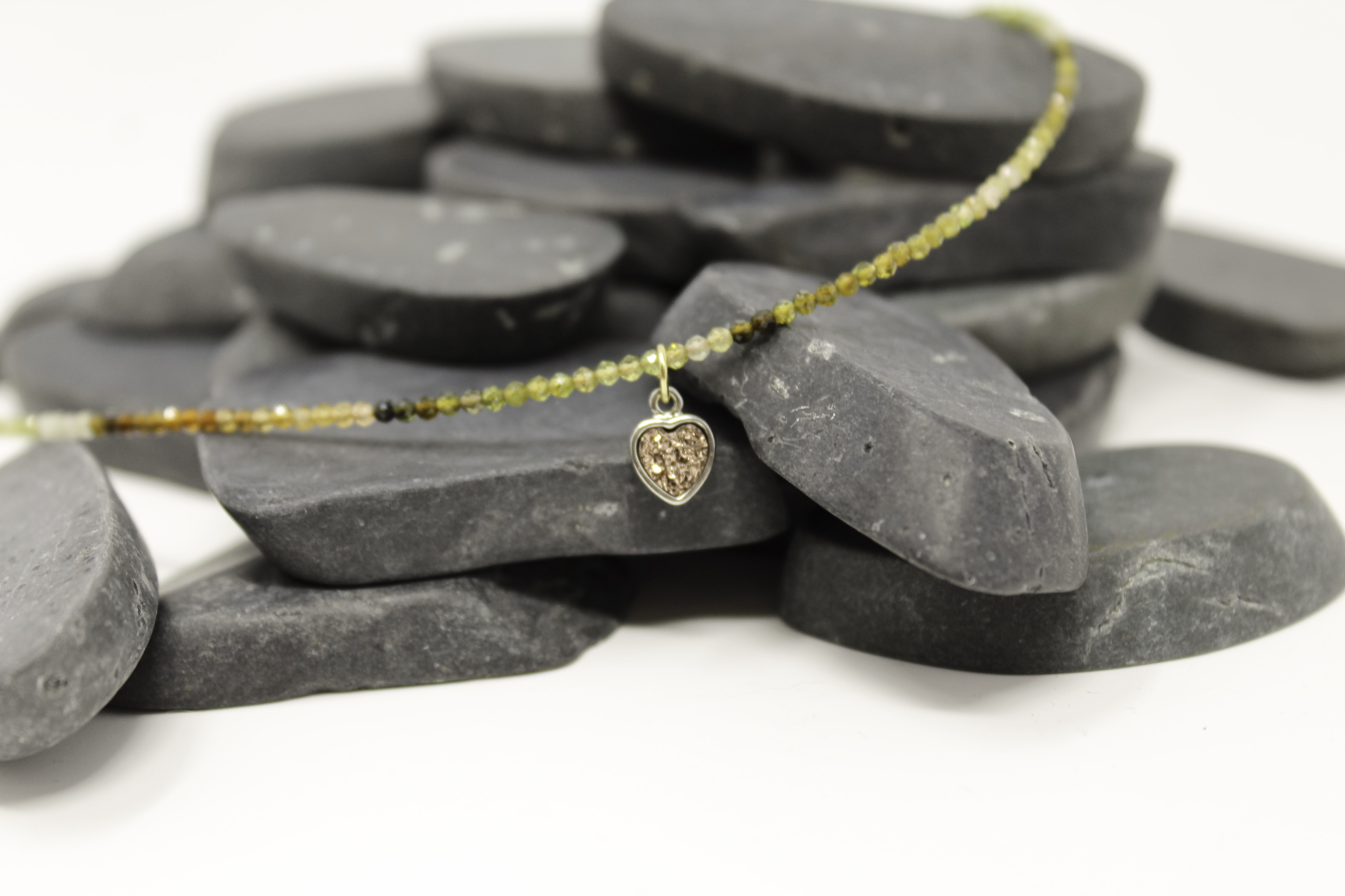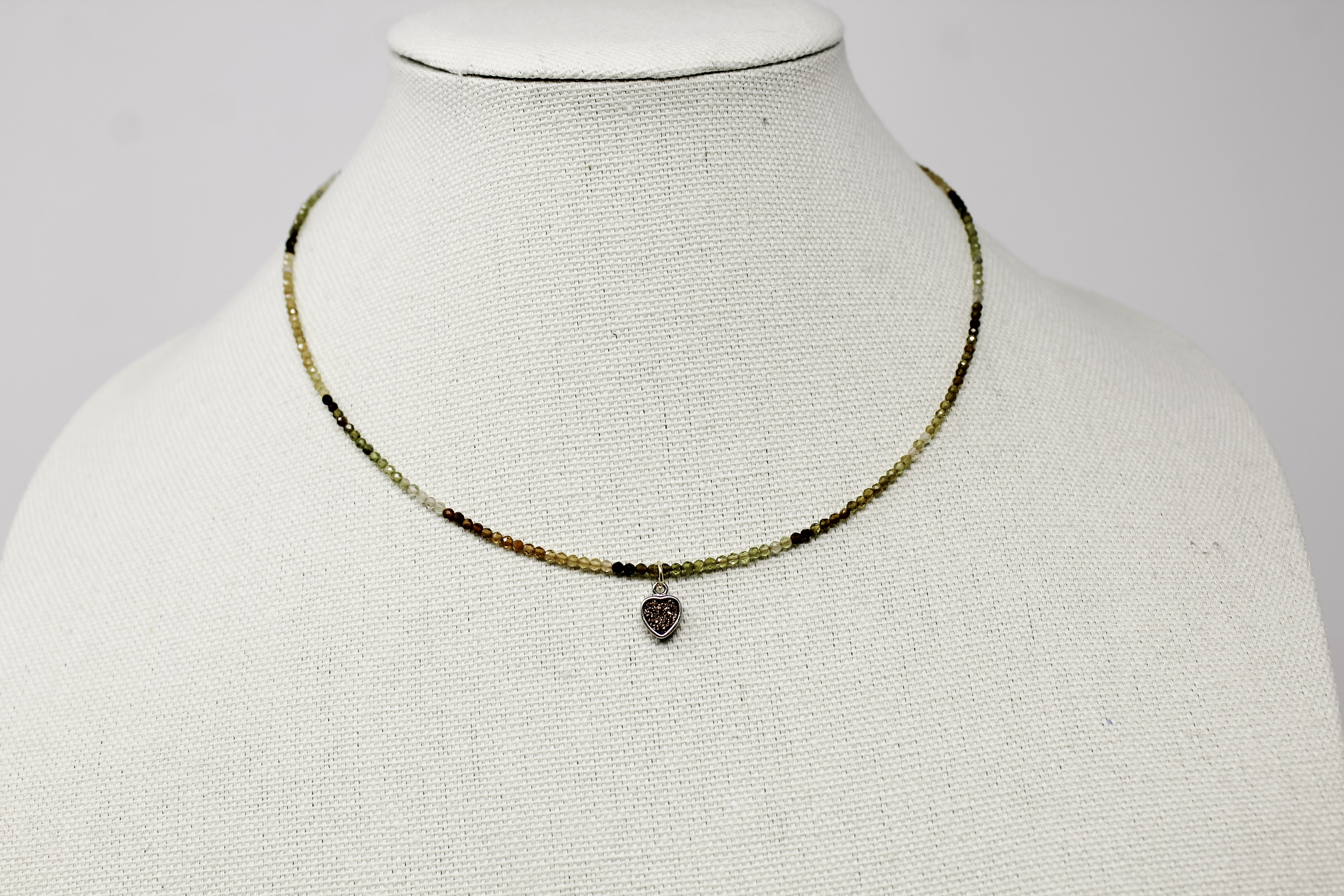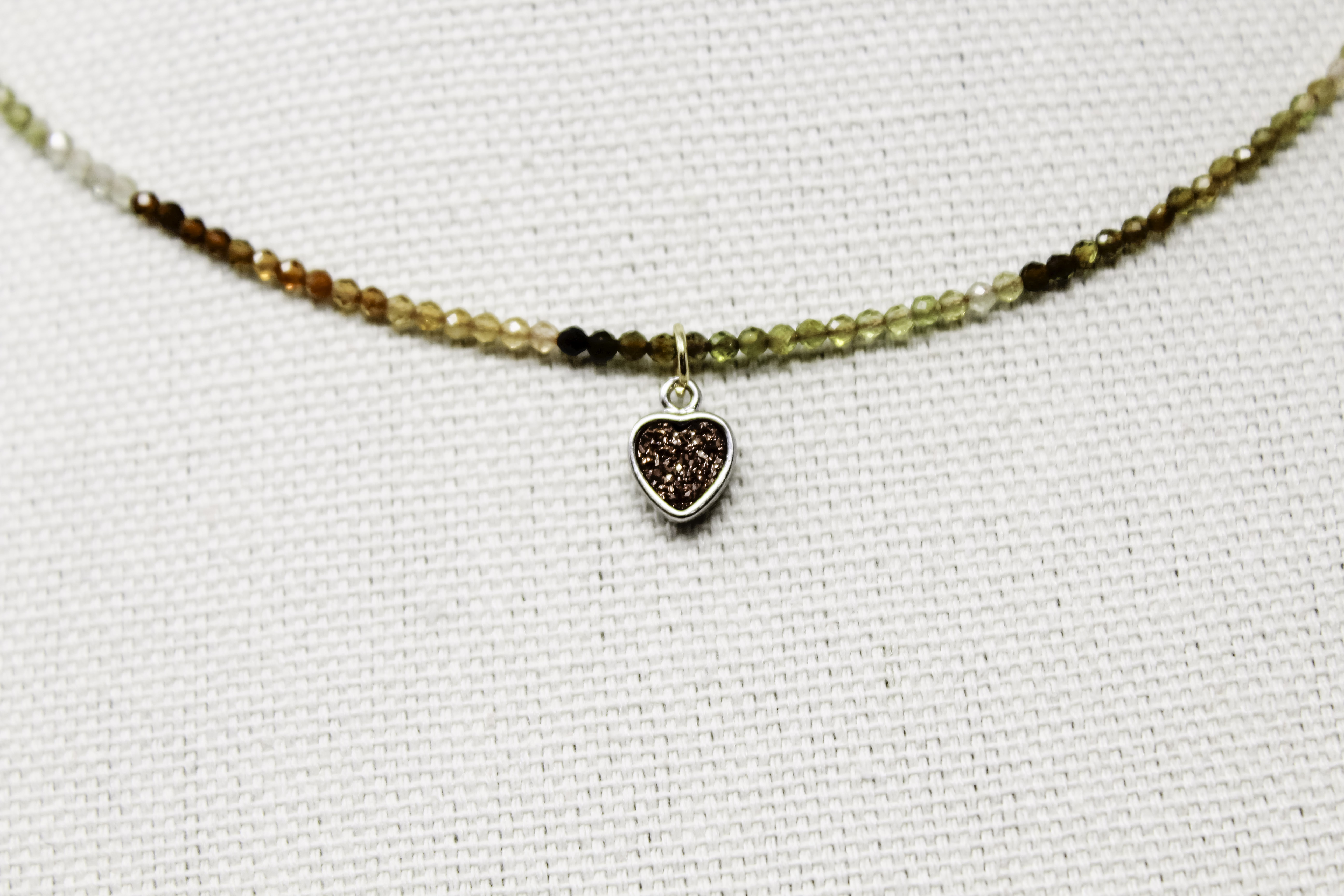Stunning earth-tone micro-faceted tourmaline with a dainty druzy heart charm. Necklace measures 17 inches.