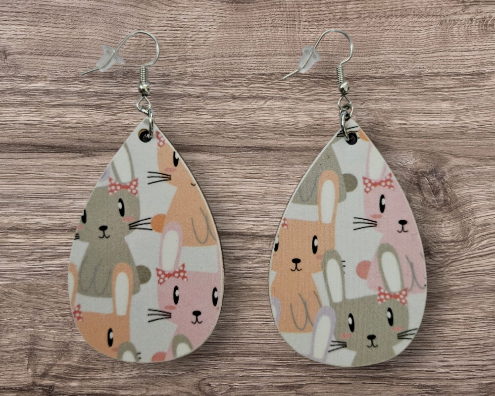 Hop into the season with these adorable Easter Bunny Wooden Earrings! These lightweight, handcrafted earrings feature a charming pastel bunny pattern, making them the perfect springtime accessory. Each earring showcases cute bunnies with dainty bows, adding a whimsical and festive touch to your outfit.