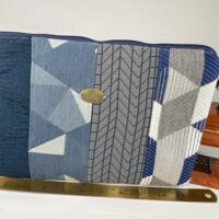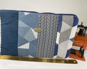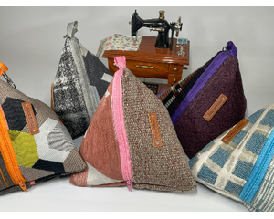 I use sample upholstery fabric swatches. These samples must be removed from the fabric boards, staples removed, and paper backing peeled off. This can be a tricky and time-consuming part of using upholstery samples. I select samples that complement each other and are approximately the same size. This way I have little waste. The size of the sample dictates the final size of the pouch. I sew together the fabrics and add a zipper then topstitch for reinforcement. These pouches are stylish and an eco-friendly way to carry essentials.