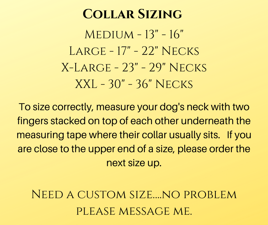 OUR SIZING CHART IS LOCATED IN THE PHOTOS.  PLEASE MEASURE YOUR DOG'S NECK OR A COLLAR THAT FITS NOW.