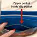 • Inside, a neatly organized lining with one slip pocket (which includes credit card slots) and one zipper pocket.