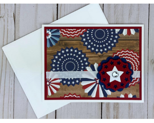 A 4th of July card making kit with cardstock, quilt scrapbook paper, stamped sentiments and mats, ribbons and cards and envelopes.