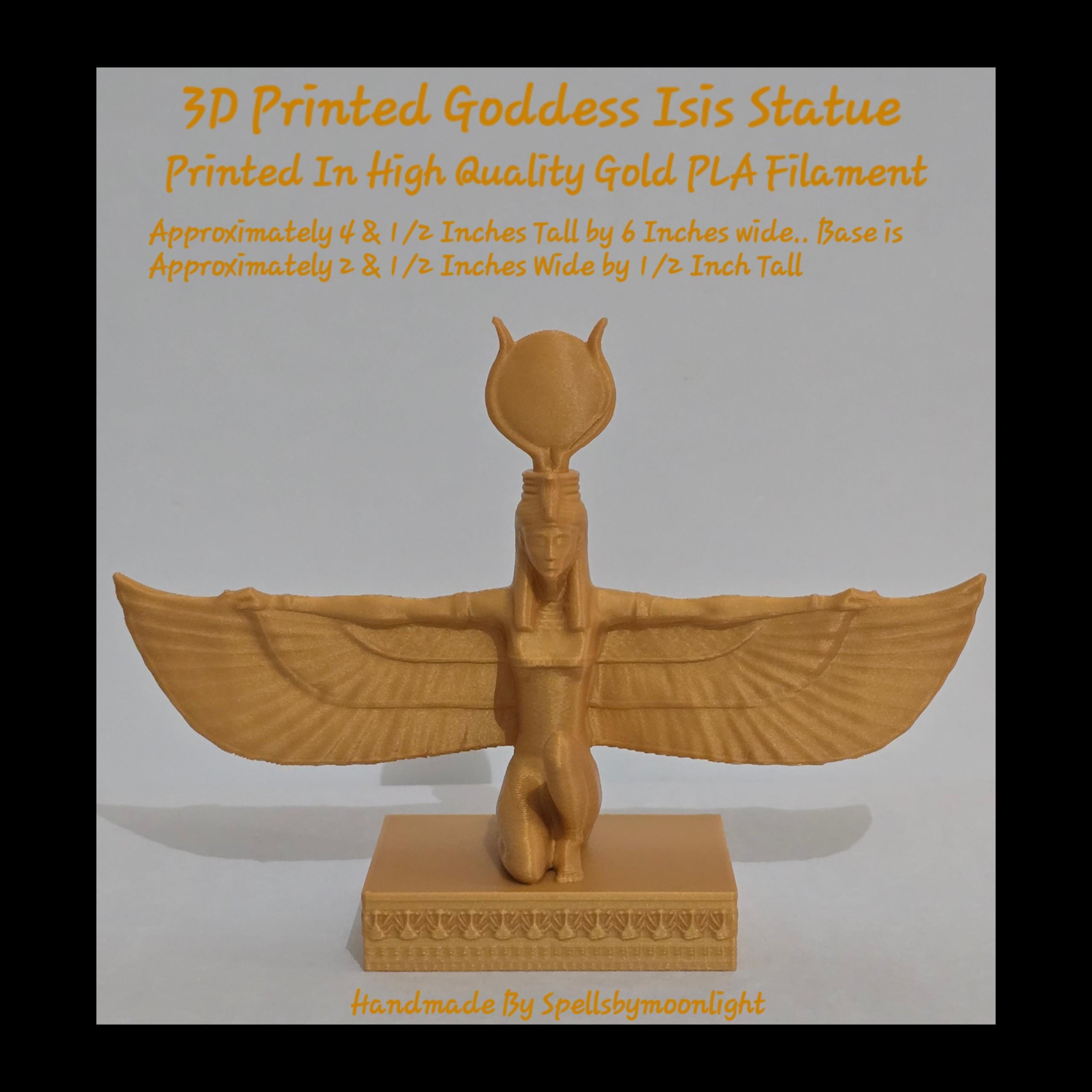 This listing is for One 3D Printed Egyptian Goddess Isis Statue in the color Gold. The Statues are not painted, they are Printed in High Quality PLA so you don't have to worry about paint chipping, peeling, or rubbing off! Please note that colors may differ slightly from how it appears on your screen due to varying monitor/Phone settings. The Statue is Approximately 4 & I/2 Inches Tall by 6 Inches wide.. Base is Approximately 2 & 1/2 Inches Wide by 1 /2 Inch Tall. If you hold the Statue close to your face you can see very minimal lines produced by the 3D Printer. At a normal distance they aren't very noticeable! The lines are minimal in appearance because I have a high end 3D Printer! These Statues are perfect for Your Alter, as an offering to Goddess Isis, and also make great gifts!