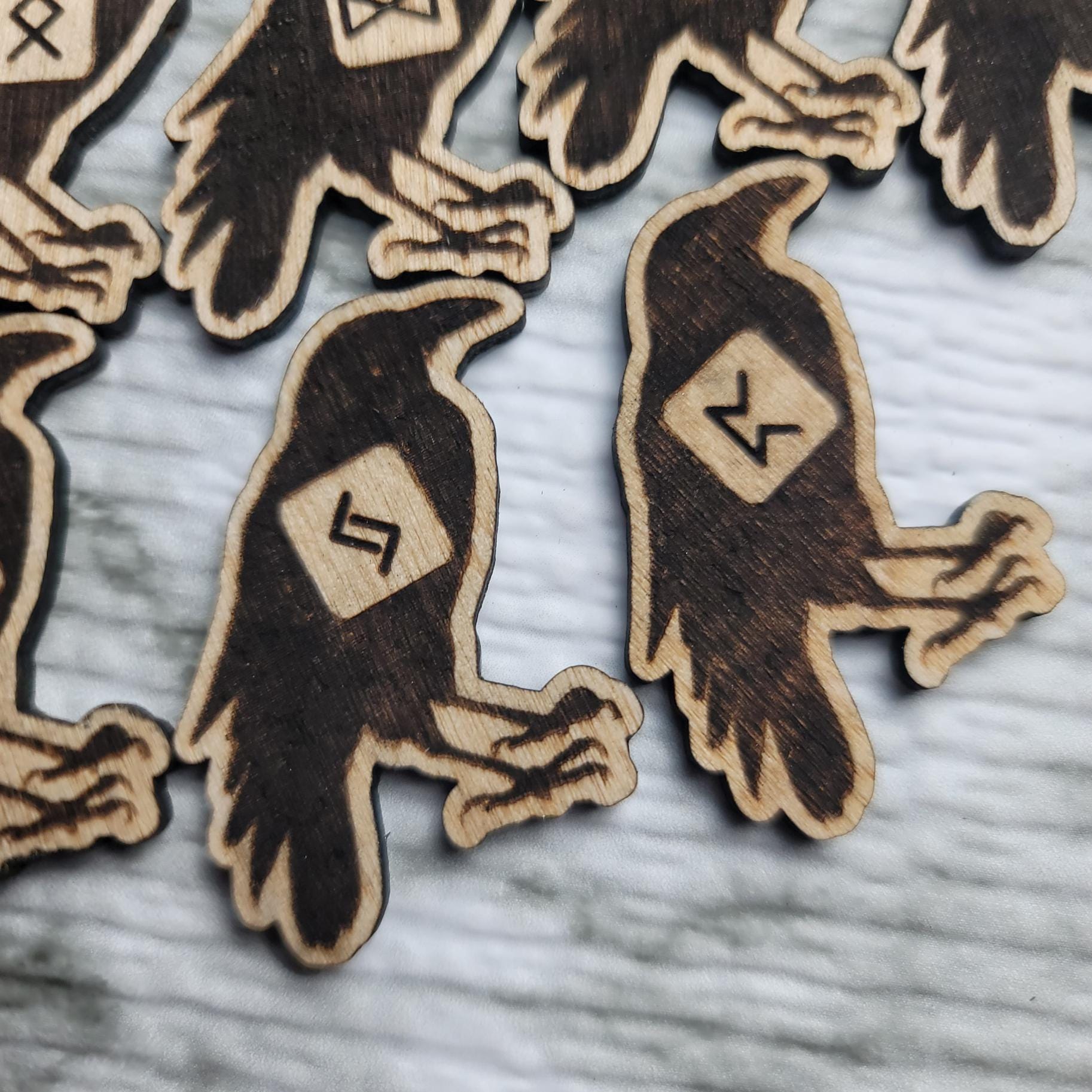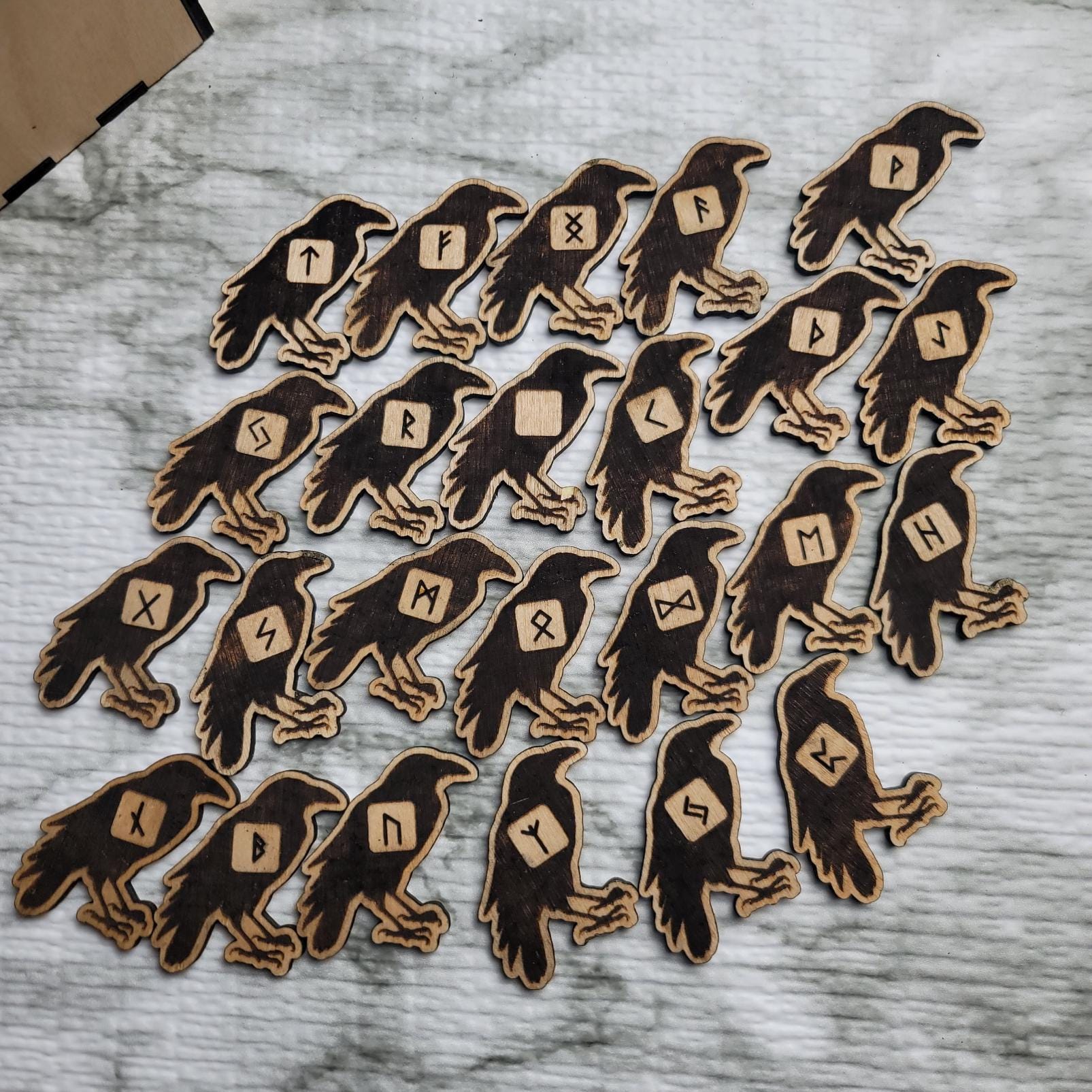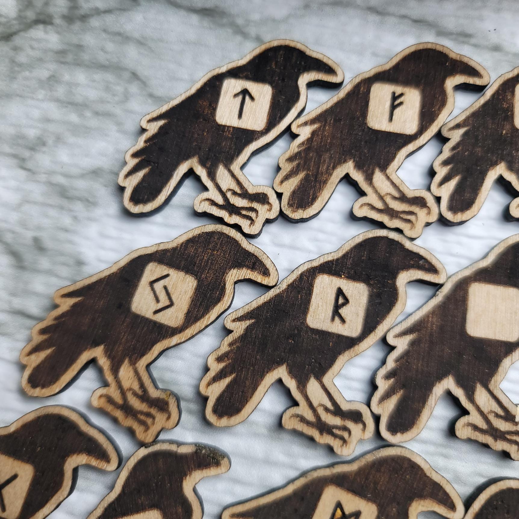 Unlock the mysteries of the ancient Norse with this handcrafted Elder Futhark rune set, laser engraved on 3mm Baltic birch plywood. Each rune is cut in the shape of a raven—Odin’s sacred messenger—symbolizing wisdom, magic, and connection to the divine.