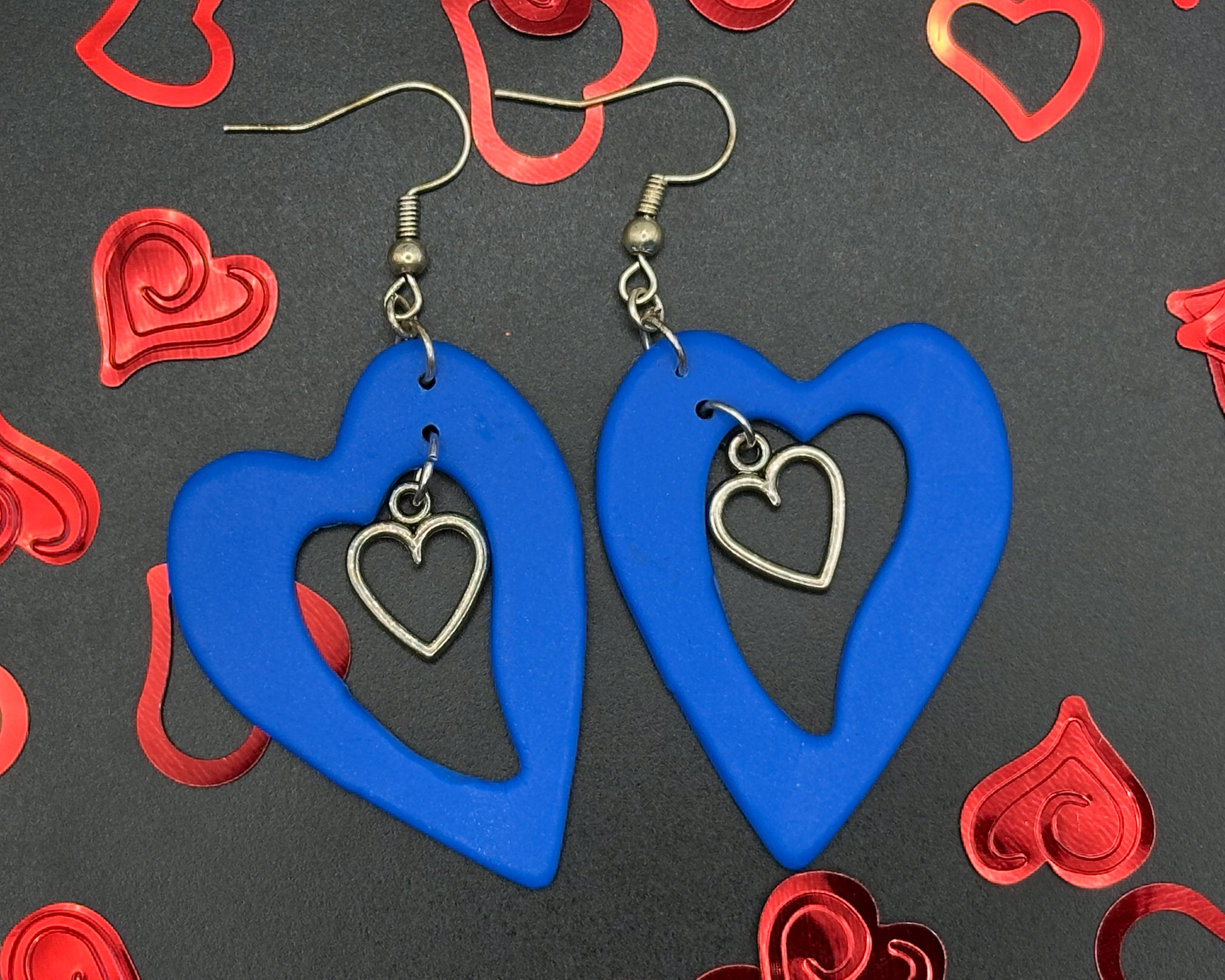 Bright blue hearts with a metallic charm inside—these earrings are bold, modern, and totally eye-catching!