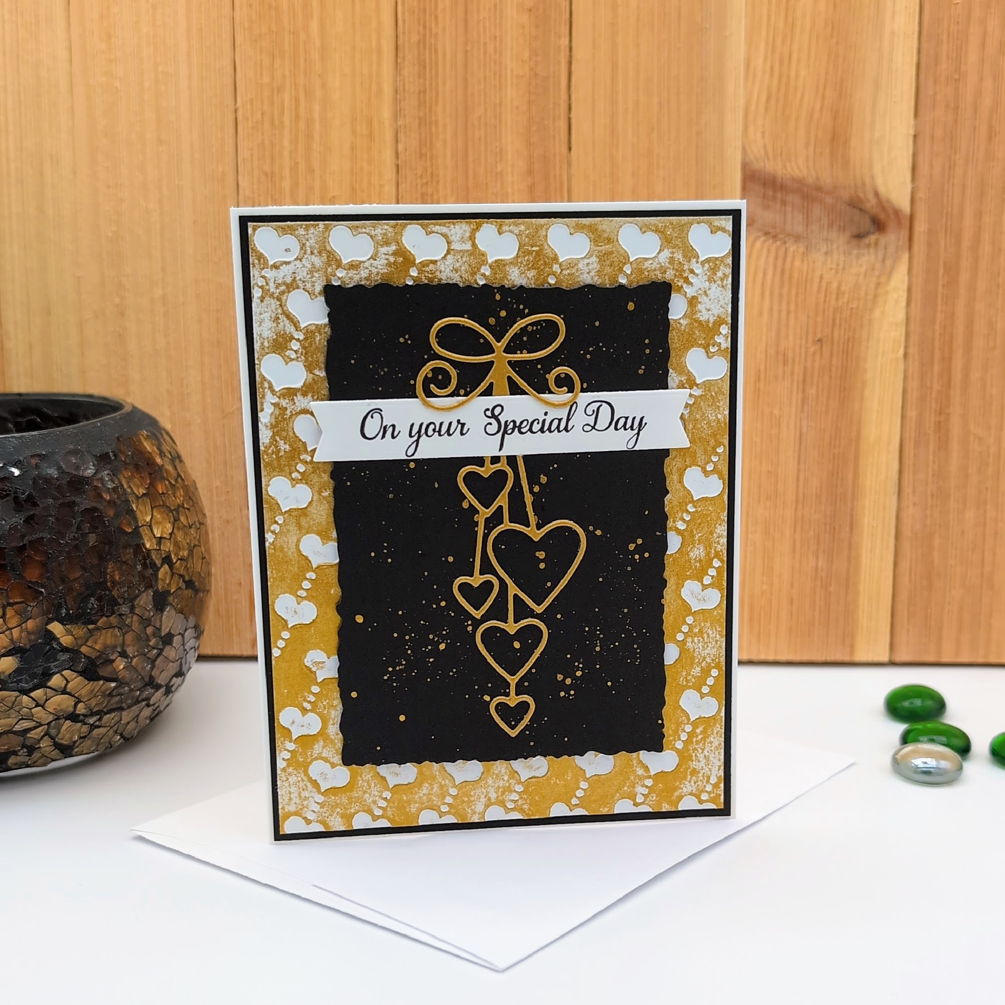 Celebrate life’s meaningful moments with this handcrafted card featuring a black panel adorned with gold hanging hearts and a ribbon motif. The message “On your Special Day” appears in elegant script across a white banner, framed by a golden border with white heart accents. Blank inside for your personal message, this card is perfect for weddings, anniversaries, birthdays, or any heartfelt celebration. A stylish, versatile design that adds warmth and elegance to any occasion.
