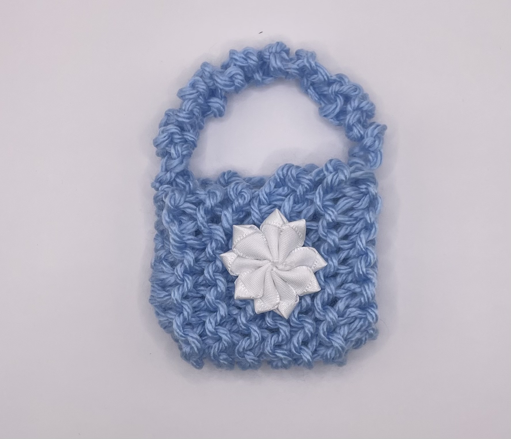 First, I always choose a yarn color that “speaks to me.” Next comes hand knitting the base of the bag followed by adding a strap - also hand knitted. The last step (my favorite) is adding the embellishment! Through the process I imagine the child receiving this doll accessory. That always puts a big smile on my face. A perfect stocking stuffer. Enjoy❣️