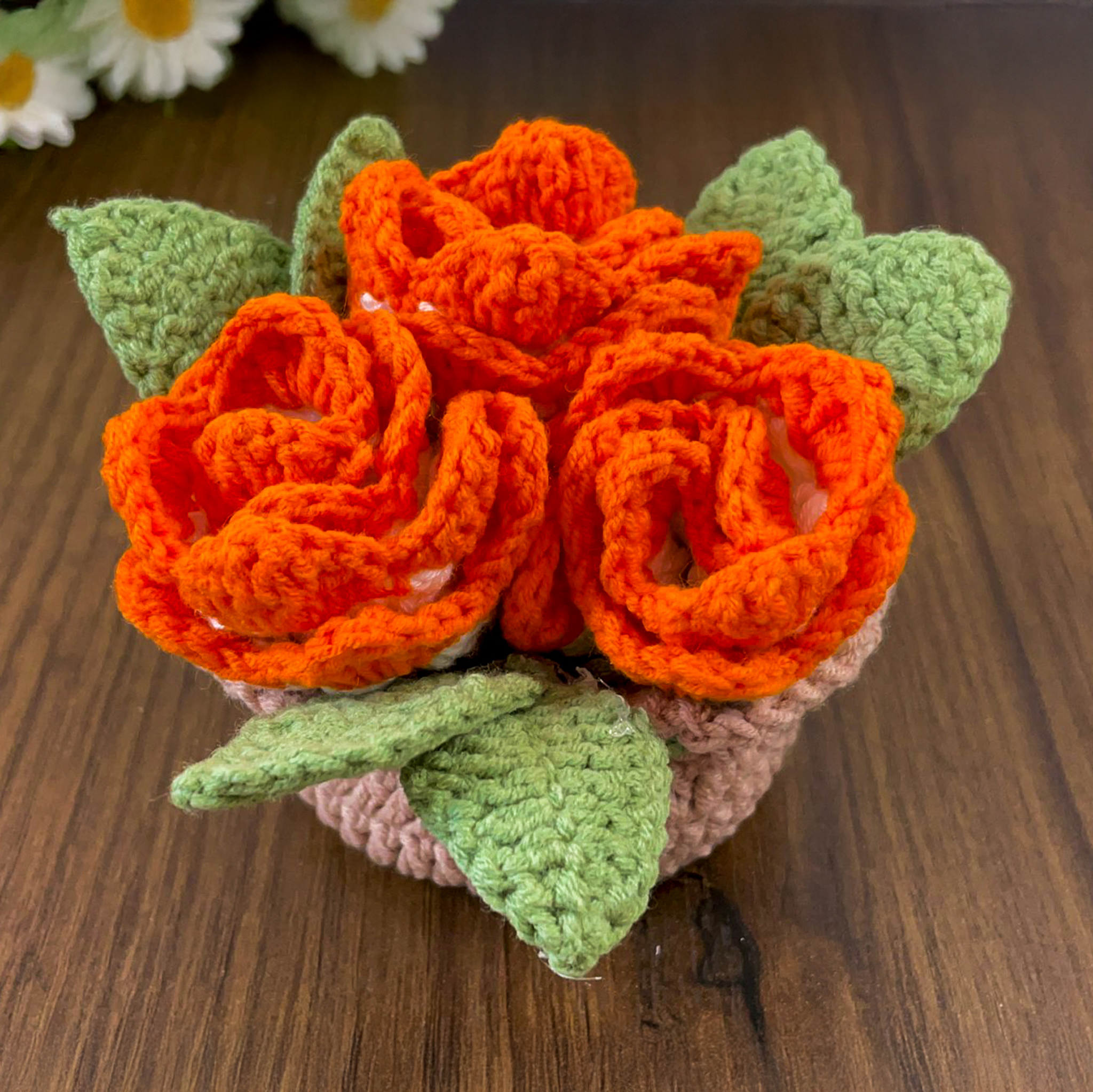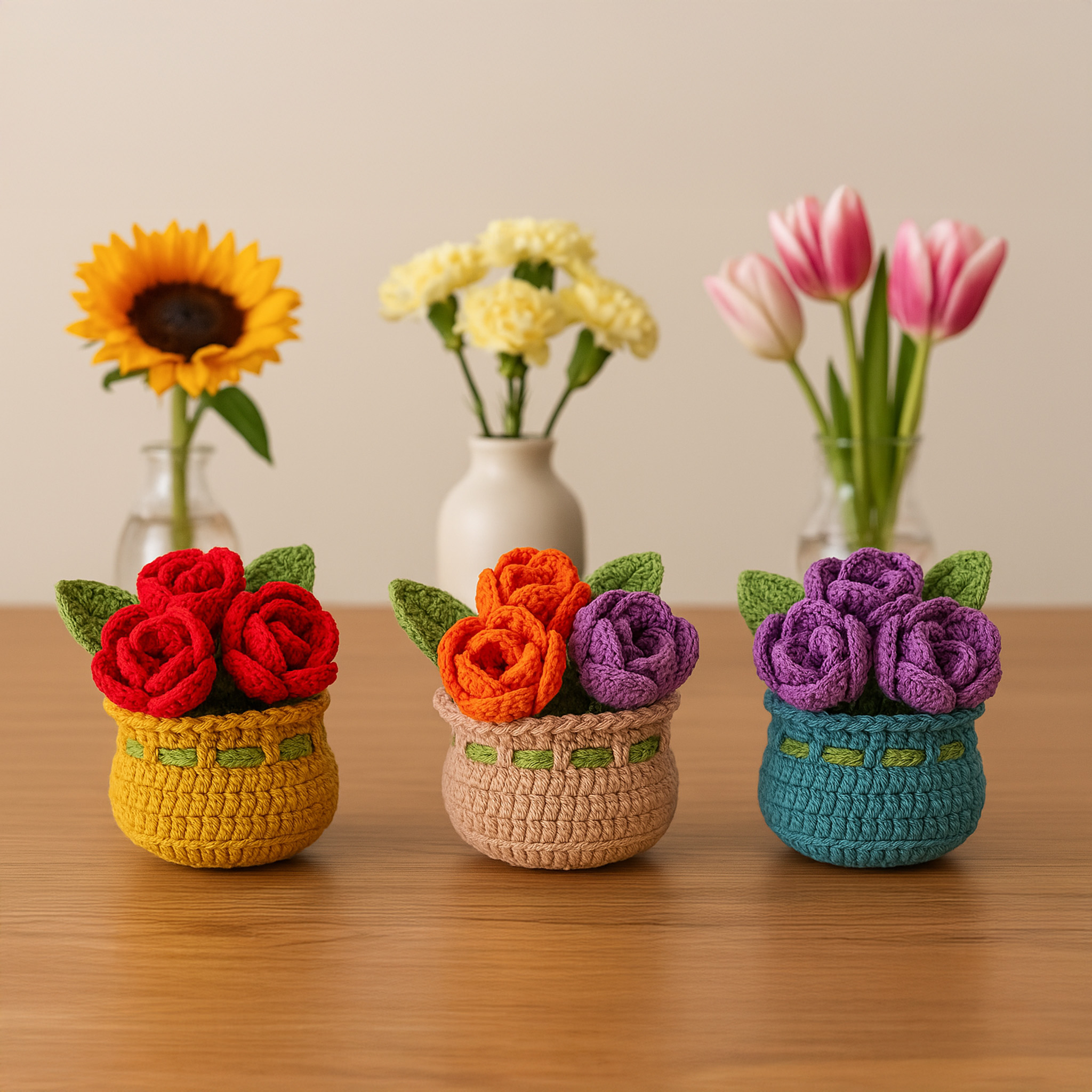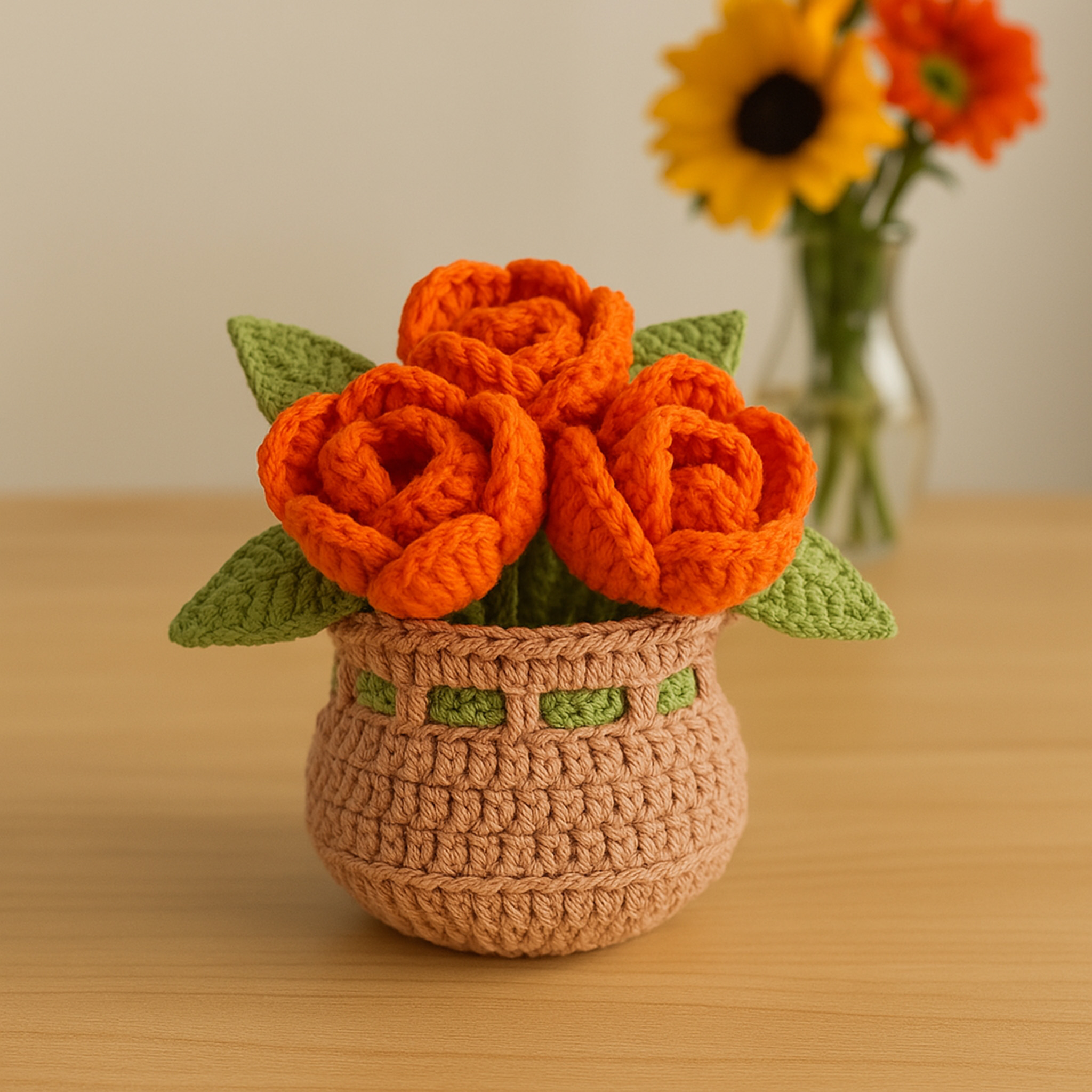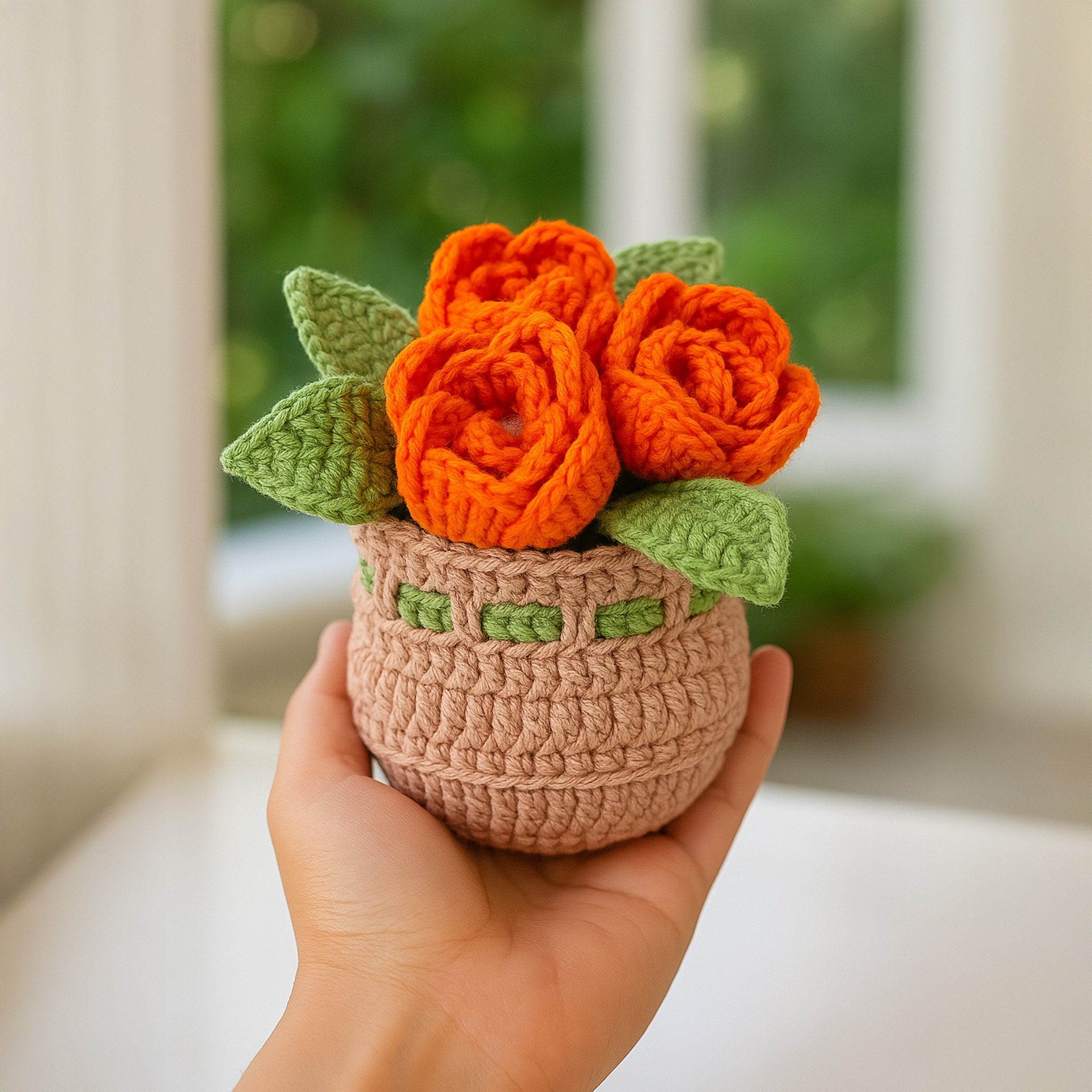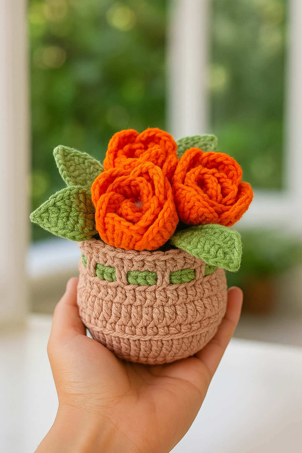 Bring timeless floral beauty into your handmade projects with this Elegant Rose Pot Crochet Pattern. This design features three beautifully layered 3D crochet roses nestled inside a textured flower pot, finished with delicate leaves and decorative details. The result is a charming crochet flower basket that adds warmth and elegance to any space.