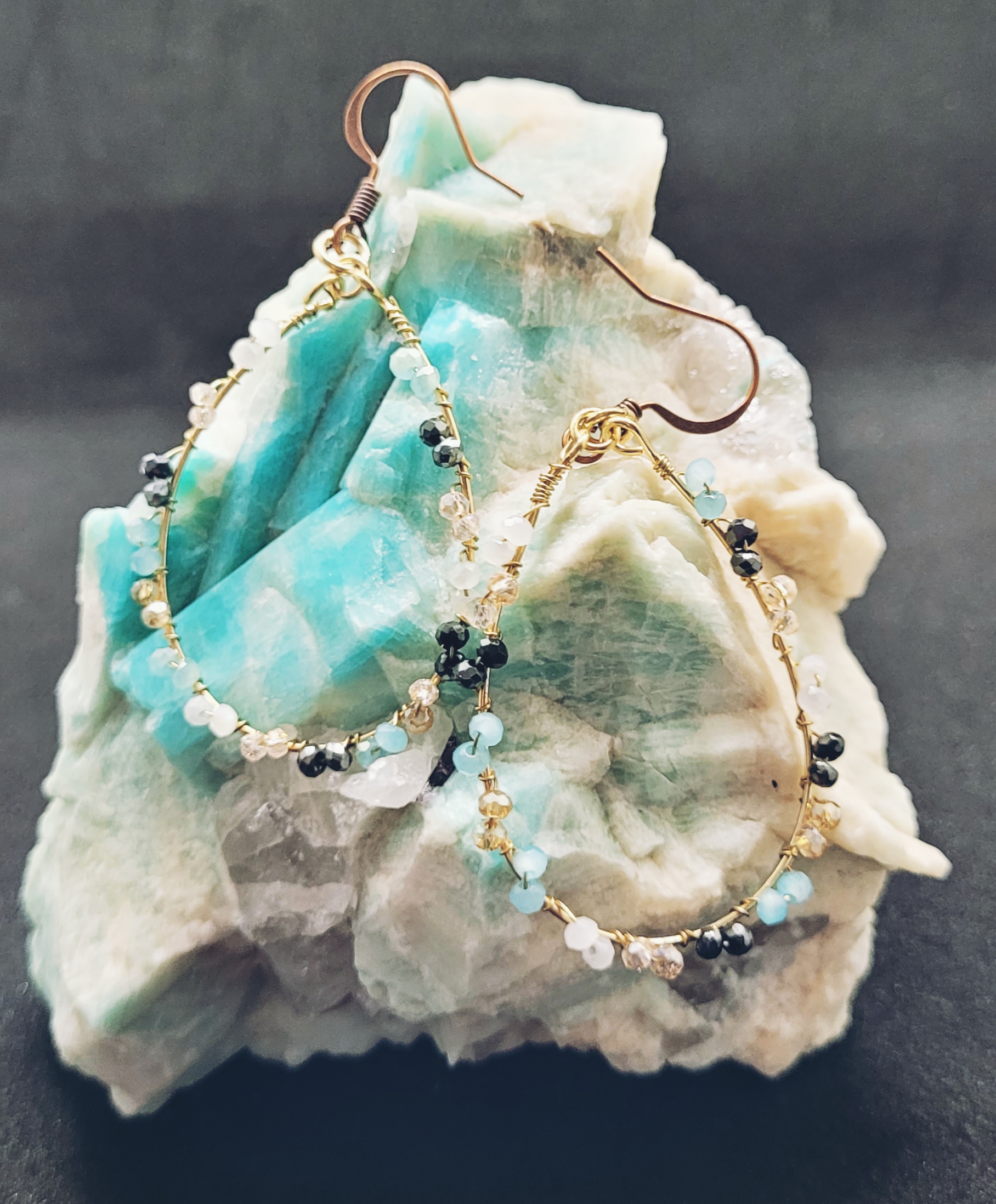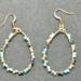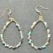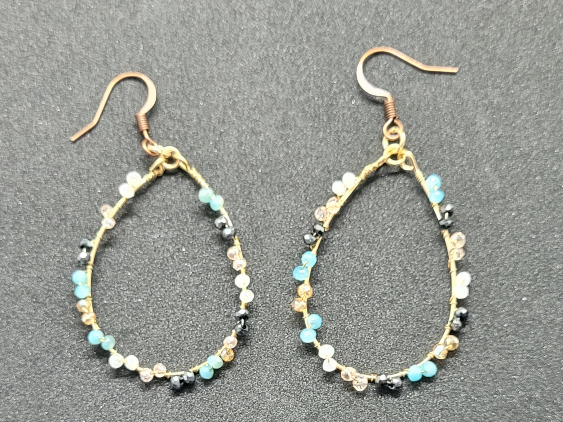 These elegant earrings feature a tear-drop shape design with a gold tone wire frame. They are adorned with a mix of colorful beads, including, turquoise, black, white and clear, adding a vibrant yet sophisticated touch.