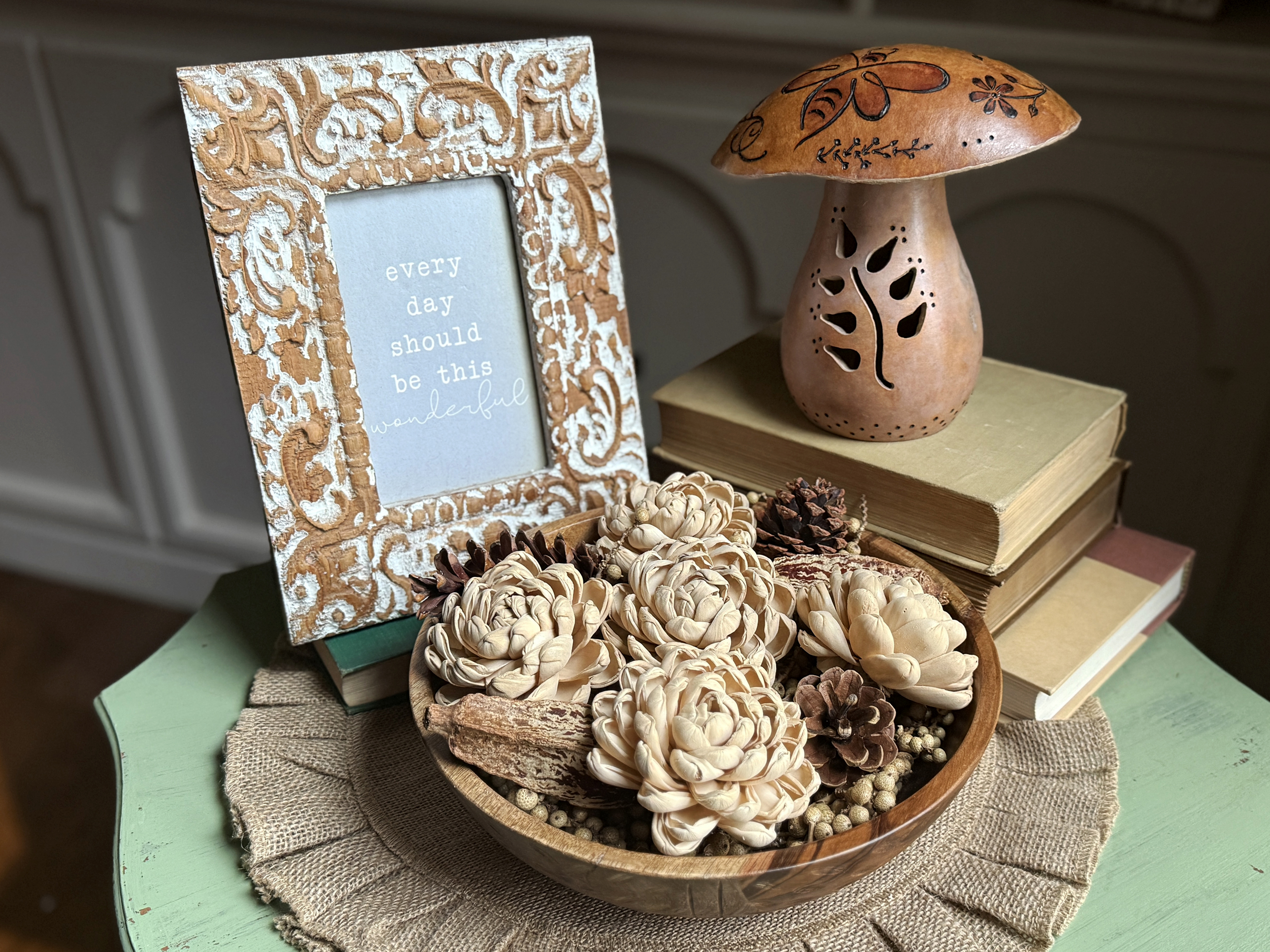 Shown styled in a wooden dough bowl with pinecones, seed pods, and earthy botanicals, these blossoms blend effortlessly into collected, neutral décor. Their creamy beige tone pairs beautifully with wood, burlap, antique books, and rustic textures—making them ideal for farmhouse, cottage, and modern organic interiors.