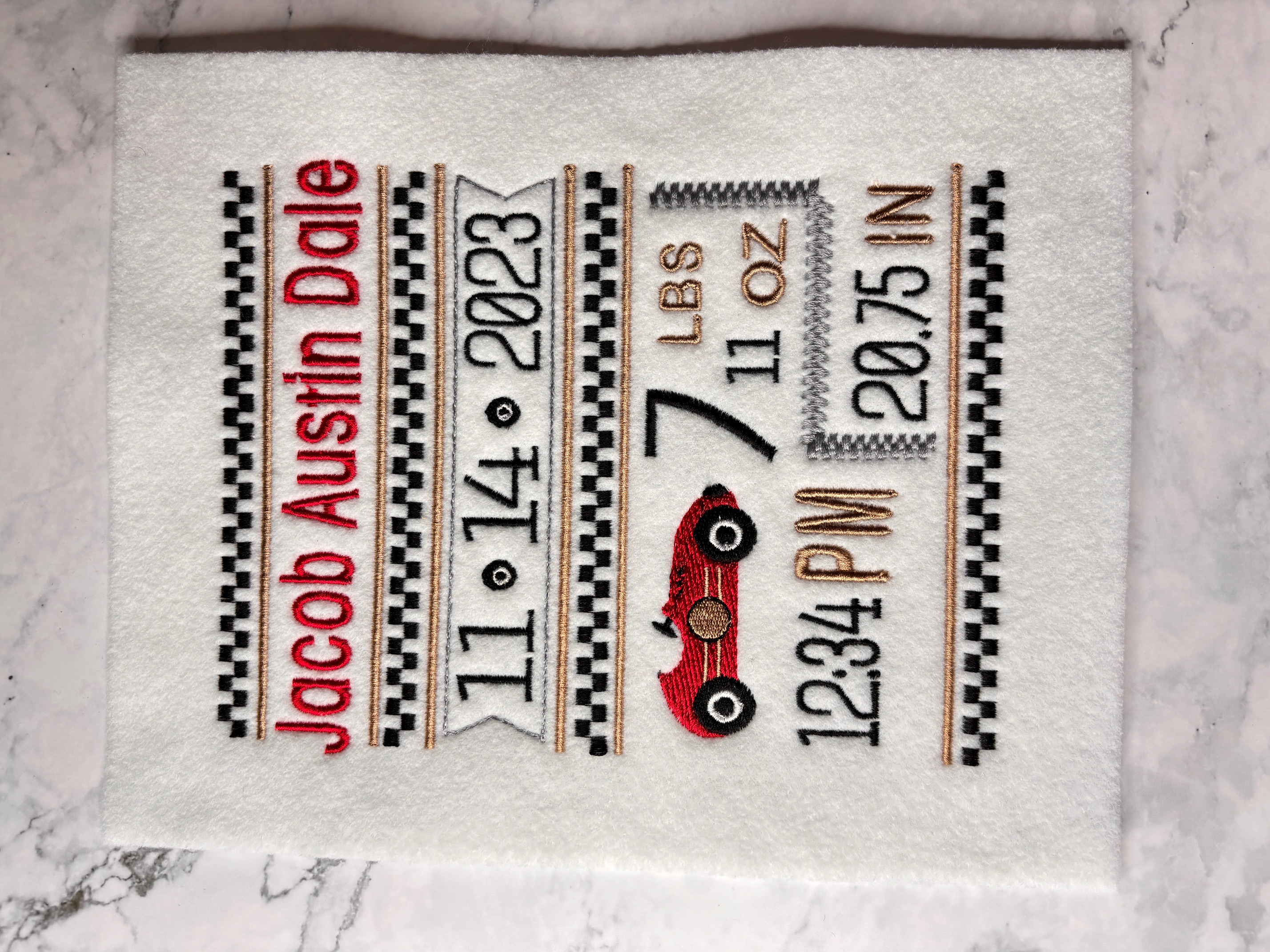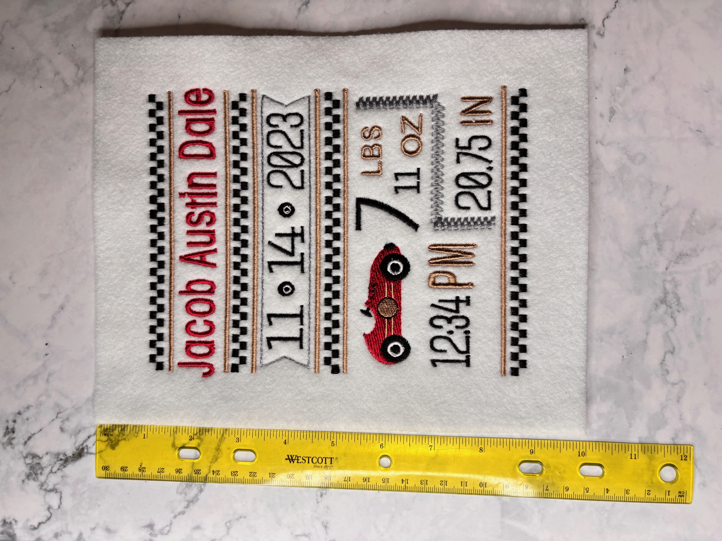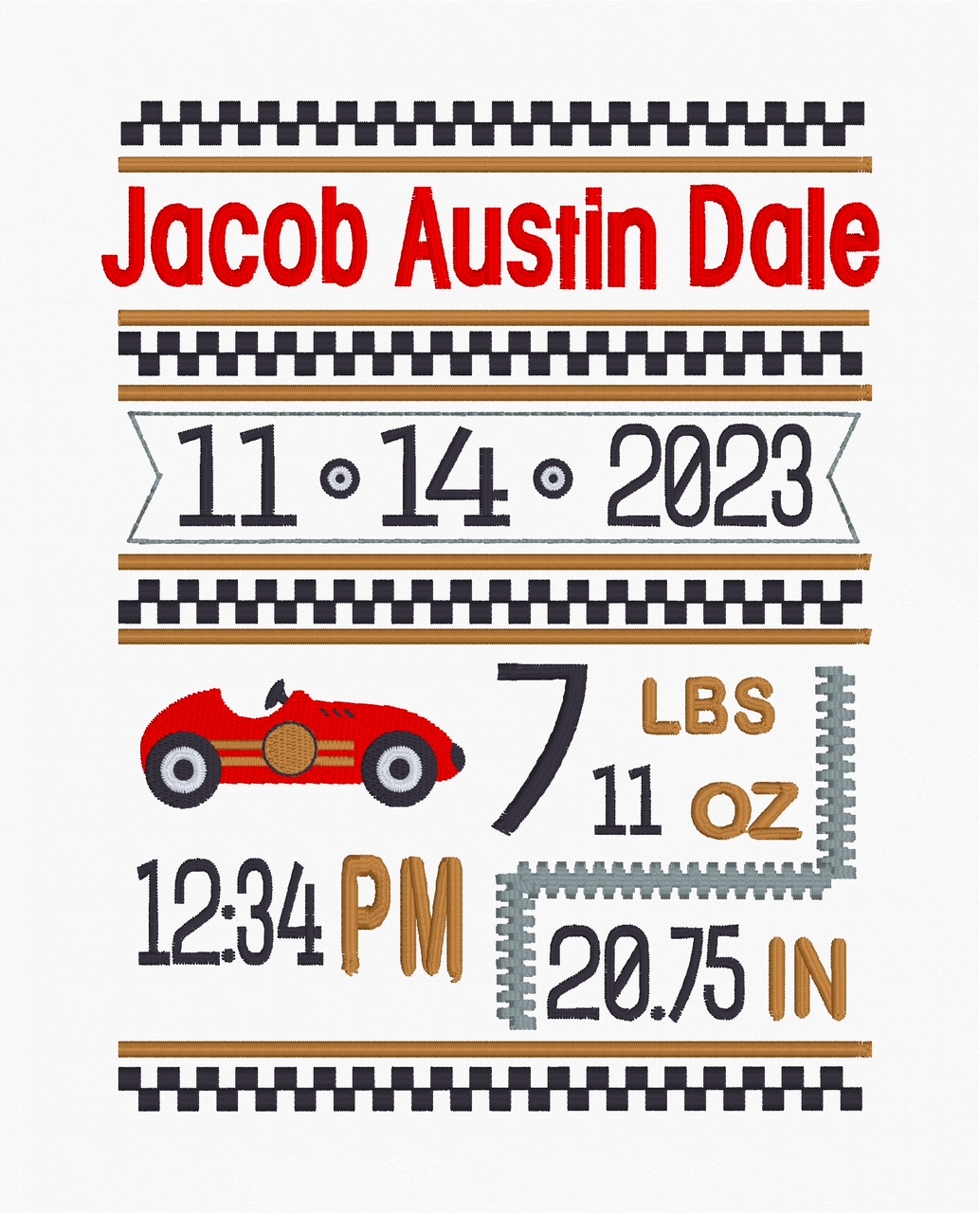 Custom Embroidered Birth Announcement – Perfect addition to any nursery. Embroidered Racecar Birth Announcement, Newborn Keepsake, Baby Statistics